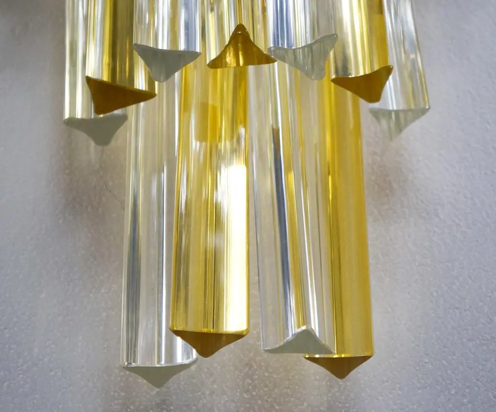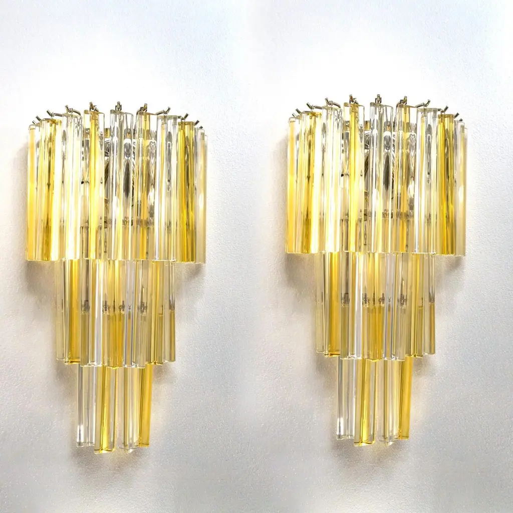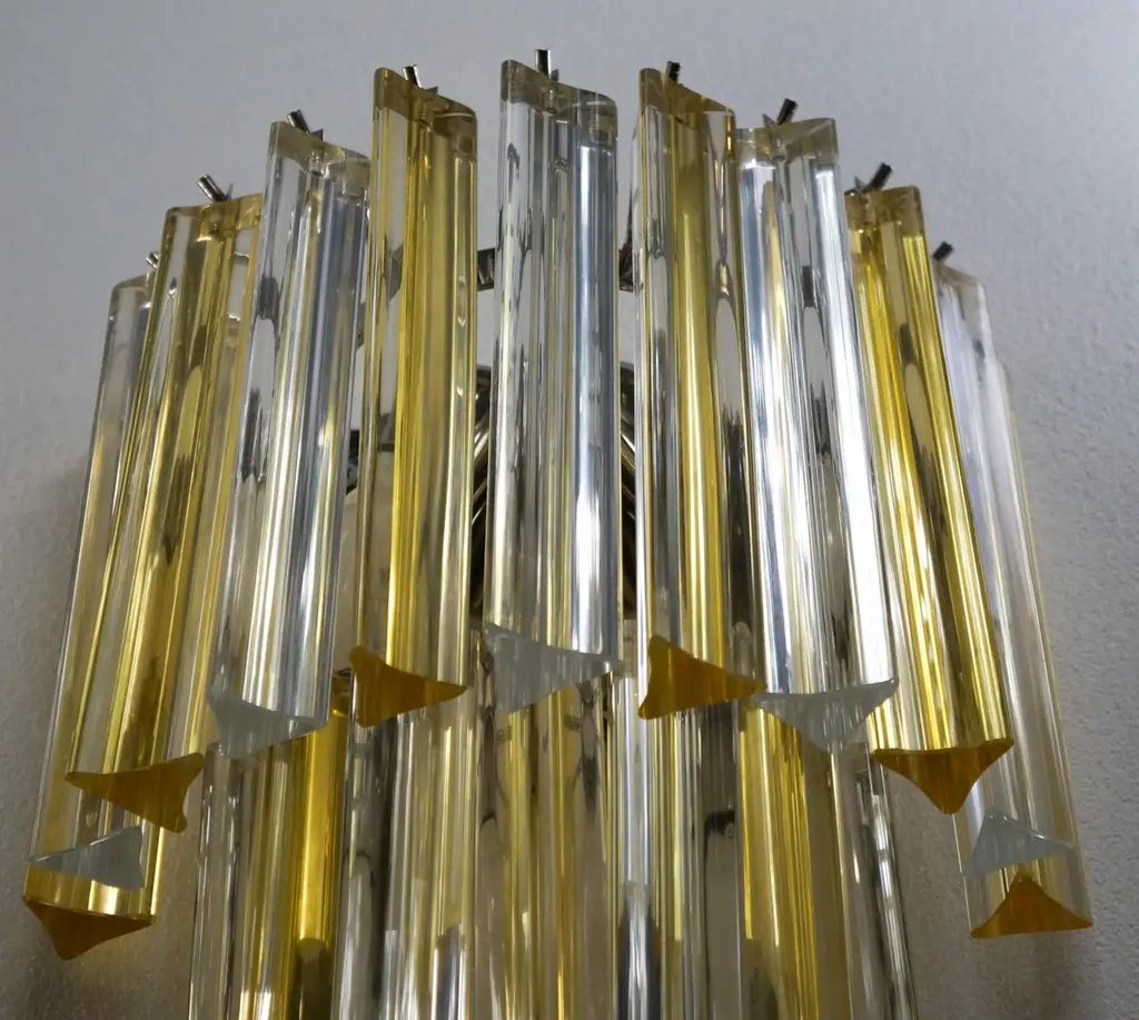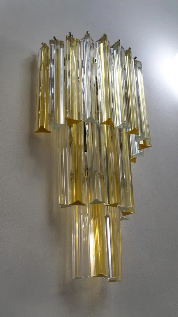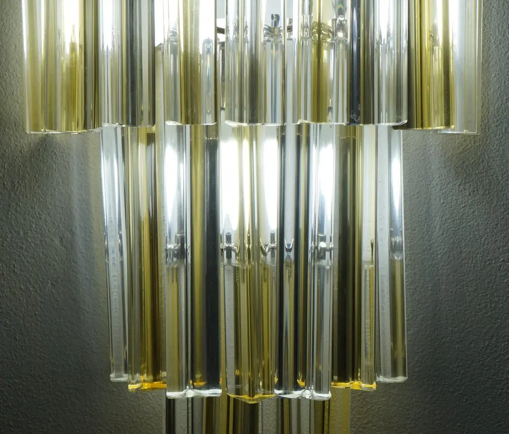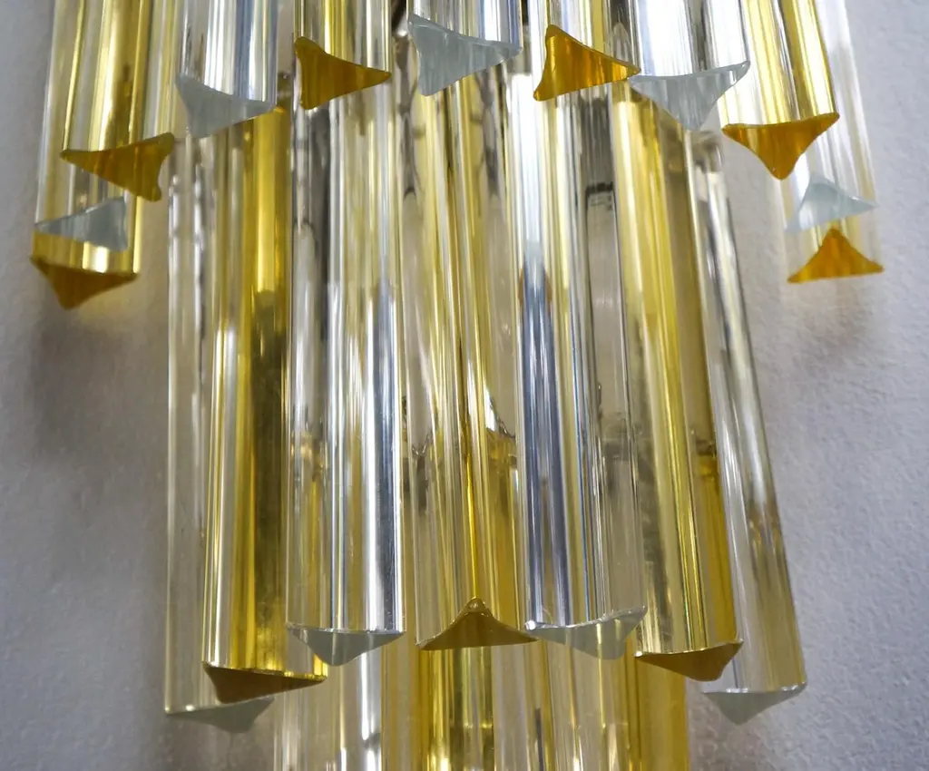 This applique was designed in 1981 and was later attributed to Venini. Composed of three levels of glass elements called "Triedri", the applique has 22 elements, which alternate with shades of amber and crystal, illuminated by three light bulbs.The price of the item includes professional and tailored packing.Sconces can be re wired for your country code.