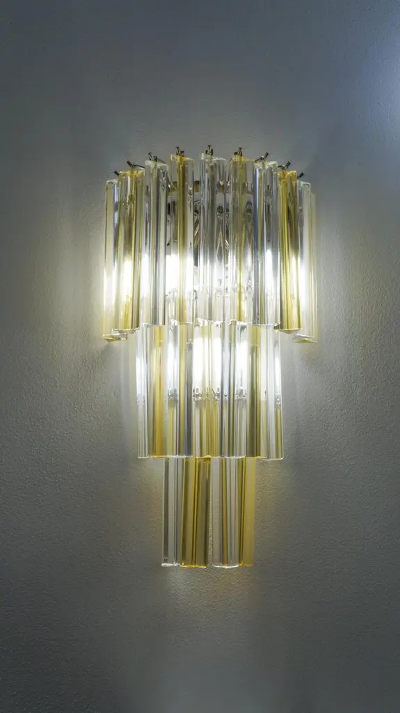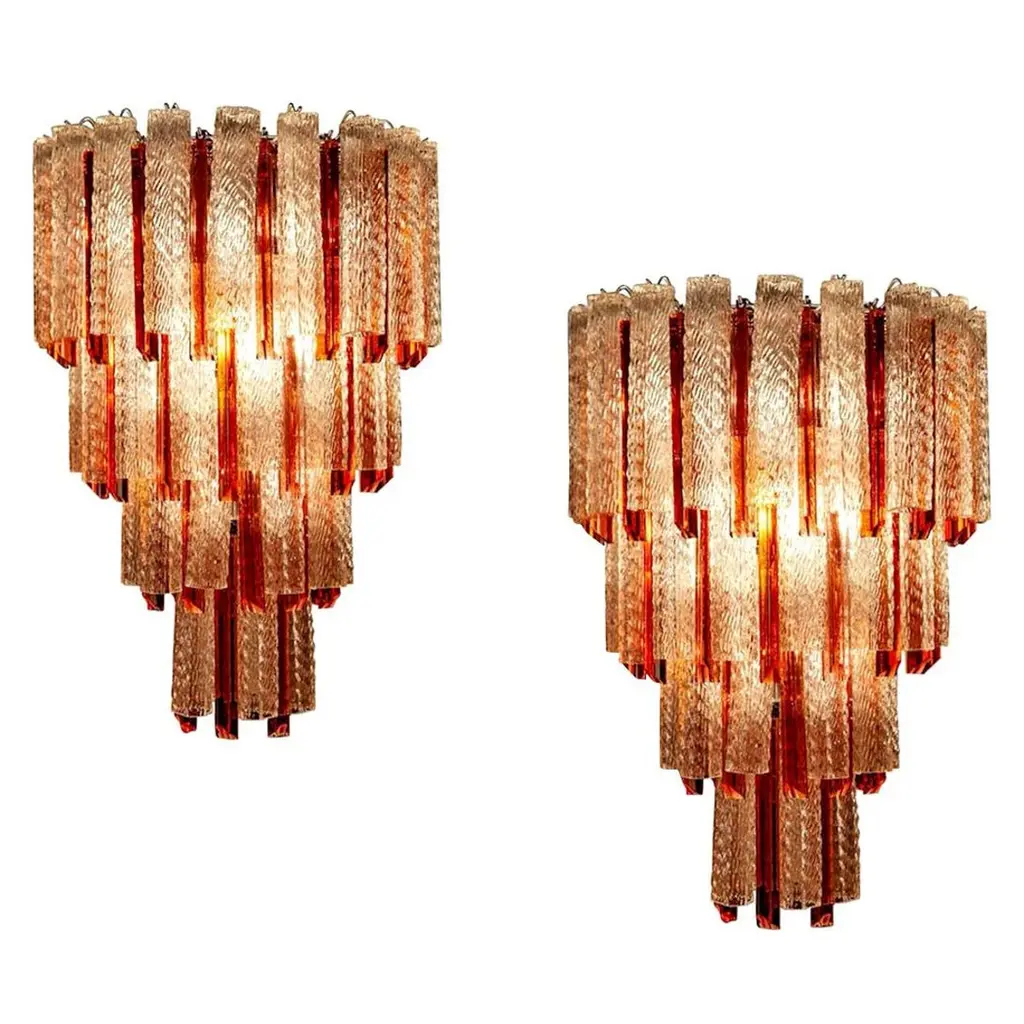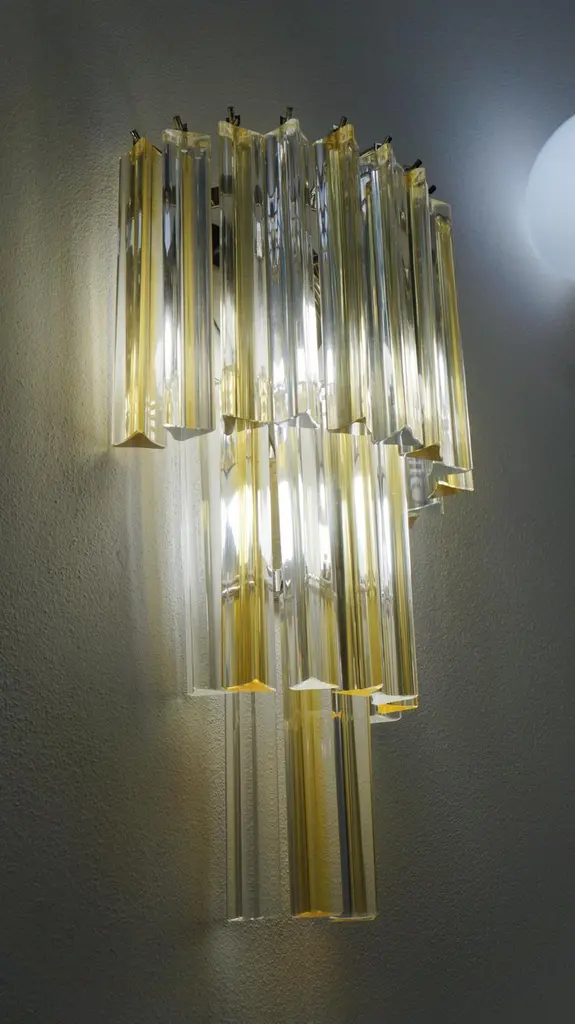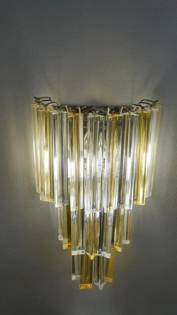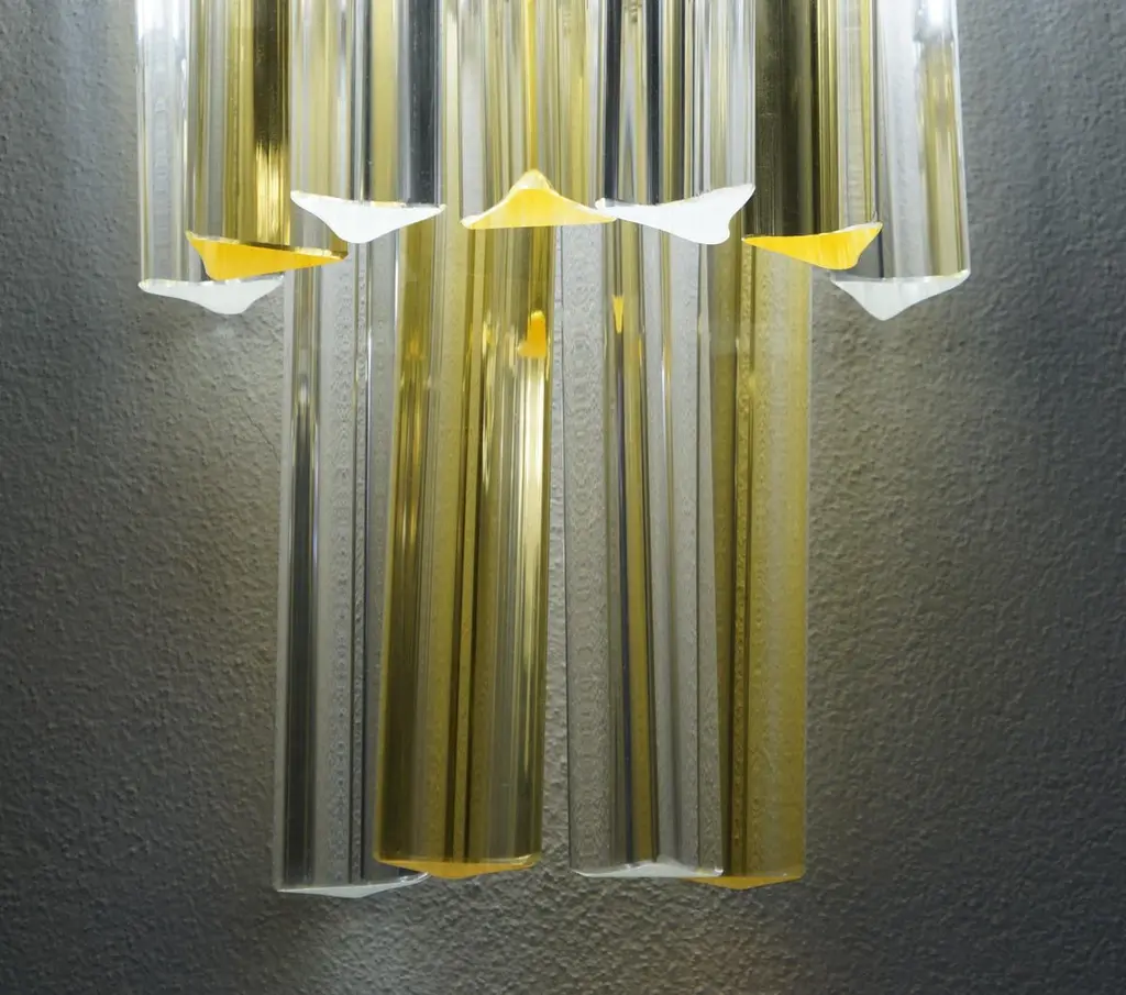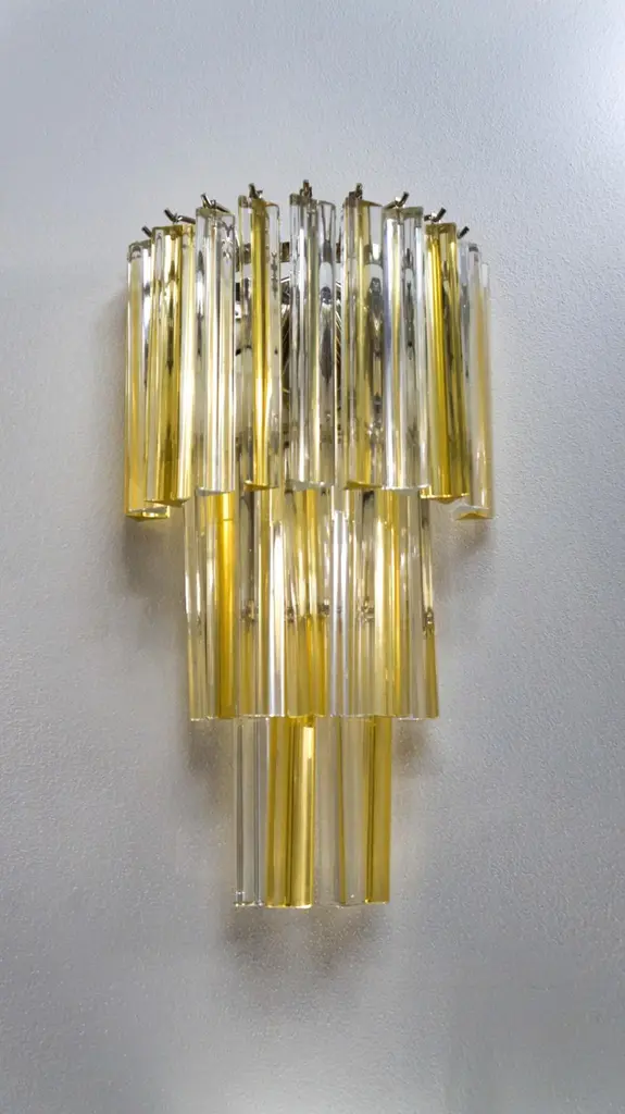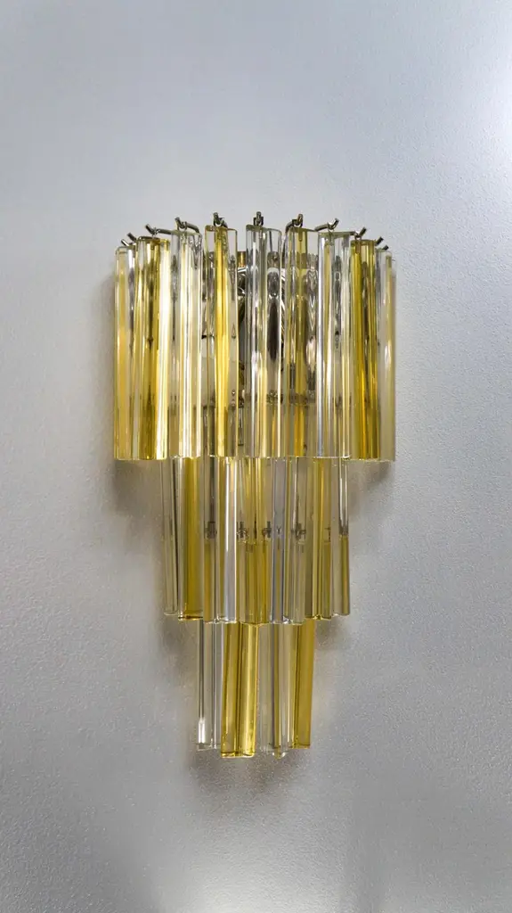 This applique was designed in 1981 and was later attributed to Venini. Composed of three levels of glass elements called "Triedri", the applique has 22 elements, which alternate with shades of amber and crystal, illuminated by three light bulbs.The price of the item includes professional and tailored packing.Sconces can be re wired for your country code.