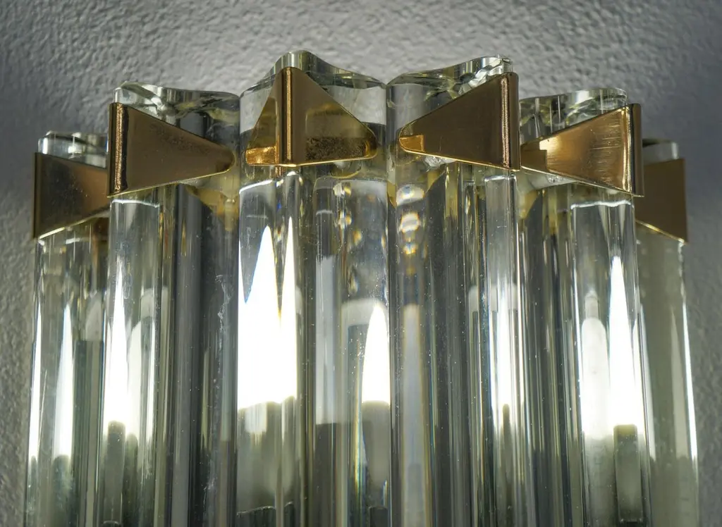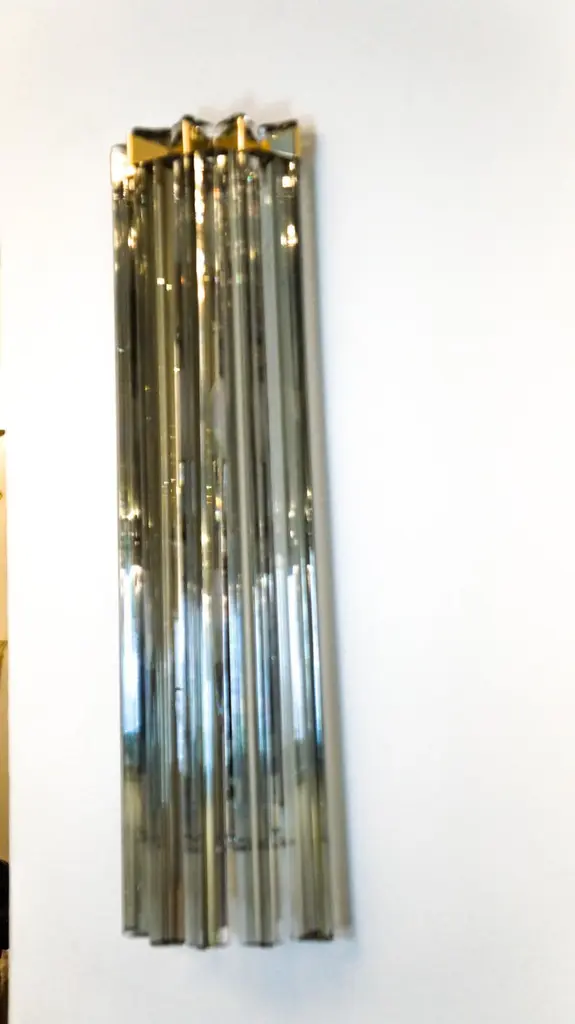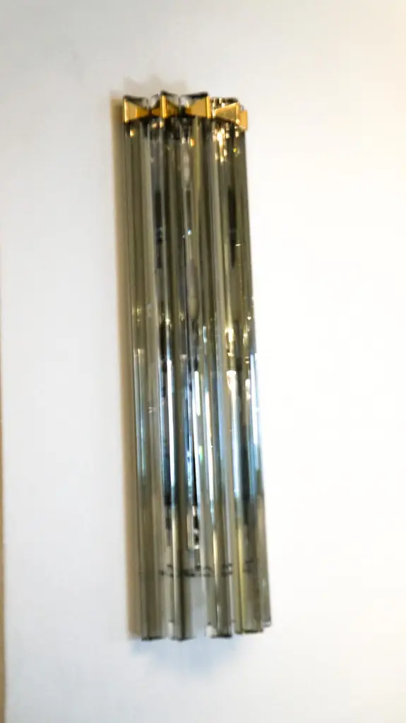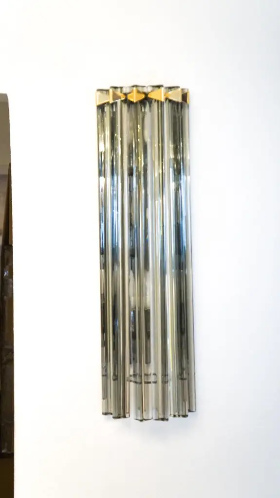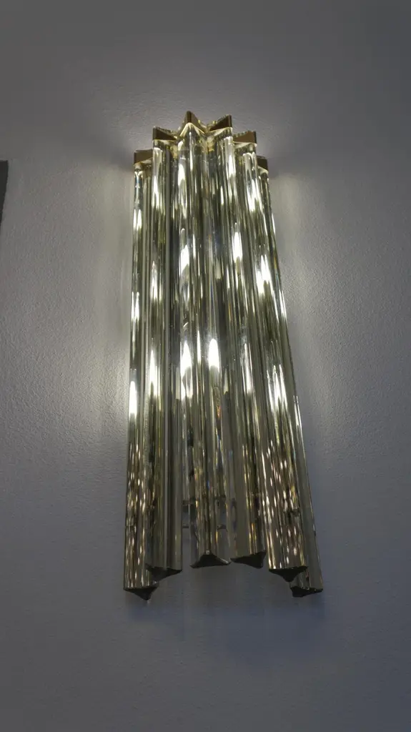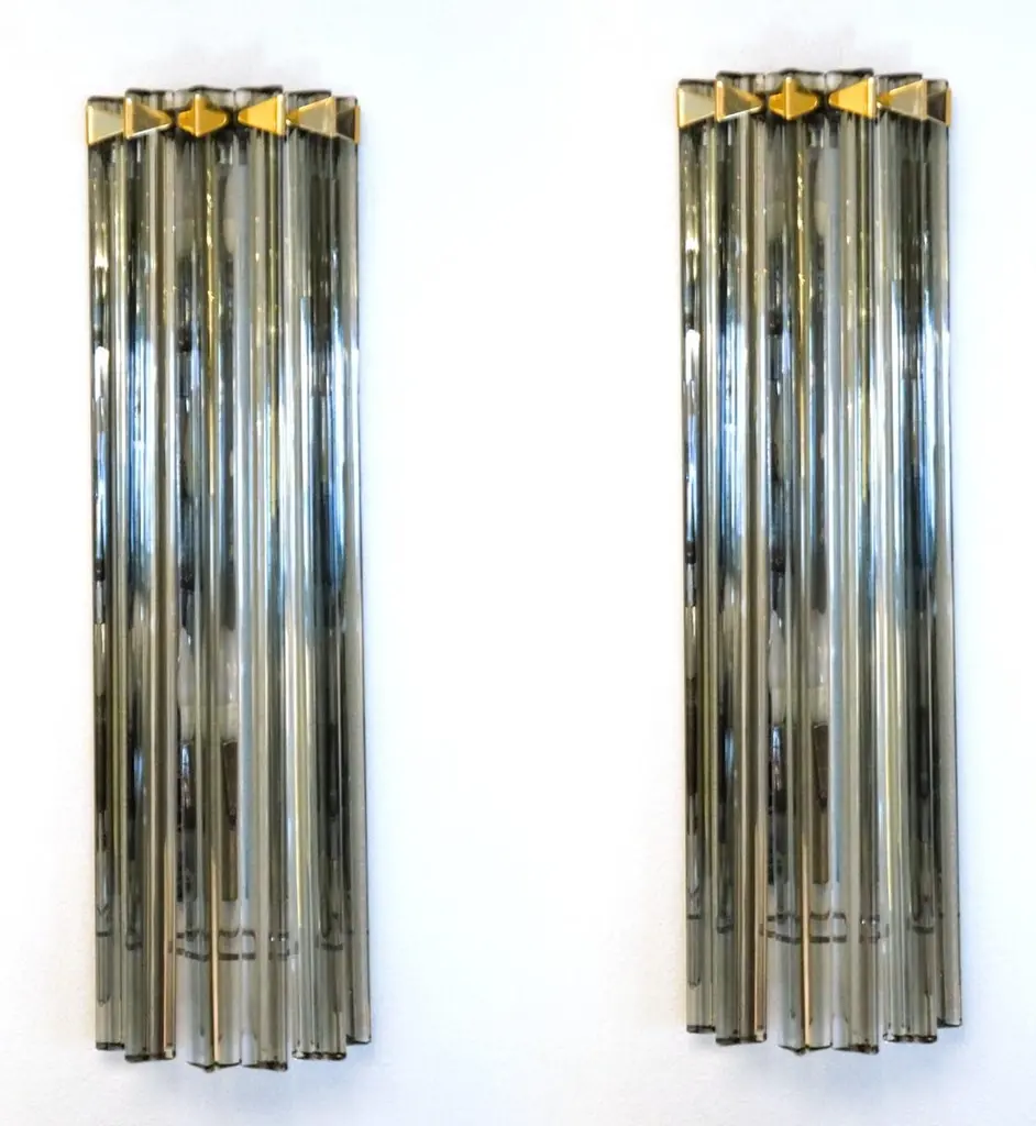 A very simple but certainly effective applique is the one that you see in the picture. Designed in 1992 and later attributed to Venini, this applique is composed of six glass elements called Triedri that are crossed (when lighted) by a very delicate light of two bulbs inside. It rests on a gold frame that brings out the gray color of the glass.The price of the item includes professional and tailored packing.Sconces can be re wired for your country code.