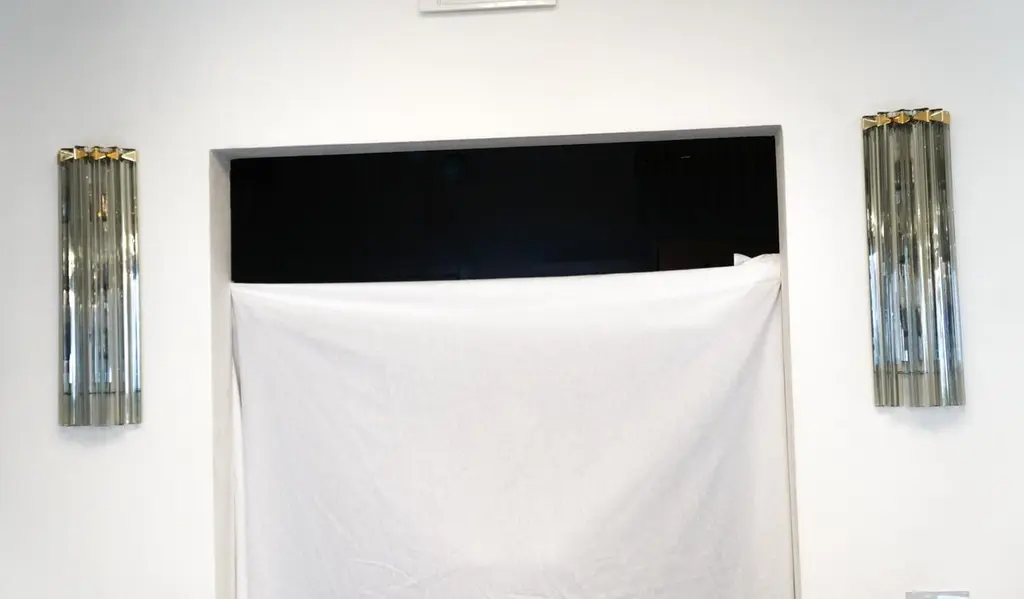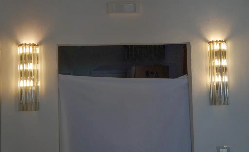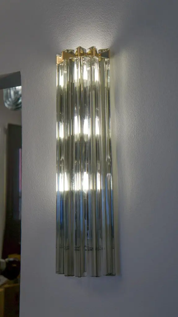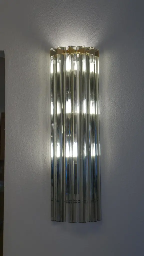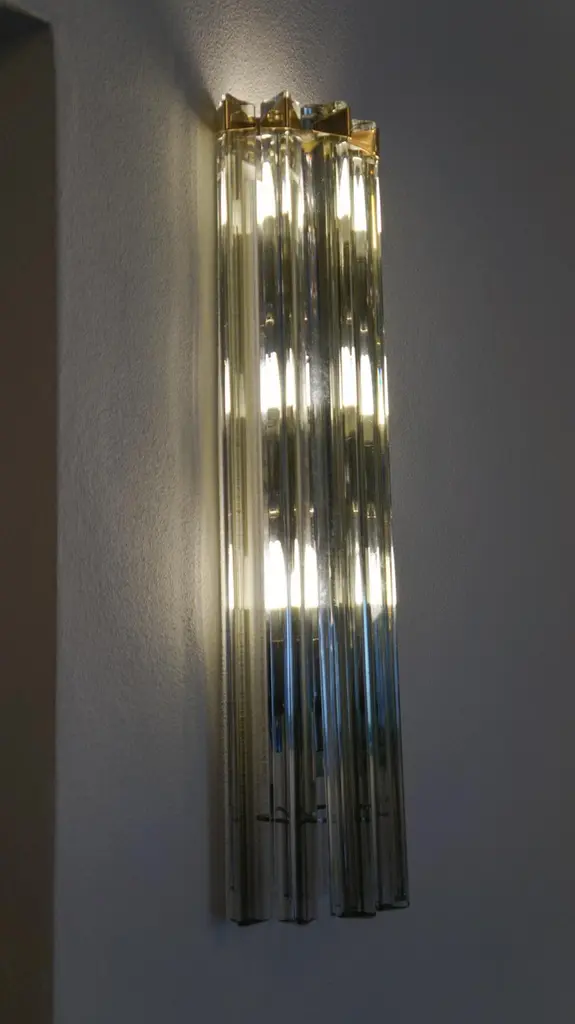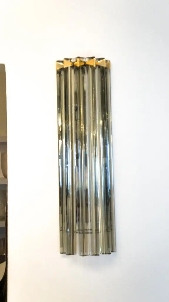 A very simple but certainly effective applique is the one that you see in the picture. Designed in 1992 and later attributed to Venini, this applique is composed of six glass elements called Triedri that are crossed (when lighted) by a very delicate light of two bulbs inside. It rests on a gold frame that brings out the gray color of the glass.The price of the item includes professional and tailored packing.Sconces can be re wired for your country code.