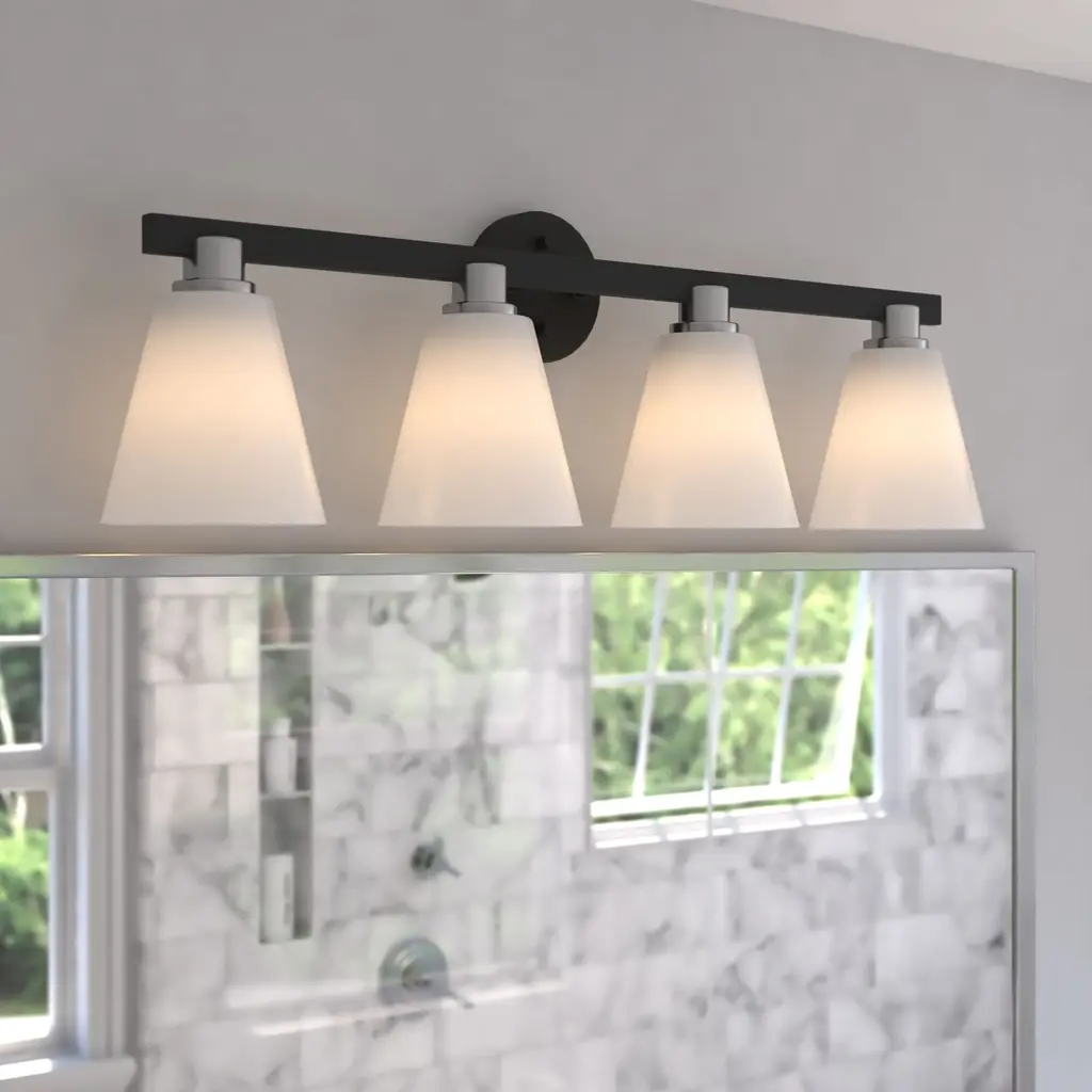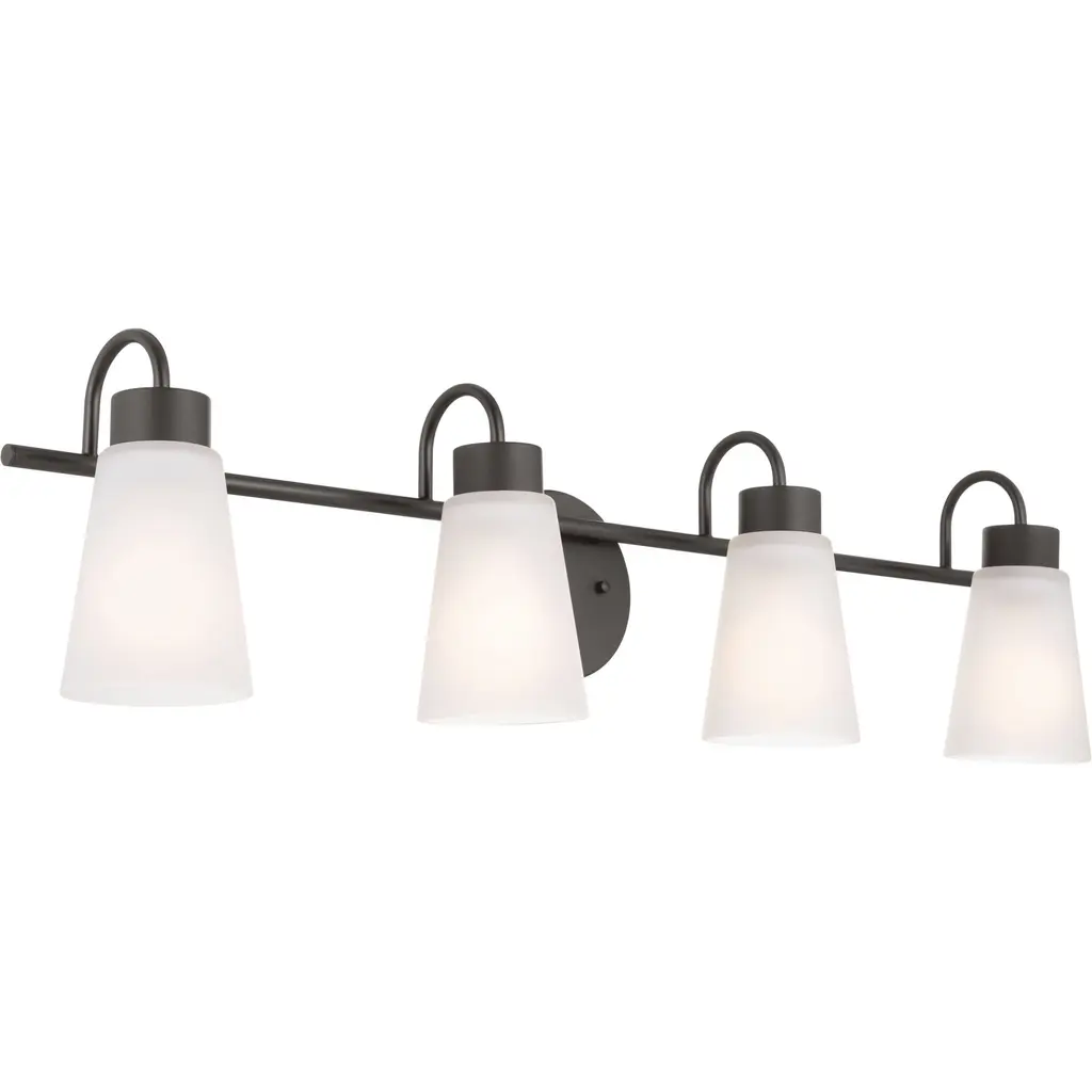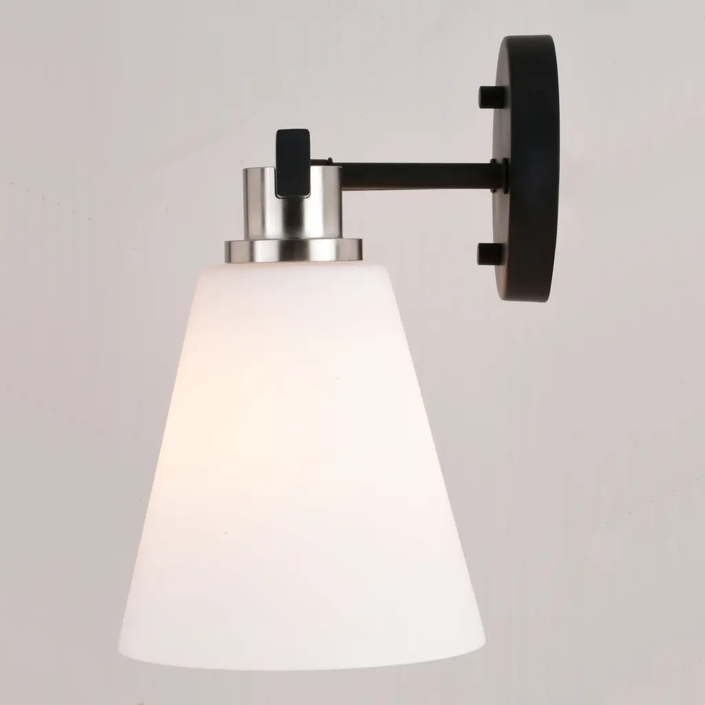 Elegance is exemplified in this collection called Vermont. A simple line of matte black metal acts as a striking backdrop to the etched white glass shades. These generously sized shapes are met with a hint of satin nickel for just the right amount of sheen. Add this understated, but beautiful example of elegance to any trendy bath or other areas of your home.