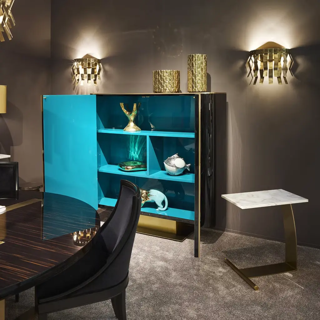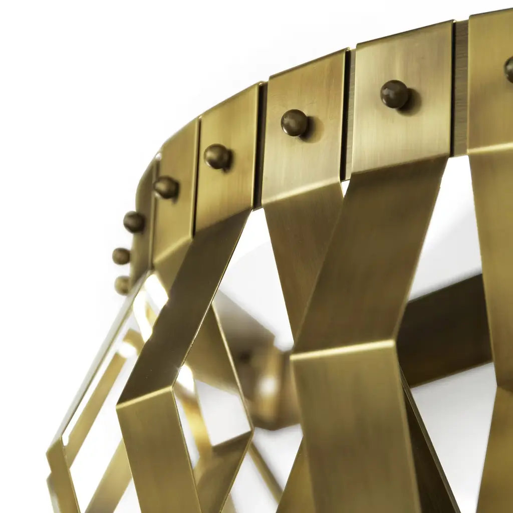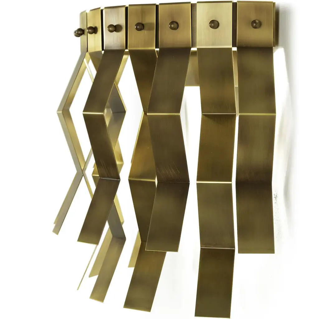 This striking brass sconce, designed by Studio 63 for Marioni, is decorated with geometrical metal accents that run all around its round perimeter and LED strip lighting.