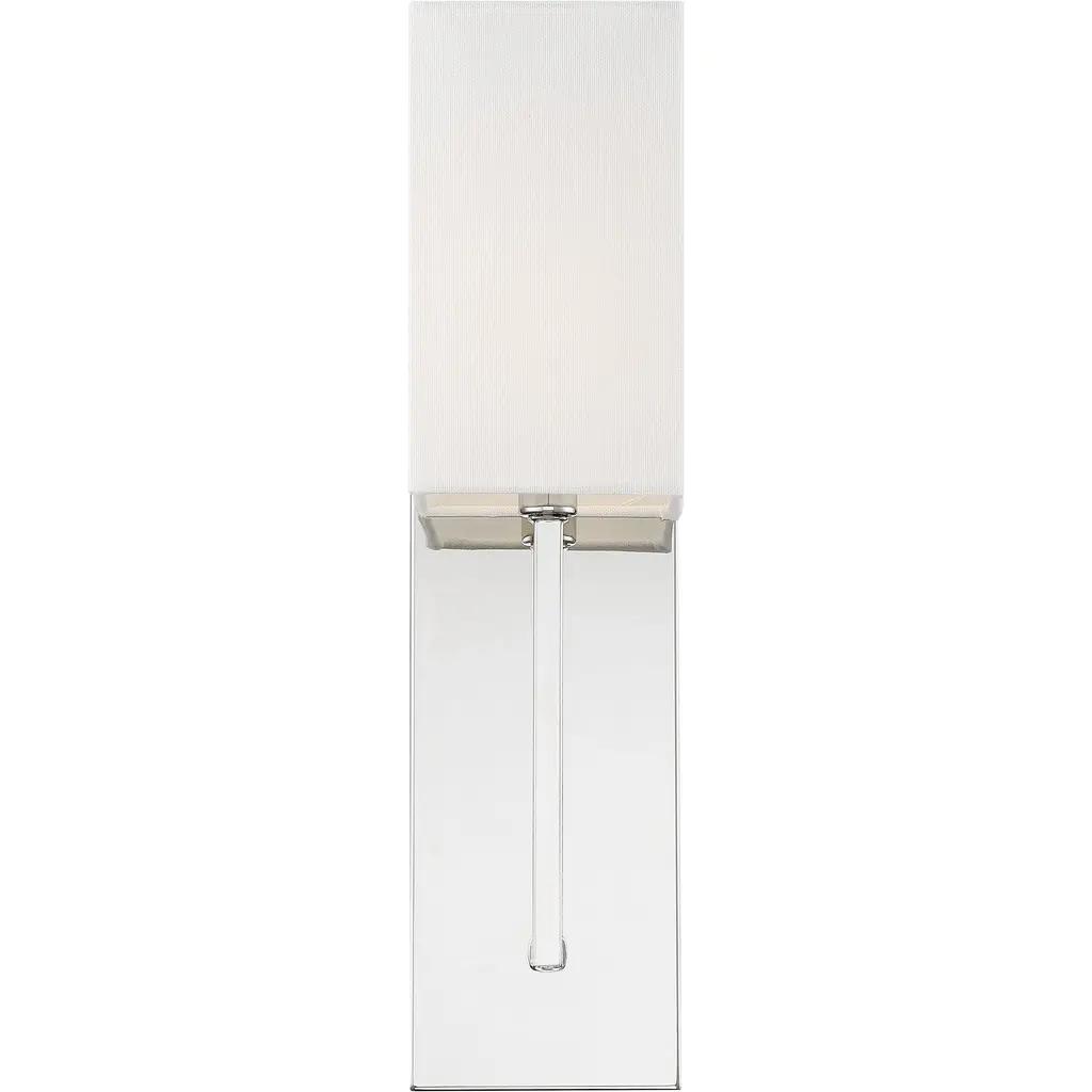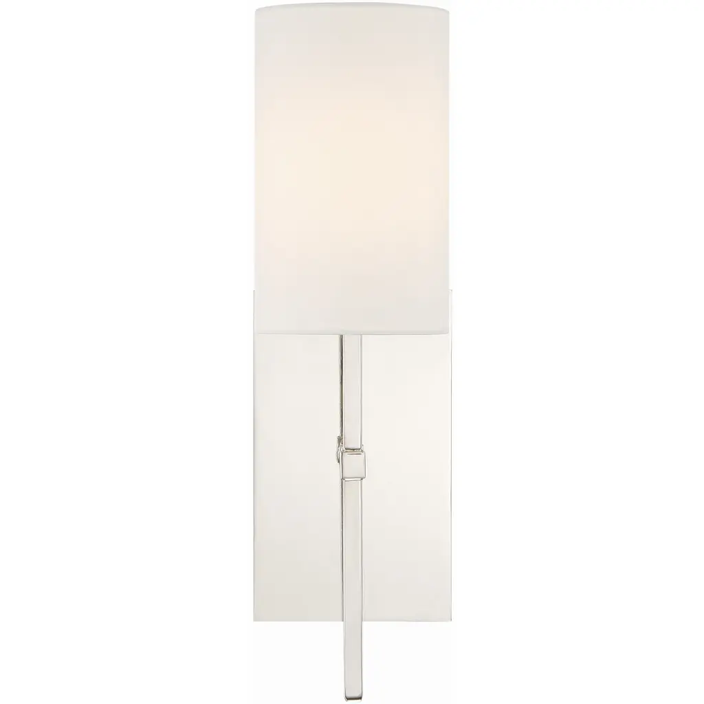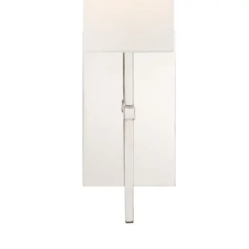 Upscale design. The Veronica Wall Sconce by Crystorama is made for those with sophisticated taste. It features a sleek arm and a rectangular wall-mounted plate in a timeless metal finish to complement home décor. A white cylindrical lamp shade completes it and allows for softly diffused accent lighting. A stylish option for living spaces, dining rooms or master suites, this transitional light fixture makes a statement as is or when paired with another.