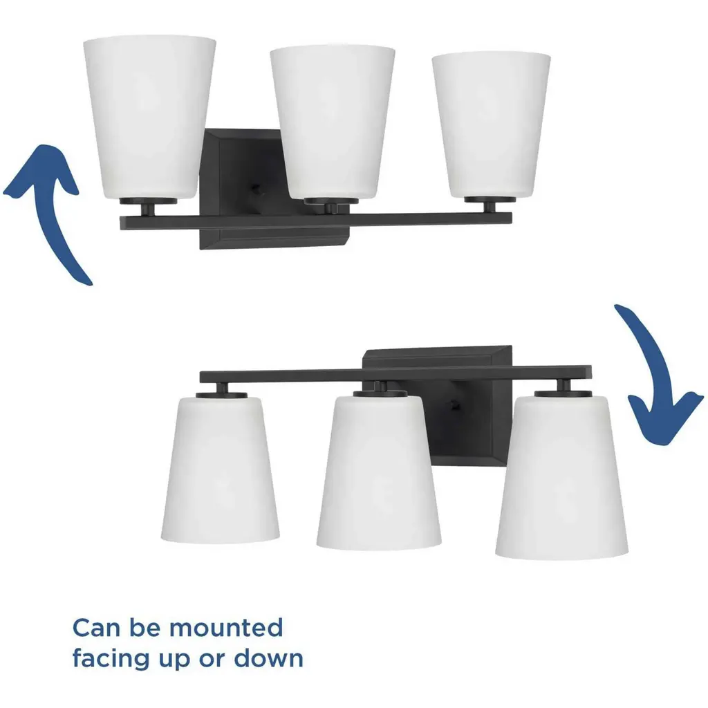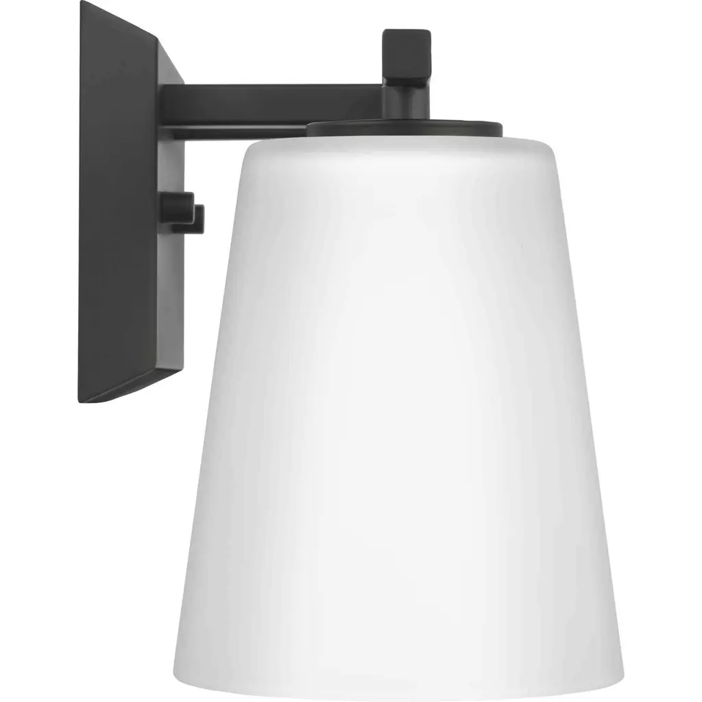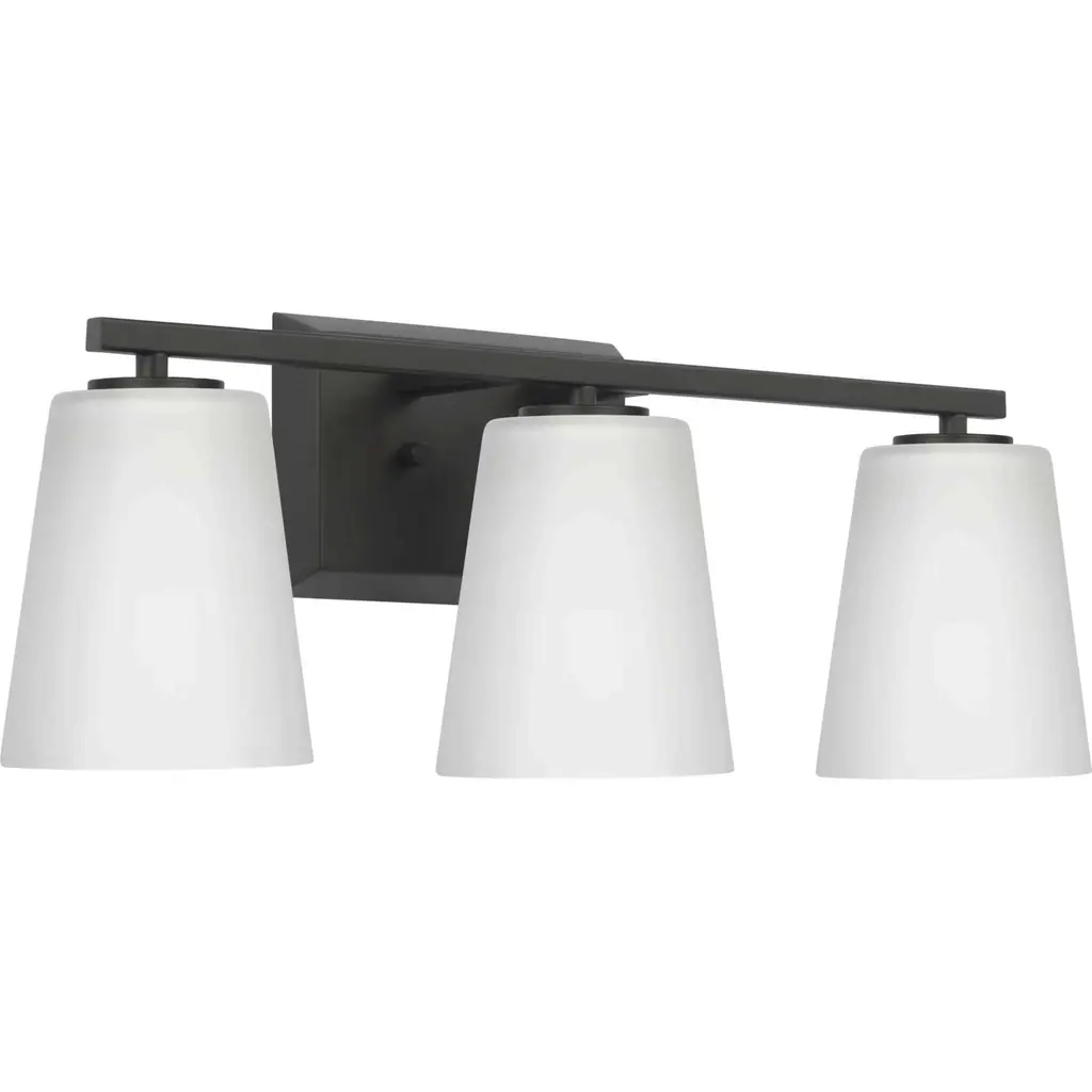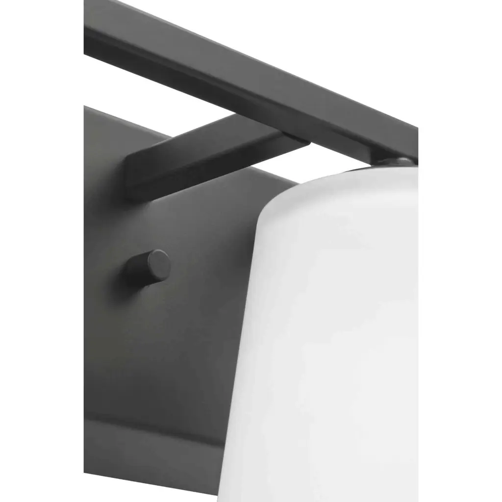 Elegantly extended, the Vertex Collection is composed of angular forms finished insp matte black to create a bold design that perfectly complements modern interiors. Glass shades delivers bright illumination to bathrooms and powder rooms in contemporary settings. This versatile fixture can be mounted up or down, increasing its design flexibility. It is cULus damp rated and has a one-year warranty to guarantee your complete satisfaction. Progress Lighting products offer exceptional quality, reliability, and functionality. .