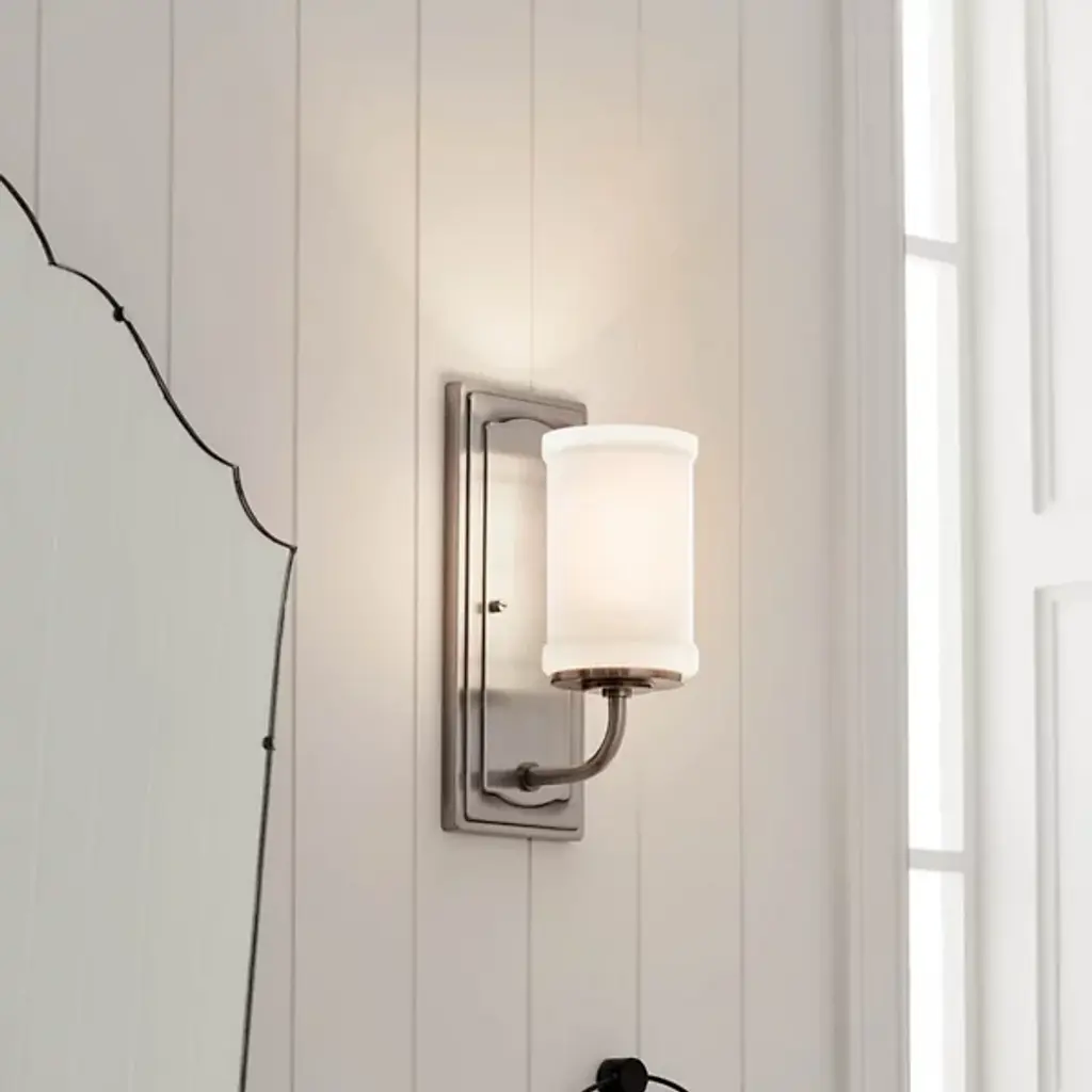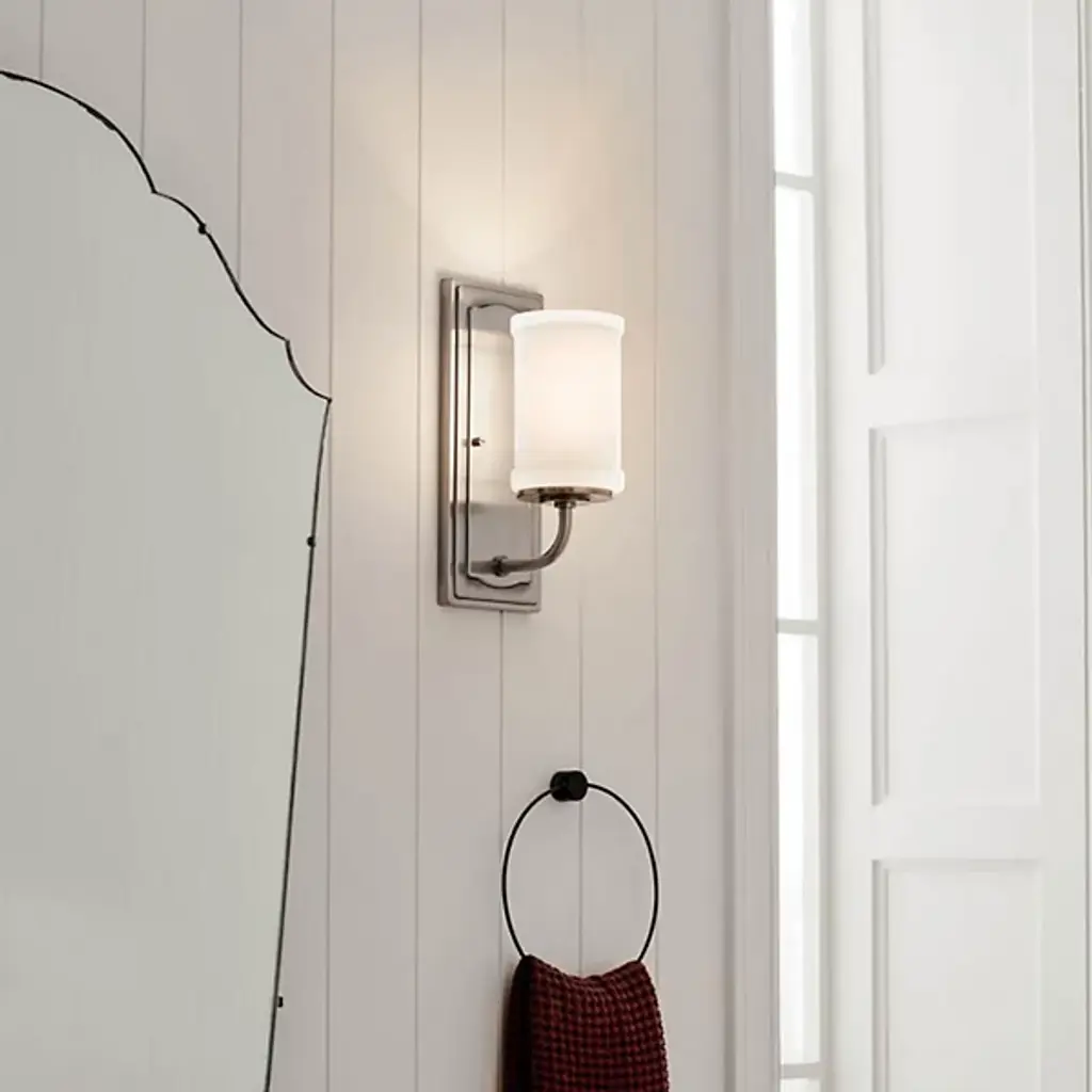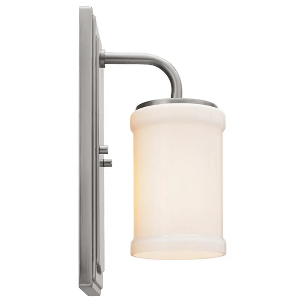 The Vetivene Bath Wall Sconce by Kichler gives your lavatory a look of refinement. Viewers of this fixture will notice the subtle arching details that line the surface of this sconce’s steel backplate. This backplate secures to your wall so that a beautiful shade of opal glass can rest at the end of the sconce’s sloping arm. Inside of the Vetivene’s shade is a halogen bulb that gives your room a vibrant glow.