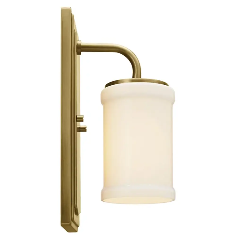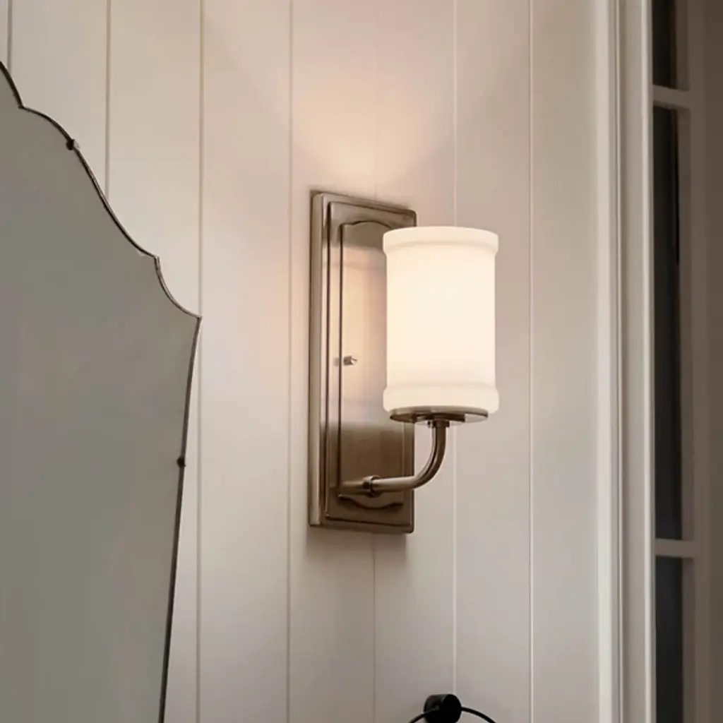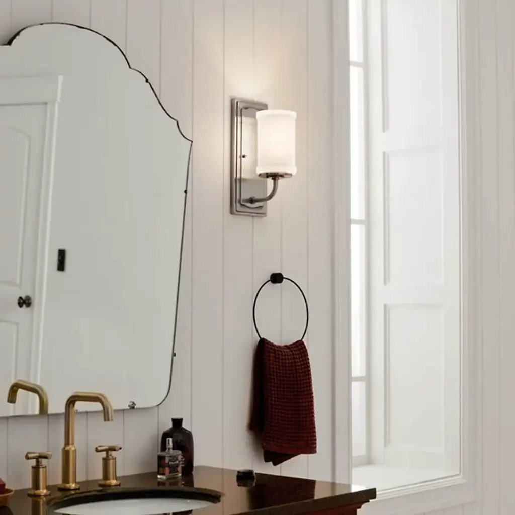 The Vetivene Bath Wall Sconce by Kichler gives your lavatory a look of refinement. Viewers of this fixture will notice the subtle arching details that line the surface of this sconce’s steel backplate. This backplate secures to your wall so that a beautiful shade of opal glass can rest at the end of the sconce’s sloping arm. Inside of the Vetivene’s shade is a halogen bulb that gives your room a vibrant glow.