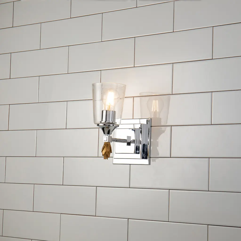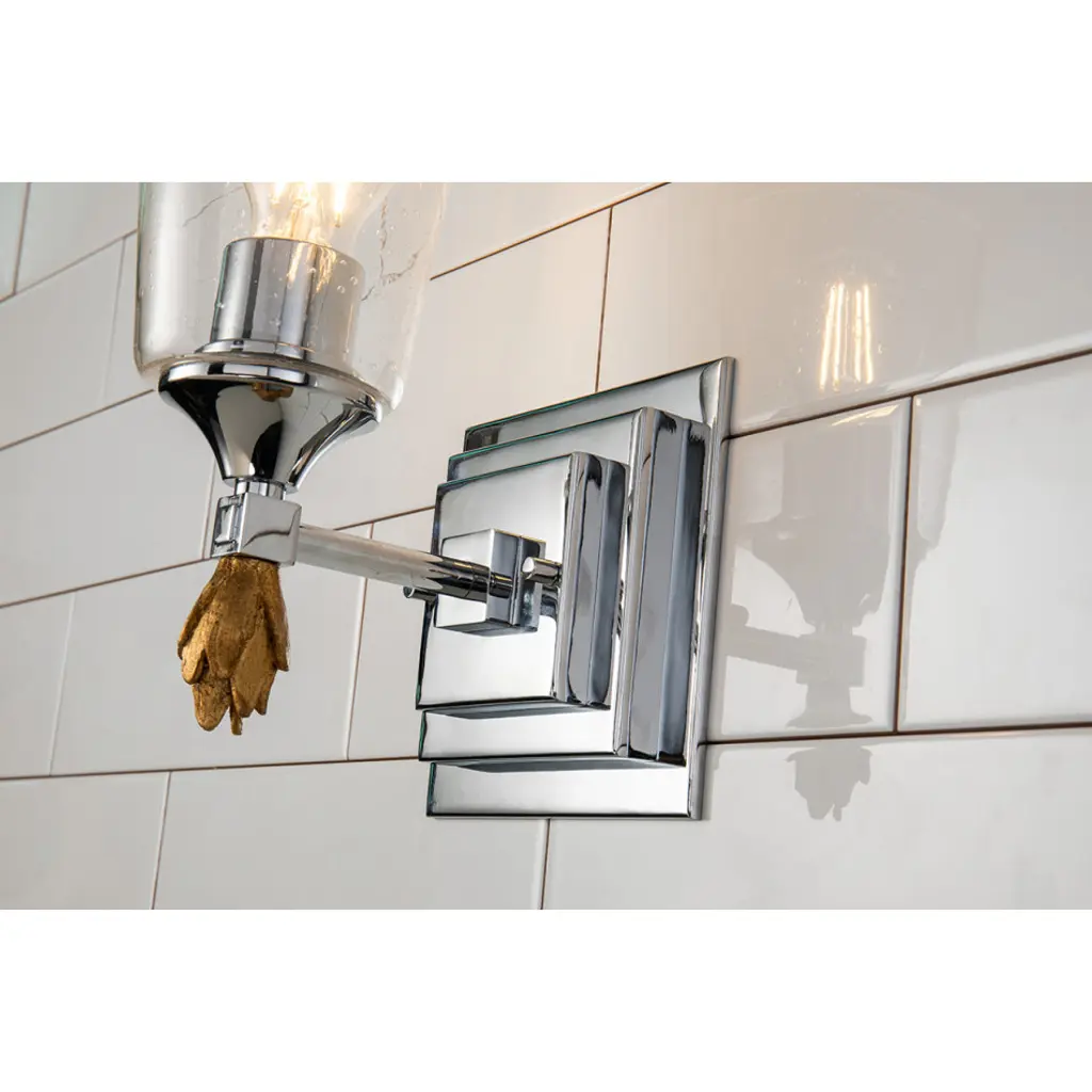 Inspired by 1950s and '60s design, the polished chrome finish and double square backplate of our Vetiver wall sconce adds charming style to bedrooms, living rooms and dining spaces. Another favorite spot for this vintage-inspired 1-light wall sconce is your favorite reading nook or as a bathroom vanity light. The simple clear seeded glass and the detailed gold finial complete the look of our favorite one-light sconce.