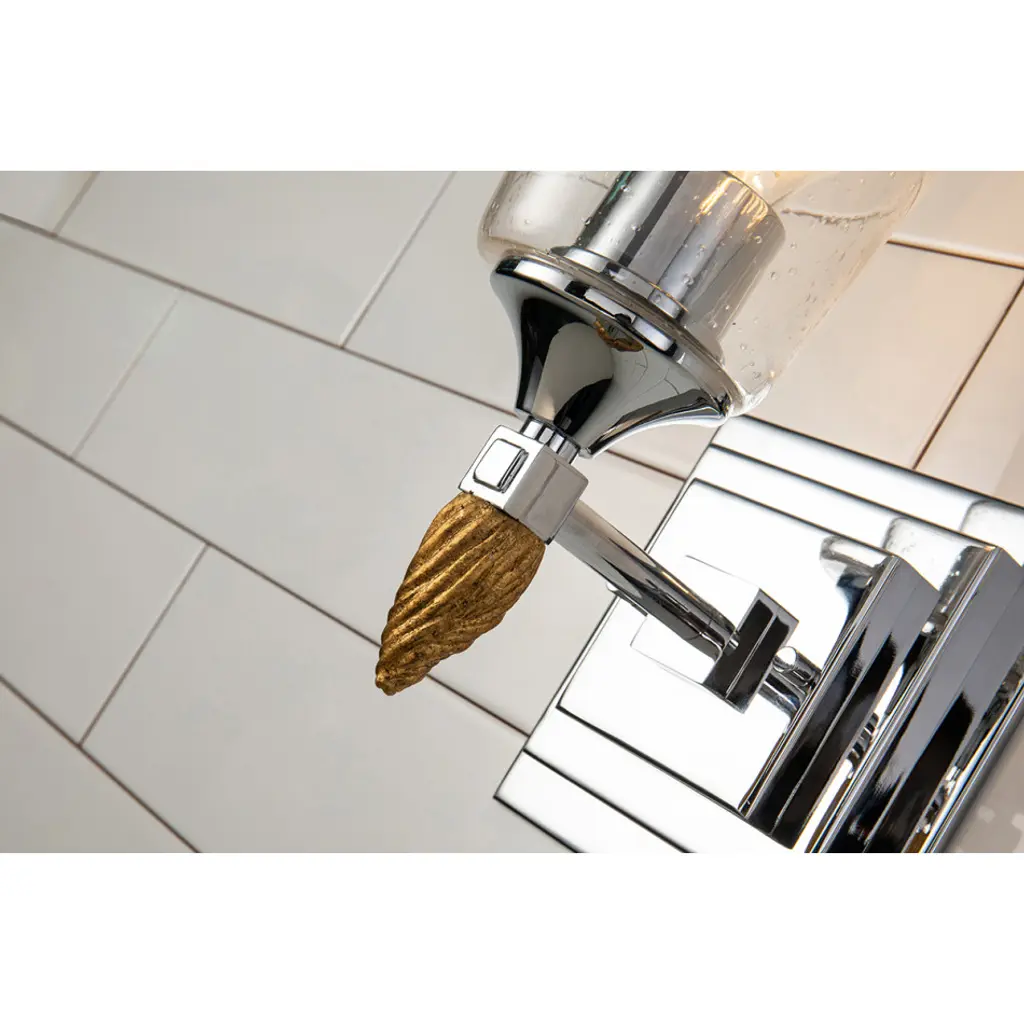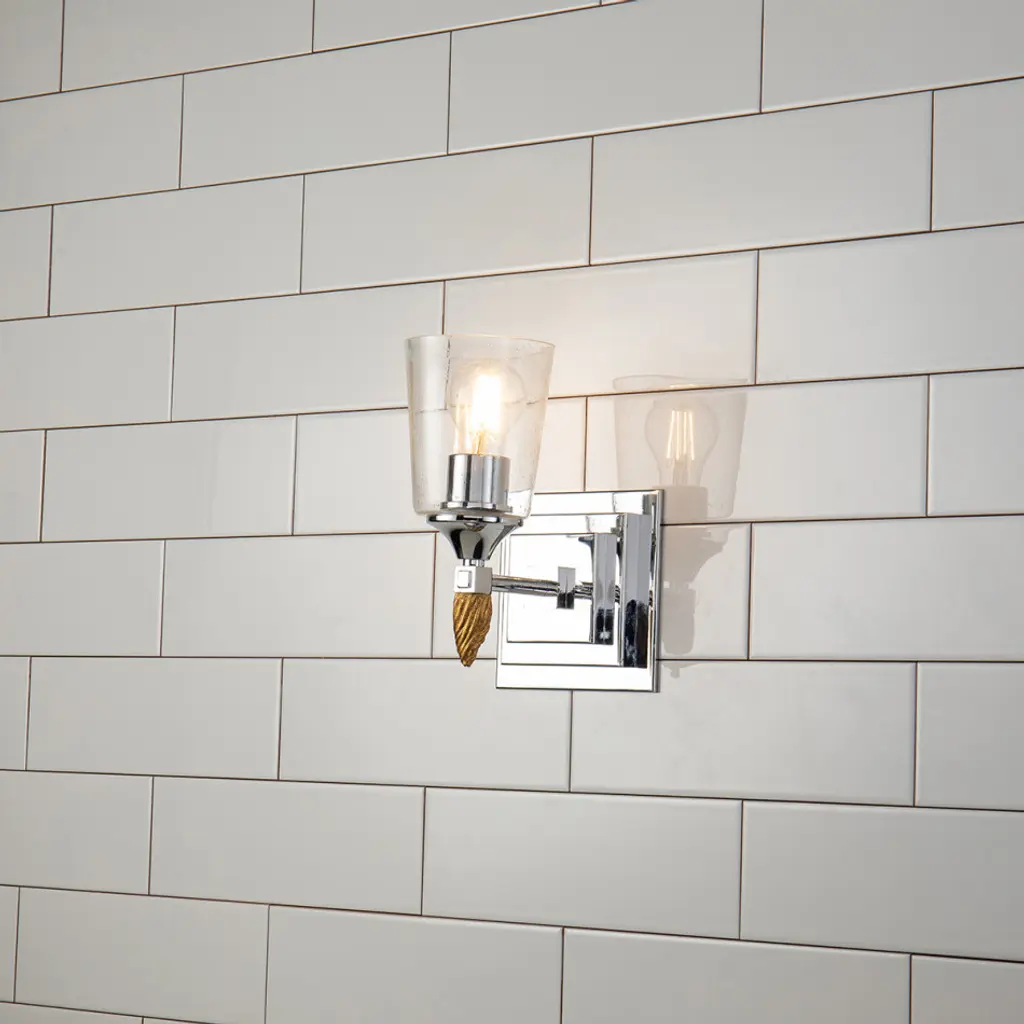 Inspired by 1950s and '60s design, the polished chrome finish and double square backplate of our Vetiver wall sconce adds charming style to bedrooms, living rooms and dining spaces. Another favorite spot for this vintage-inspired 1-light wall sconce is your favorite reading nook or as a bathroom vanity light. The simple clear seeded glass and the detailed gold finial complete the look of our favorite one-light sconce.