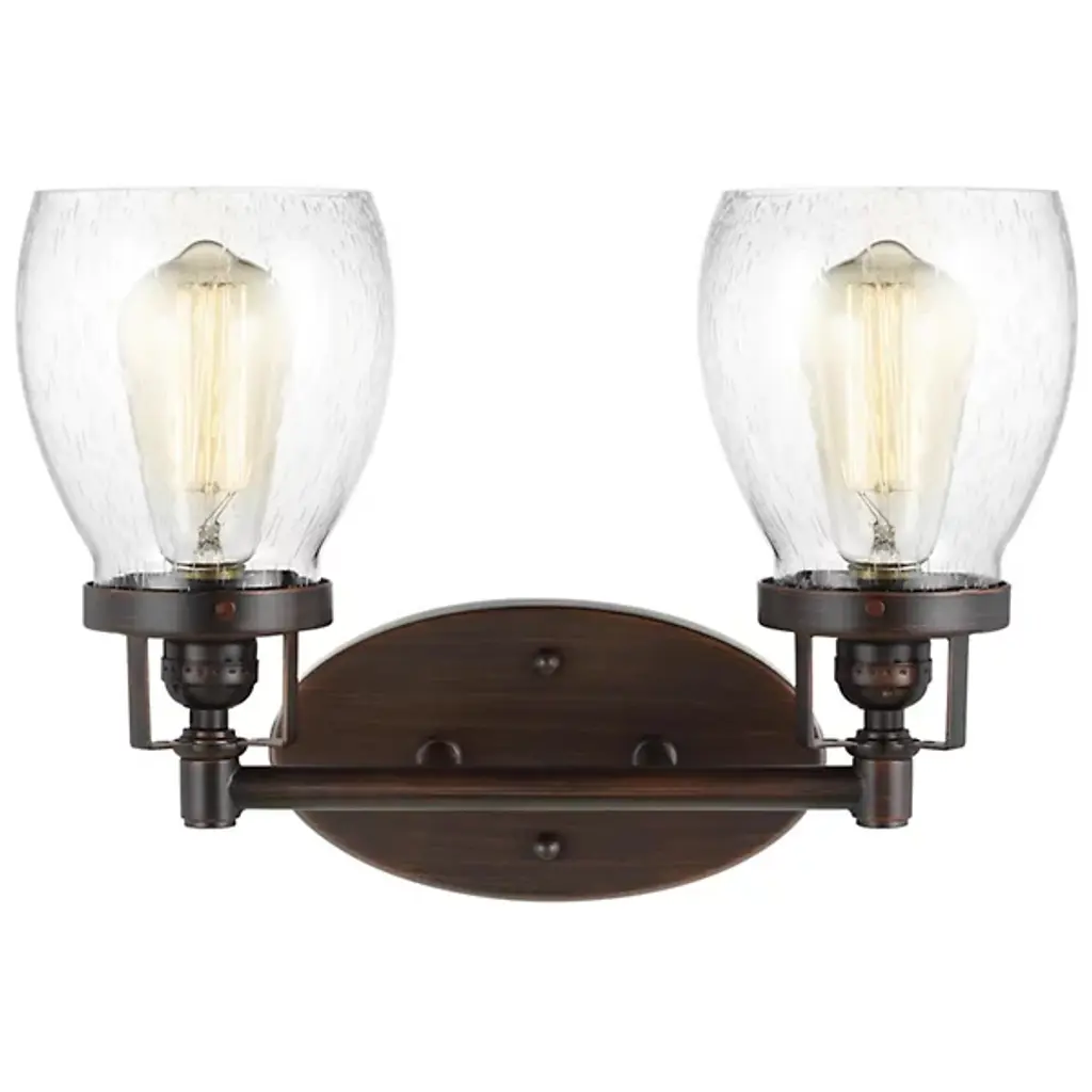 Inspired by 1950s and '60s design, the polished chrome finish and double square backplate of our Vetiver two-light wall sconce adds charming style to bathrooms, living rooms and favorite reading spots . The simple clear seeded glass and the beautifully detailed antique gold finial complete the look of this new 2-light vanity bath bar.