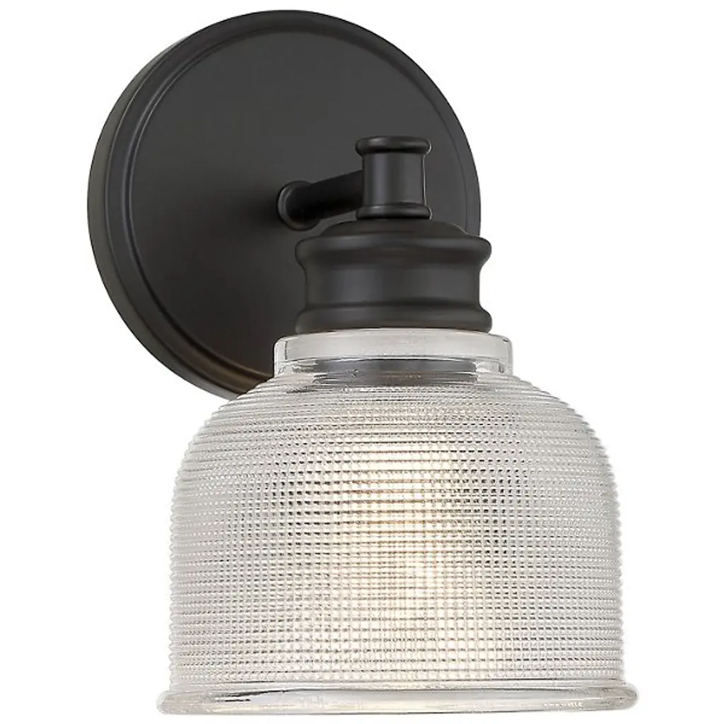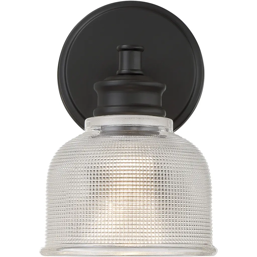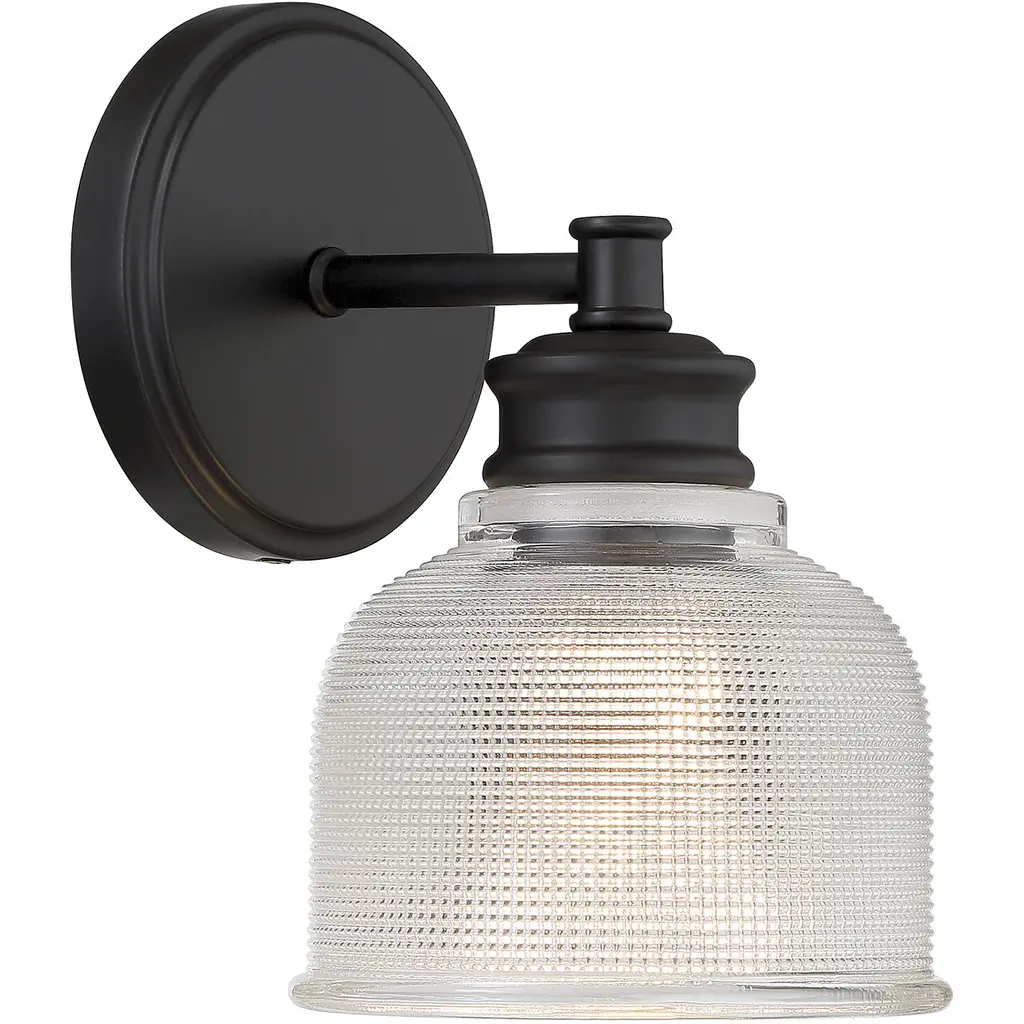 This 1-light sconce helps you bring a touch of vintage inspiration to any space. It has a highly textured shade of glass and a matte black finish. 9.5" height, 5" width. Uses standard size bulb, max 60 watts. LED bulb compatible.