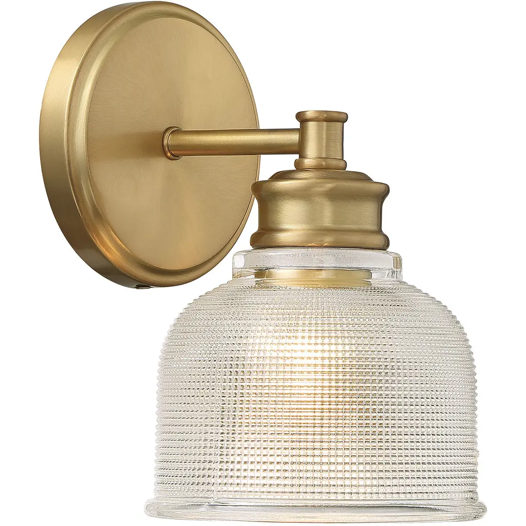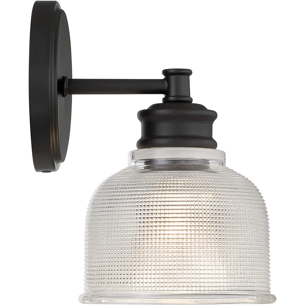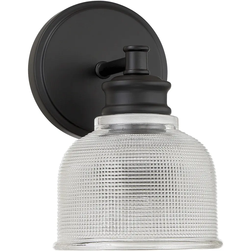 This 1-light sconce helps you bring a touch of vintage inspiration to any space. It has a highly textured shade of glass and a matte black finish. 9.5" height, 5" width. Uses standard size bulb, max 60 watts. LED bulb compatible.