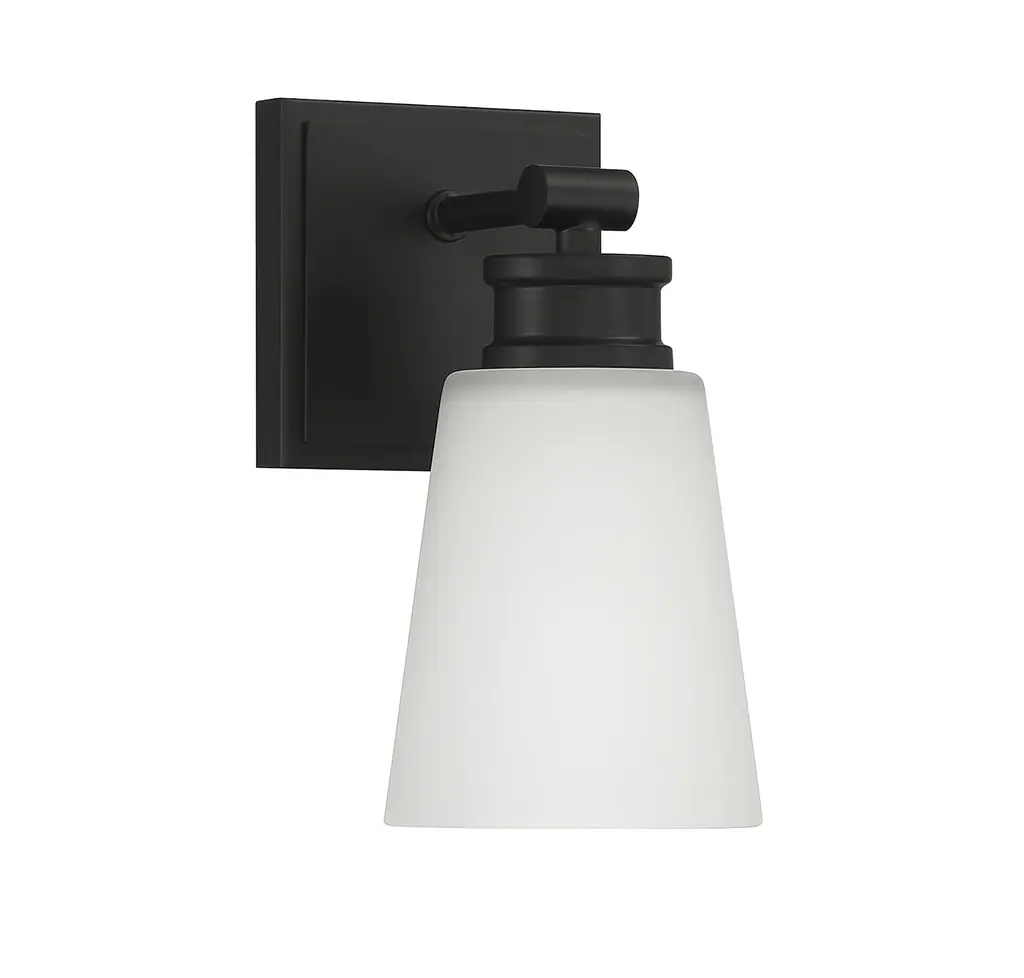 Simply stylish and cleanly classic, this Meridian 1-light wall sconce offers a shade of milk glass and a matte black finish for bright yet comfortable illumination. Great when used solo or in groupings. 9.5" height, 5" width, extends 6.5" from wall. Max 60 watt bulb, standard size A19 bulb recommended. LED bulb compatible. Damp area rated.