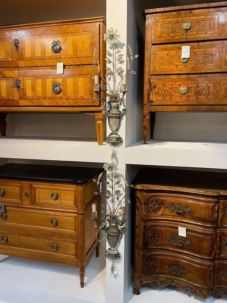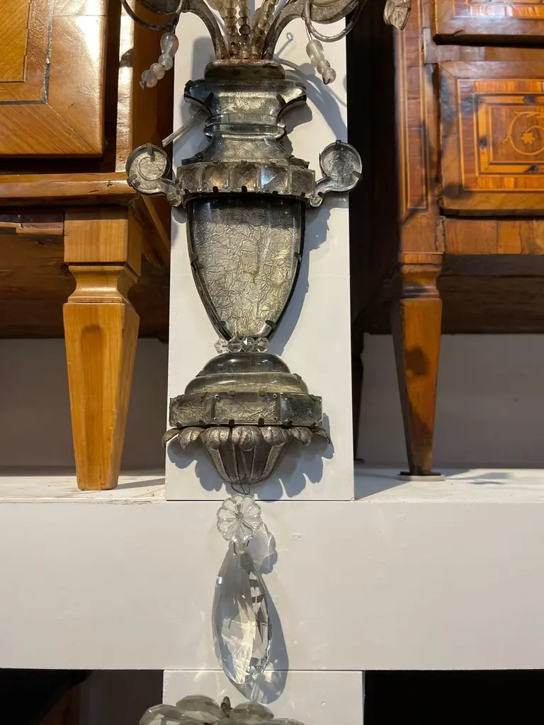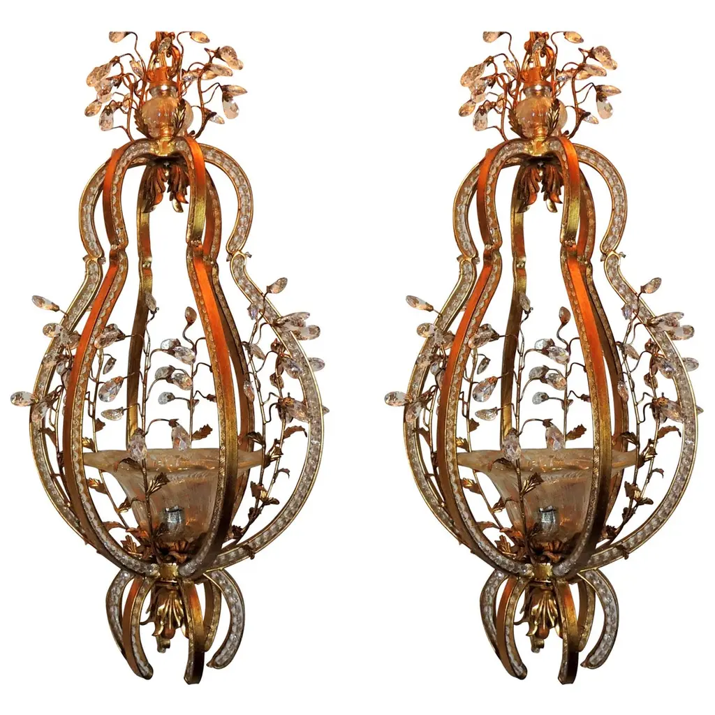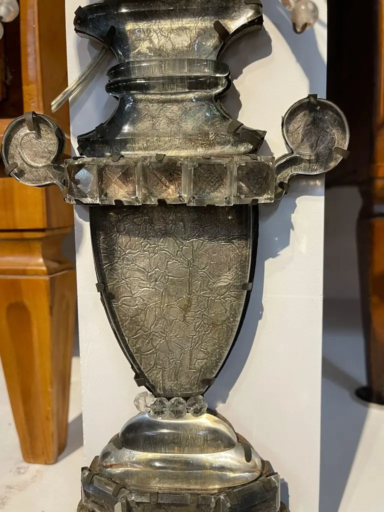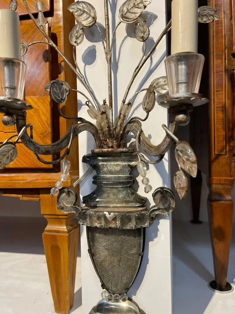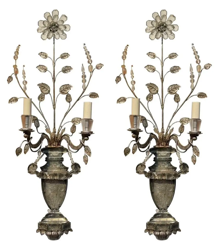 Gorgeous vintage pair of French Bagues crystal and silver leaf sconces. Featuring an urn with flowers and leaves and 2 lights. So elegant!!