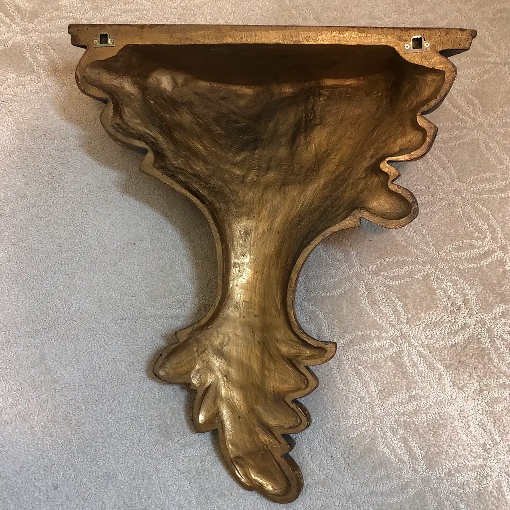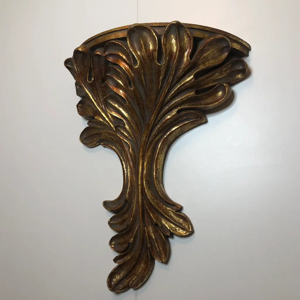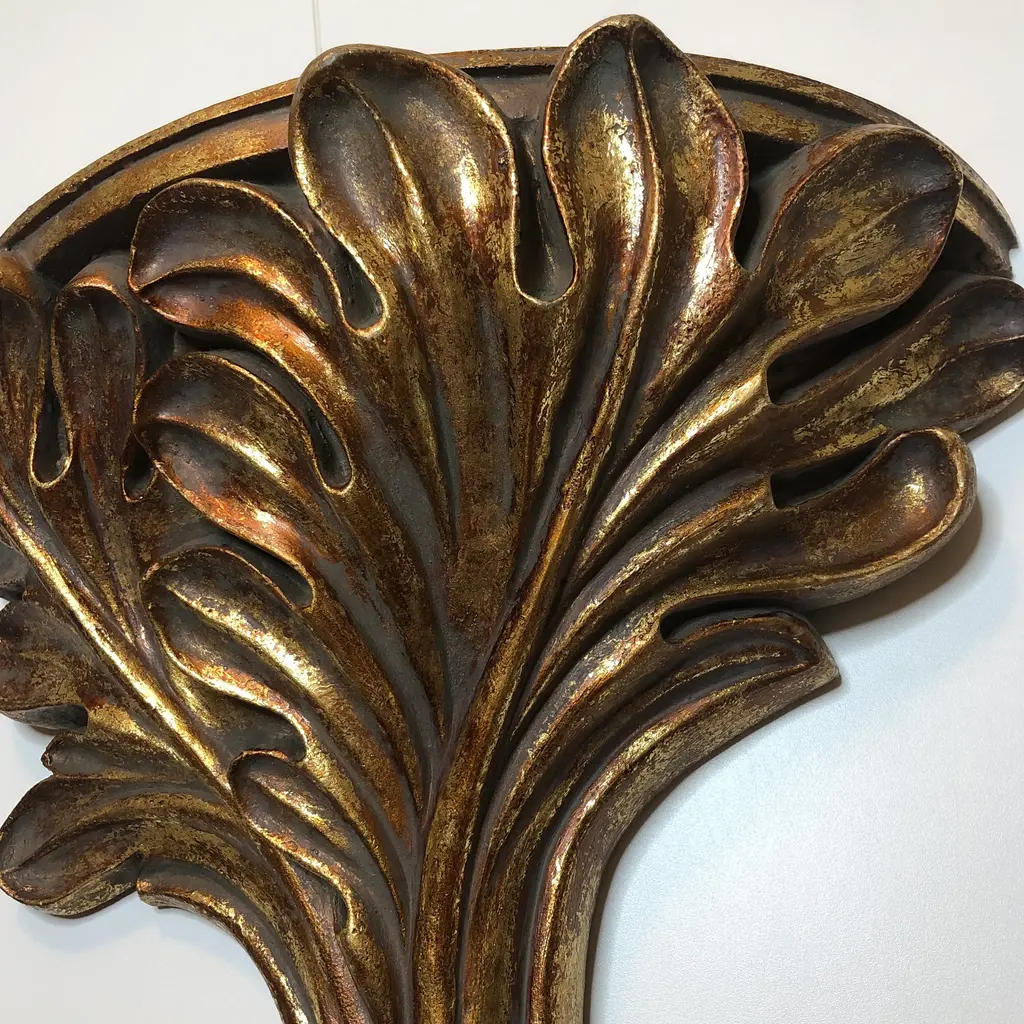 Dramatic wall sconce shelf. Gold gilt fig leaf motif Vintage: 1970’s Dimensions 17” W x 6.5” D x 20.25” H Weight - 9 lbs (2 available upon request @ $400)