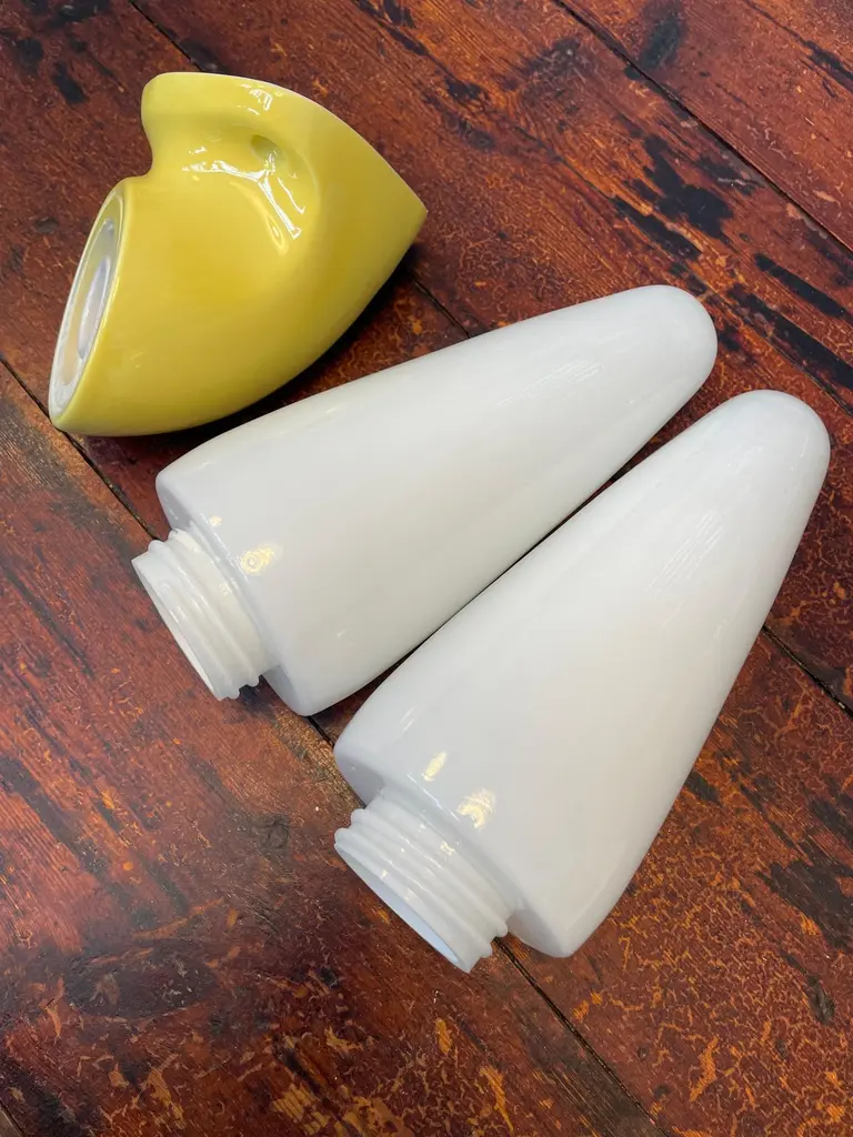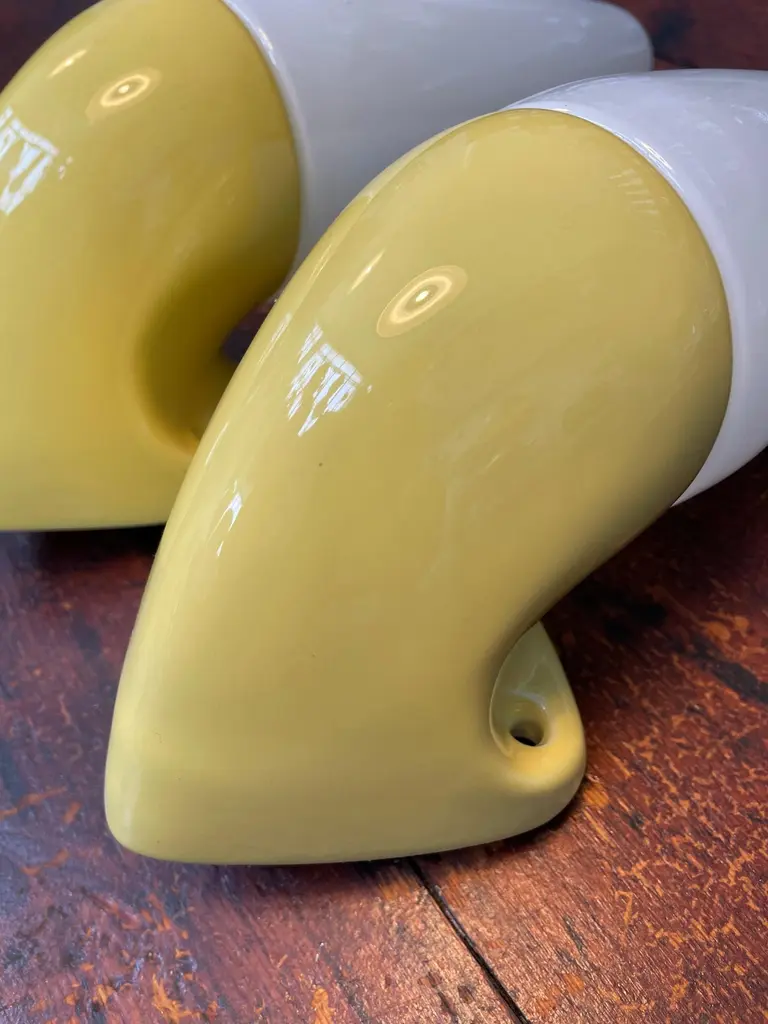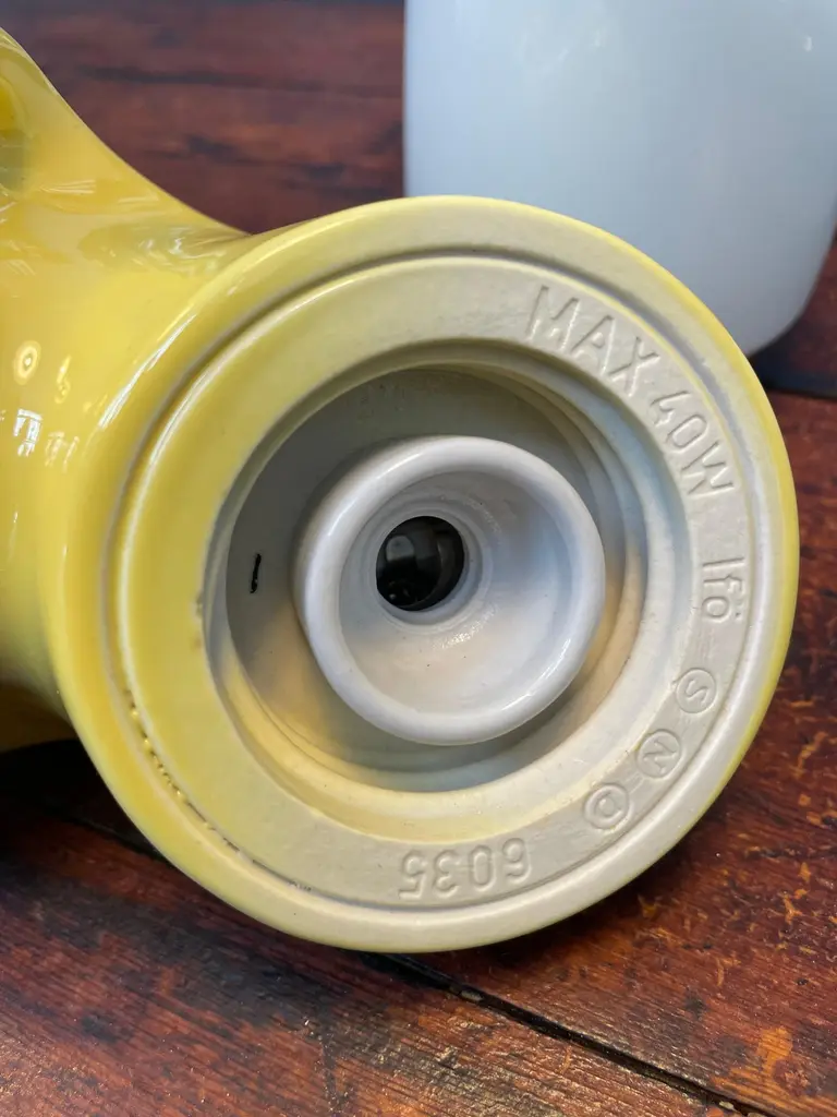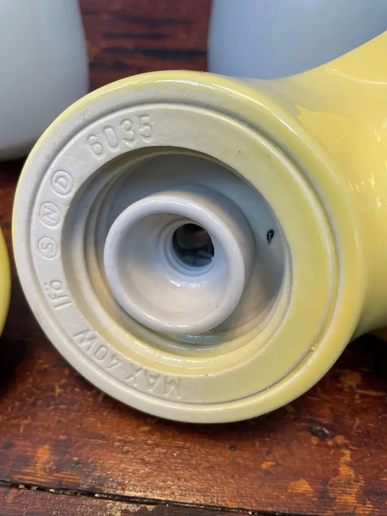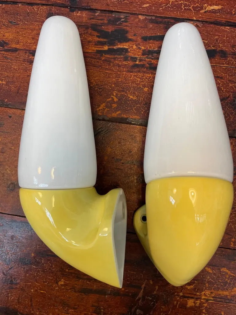 Vintage Ifö of Sweden ceramic bathroom lamps from the 1960s in yellow and with the original boxes.Model 6035. Designed by Sigvard Bernadotte. Opaline glass shades. Ceramic bulb holders for an E14 bulbLamps can be used as up or down lights.In great condition and ready to use.These lamps are handmade hand glazed and hand blown so there will for example be small imperfections in the glass shades such as bubbles or slight imperfections in the glazing such as a slight variation in color also the shade on the glazing can also vary slightly from lamp to lamp.Just one of the great things about handmade items. Will be fitted with a 20cm length of cord. These are a class 2 lamps with no metal parts so no need for grounding Price per pair. Responsible worldwide shipping. These lamps are made for a wet environment but were made before IP rating began in 1976 but they are the equivalent of an IP44 Sigvard Oscar Fredrik Bernadotte, Prince Bernadotte, Count of Wisborg, was a Swedish prince and Industrial designer. He was the second son of King Gustav VI Adolf of Sweden and his first wife, Margaret, Duchess of Scania, a granddaughter of Britain's Queen Victoria.