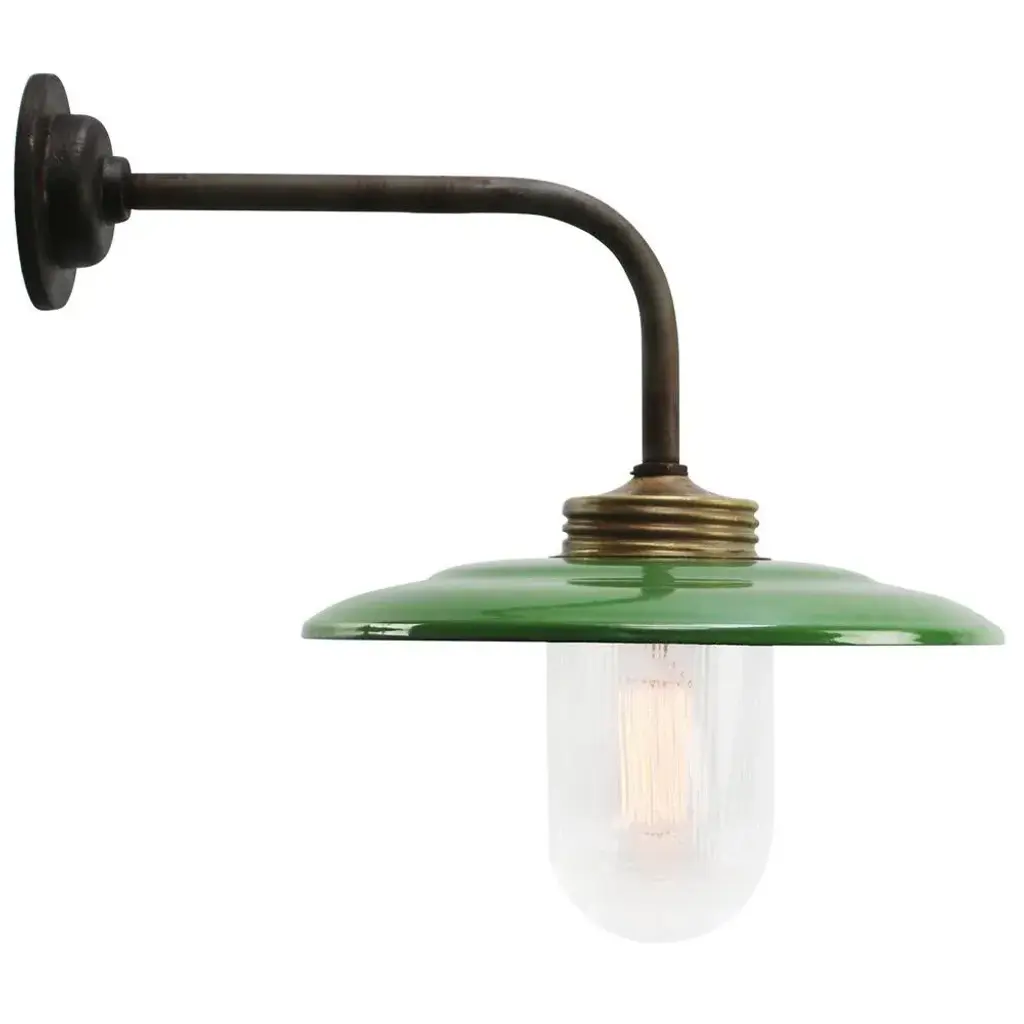 Vintage Industrial Brass And Glass Wall Light In Green Enamel