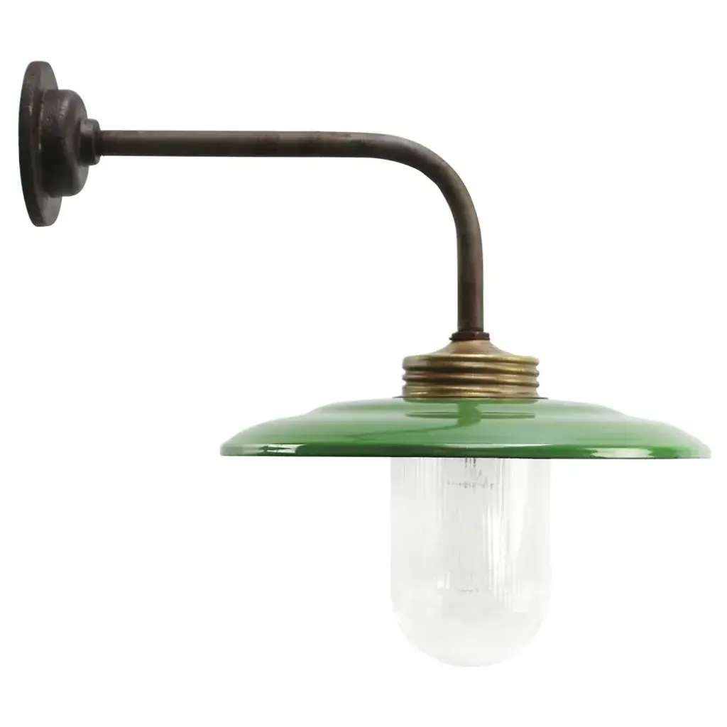 Rust Cast Iron Barn light green enamel, white interior, clear striped glass Diameter cast iron wall piece: 10.5 cm / 4 inches 2 holes to secure E27 / E26 Up to 250V (Europe/UK Standard).The wiring of this item may be original and might need replacement, if not specified otherwise.