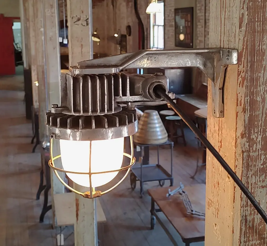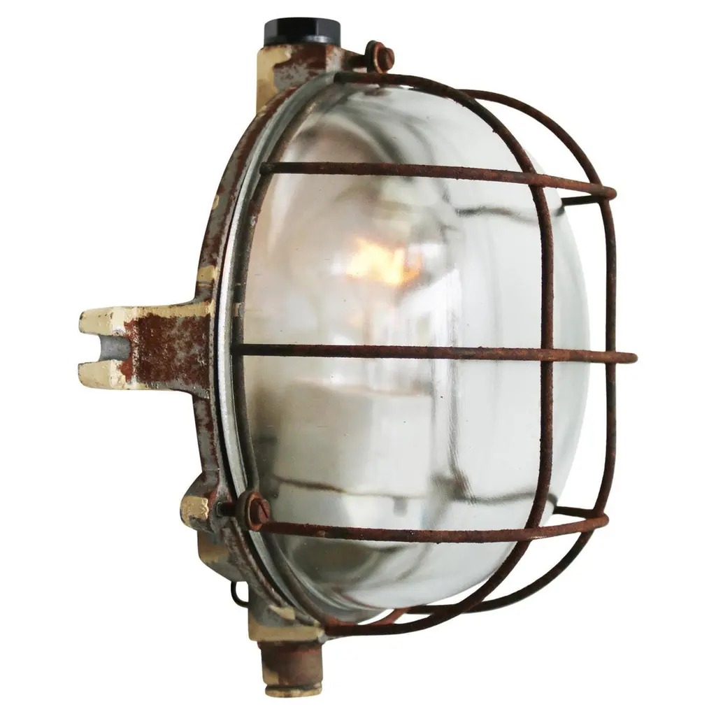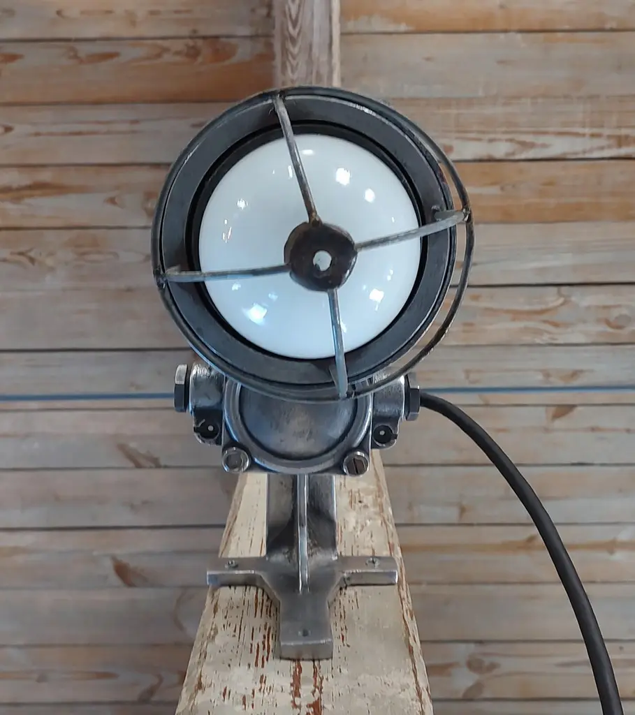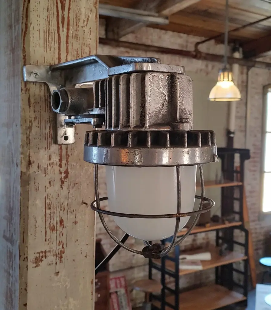 Industrial vapor proof frosted glass wall sconce.Dimensions: 12 1/2" deep x 5 3/4" wide x 10 1/4" high.Materials: Glass & Aluminum.