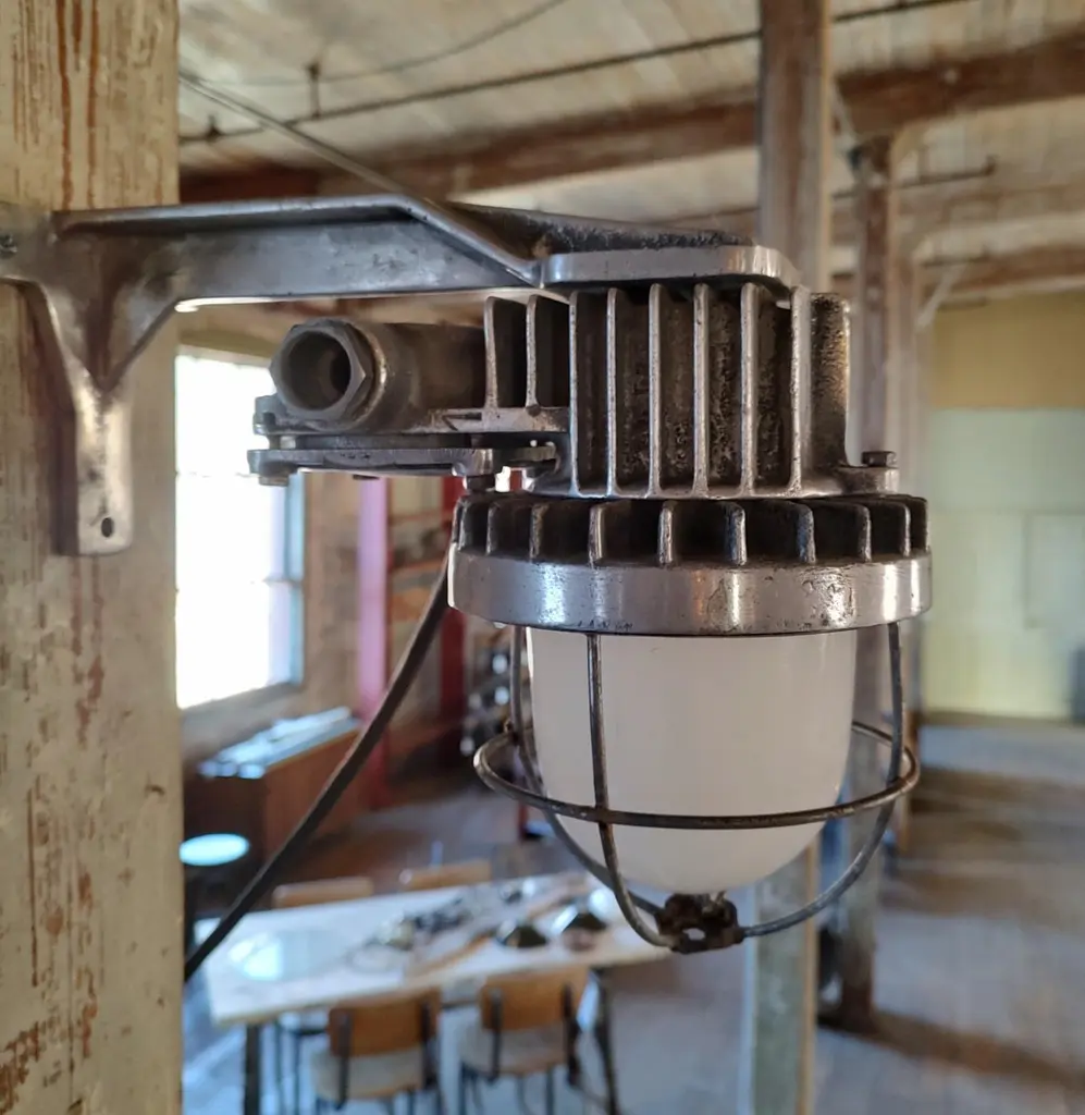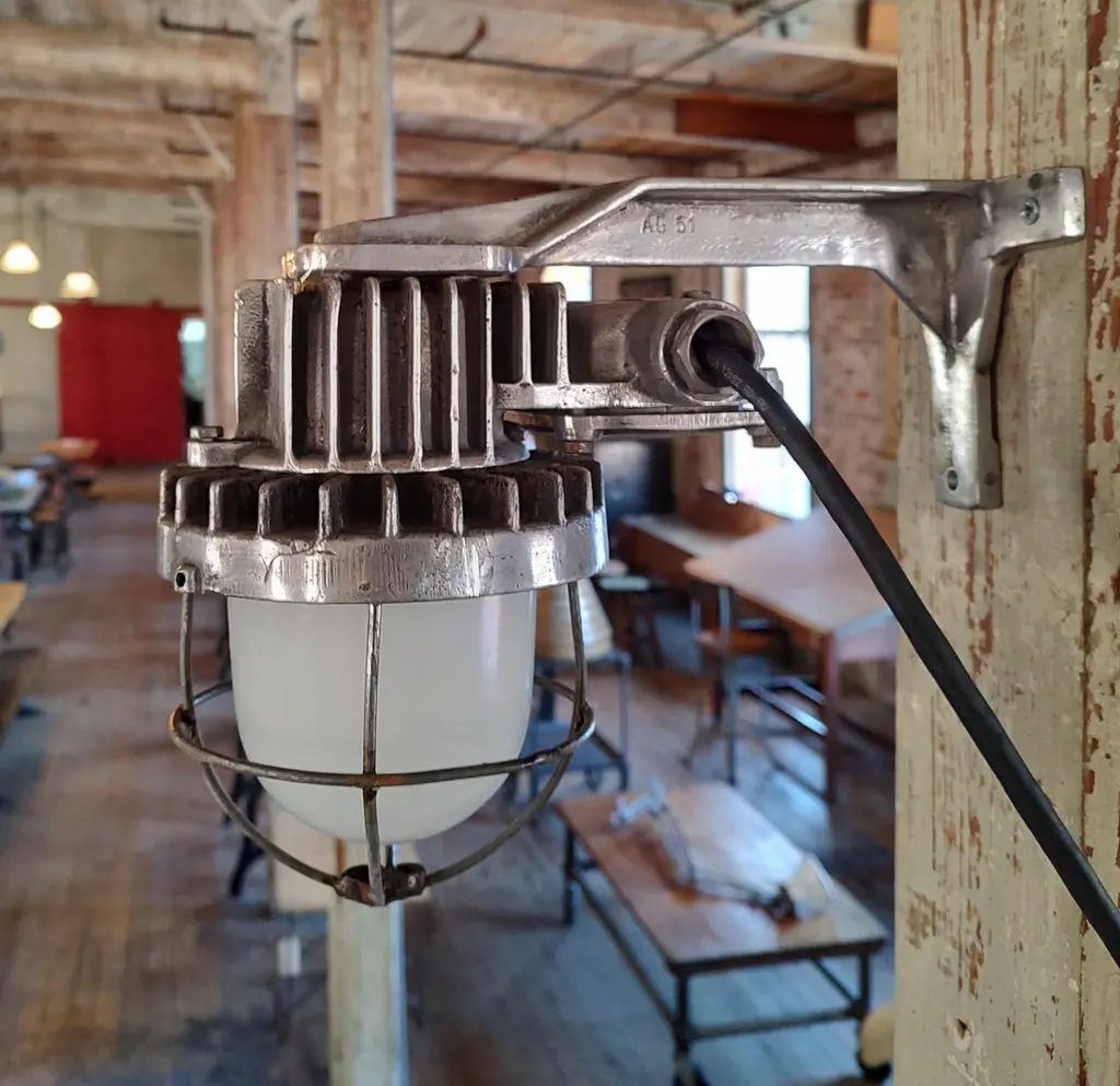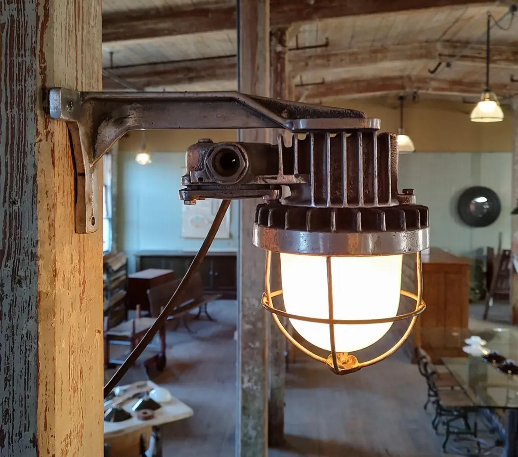 Industrial vapor proof frosted glass wall sconce.Dimensions: 12 1/2" deep x 5 3/4" wide x 10 1/4" high.Materials: Glass & Aluminum.