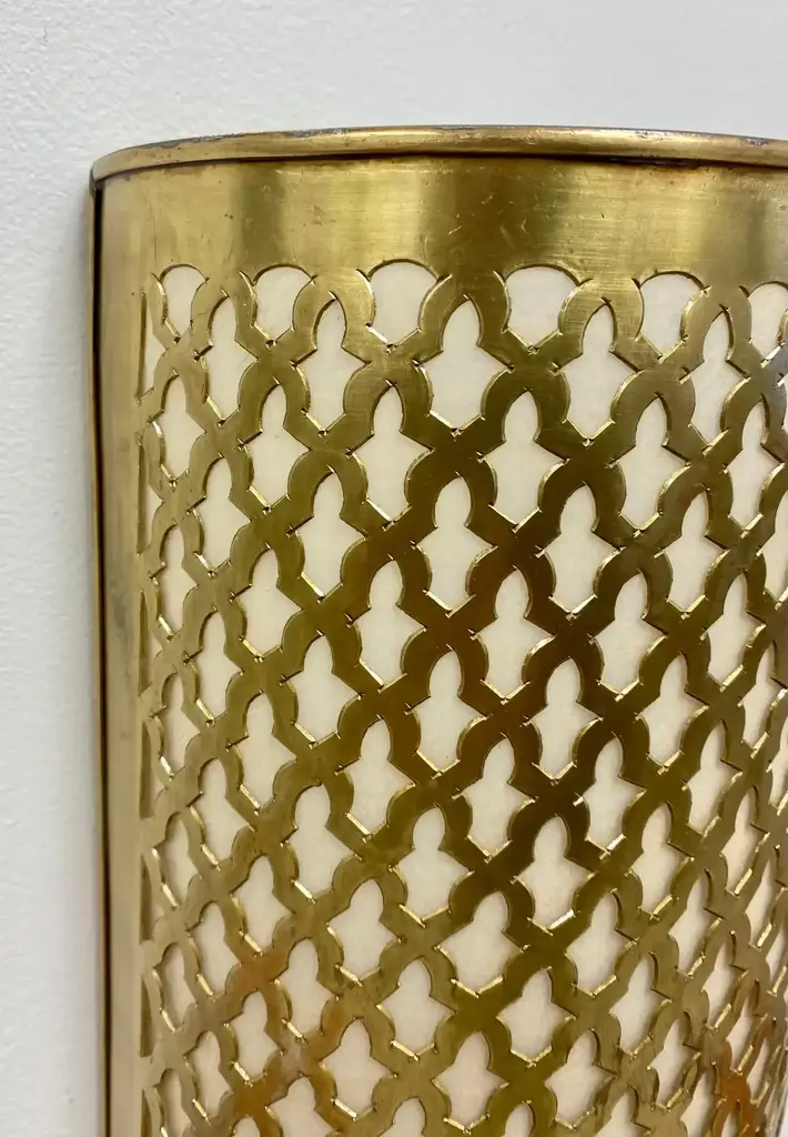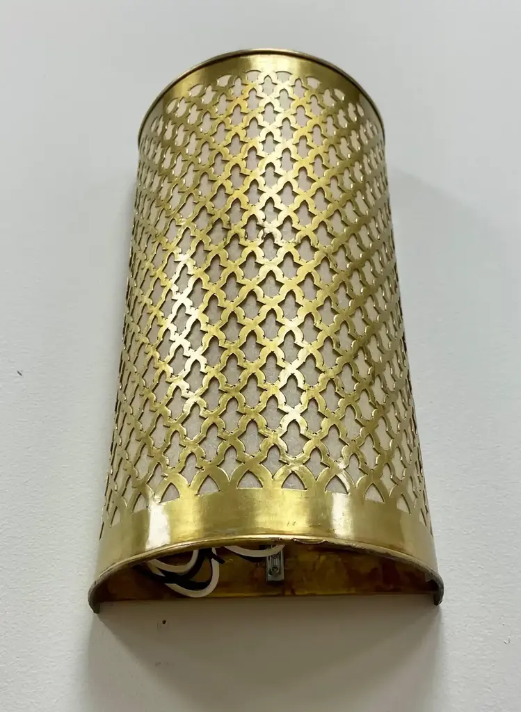 A pair of stylish handmade vintage Moroccan brass wall sconces or lanterns. The sconces have a semi-cylindric shape, feature exquisite Moorish geometrical design and made of high quality brass. The wall lanterns will light your room in style and add a touch of exotic to your room. The walls sconces have been recently professionally wired. Dimensions: 11.25" H x 6" W x 2.75" D