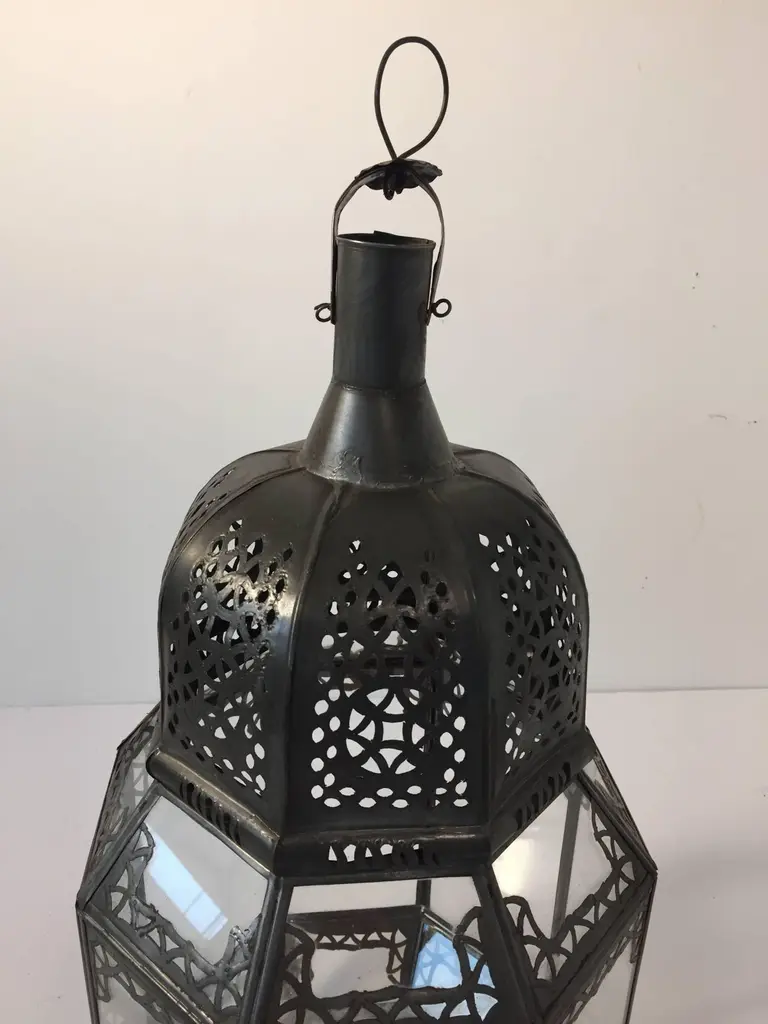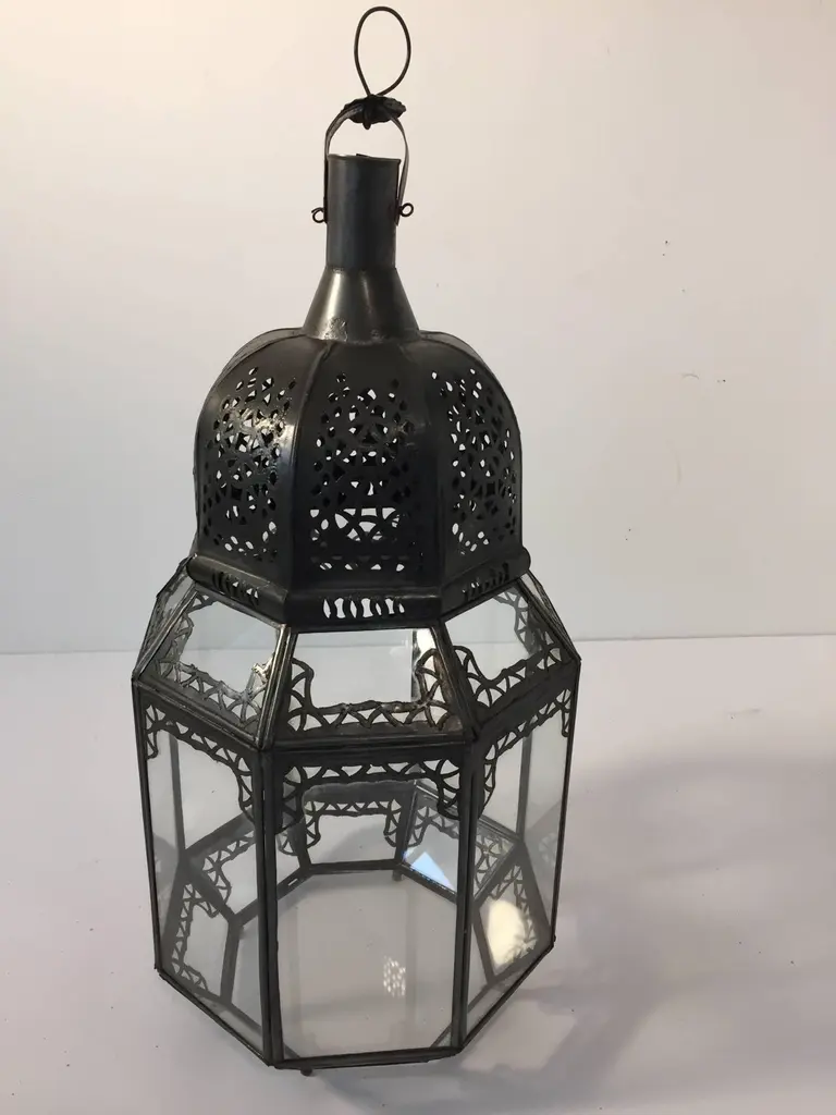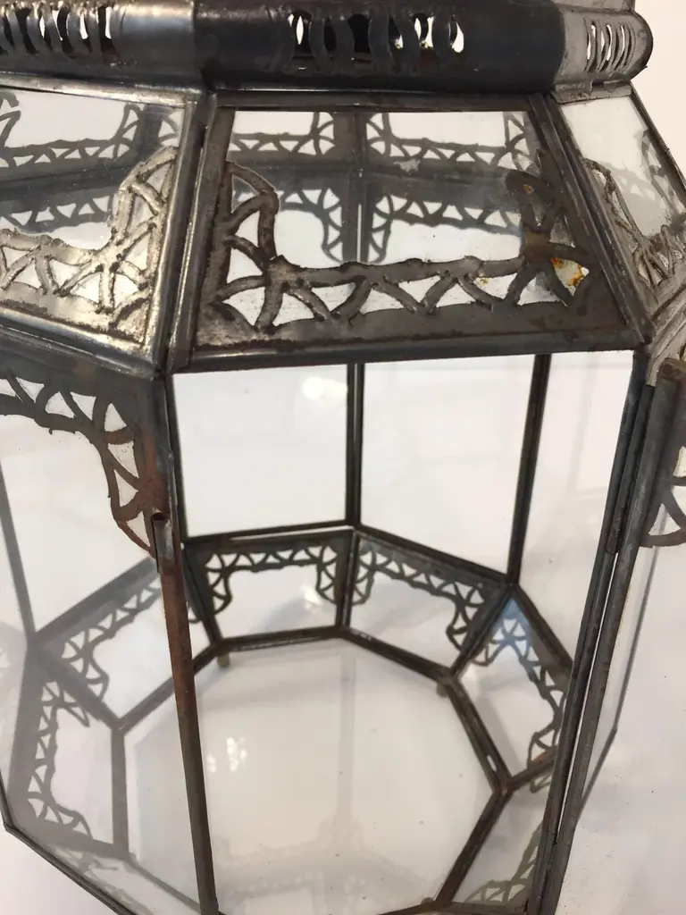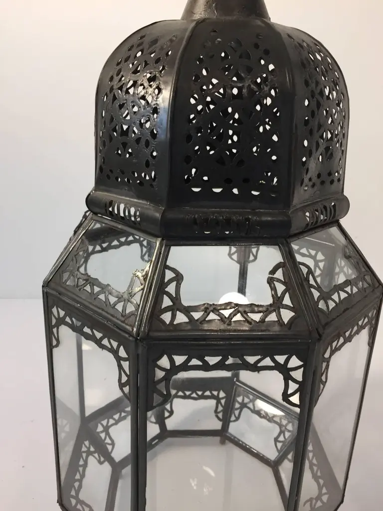 Vintage Moroccan Moorish clear glass lantern with intricate metal filigree.Octagonal shape, delicately handcrafted by artisans in Morocco.Bronze metal color finish.Could be used with candle or rewired for electricity as a Moroccan pendant or wall sconce.Multiple available contact us.Dimensions: 20 in. H x 10 in. D.For indoor use or covered area only.About the Moroccan lanterns:The metal and glass hand-crafted lantern from Morocco is a captivating pieces of artistry that combines the rich cultural heritage and exquisite craftsmanship of the region. Its design reflects the traditional Moroccan style, which is renowned for its intricate detailing and vibrant aesthetic. This vintage Moroccan lantern is meticulously handcrafted using a combination of metal and glass, resulting in a stunning blend of materials that enhances its overall beauty. The framework of the Moorish lantern is skillfully constructed from metal which provides a sturdy foundation and intricate patterns. The metalwork adorning the Moroccan light fixture features intricate filigree patterns, geometric motifs, and delicate scrollwork, all meticulously hand-cut by skilled Moroccan artisans in Marrakech.These ornate Moorish designs create mesmerizing shadows when the Moroccan hanging lantern is illuminated, casting enchanting patterns that dance across the surroundings. The glass components of the Moroccan lantern add a touch of elegance and brilliance to its appearance.Clear and multicolor glass panels are carefully inserted into the metal framework.These panels may showcase traditional Moroccan geometric Islamic designs. When the Moroccan lantern is lit from within, the glow emanating through the colorful glass panels transforms the surrounding space into a warm and inviting atmosphere.The interplay of light and shadow created by the intricate metalwork and the translucent glass adds depth and allure to the lantern's overall charm. The craftsmanship of this Moroccan light fixture is a testament to the dedication and skill of the artisans who meticulously handcraft each piece. The attention to detail, the artistic flair, and the fusion of metal and glass make this Moroccan lantern a true work of art, capturing the essence of Moroccan culture and heritage.Whether displayed as a centerpiece or hung from a hook, this metal and glass handcrafted lantern from Morocco effortlessly evokes a sense of enchantment, transporting you to the vibrant streets and magical ambiance of Moroccan nights.