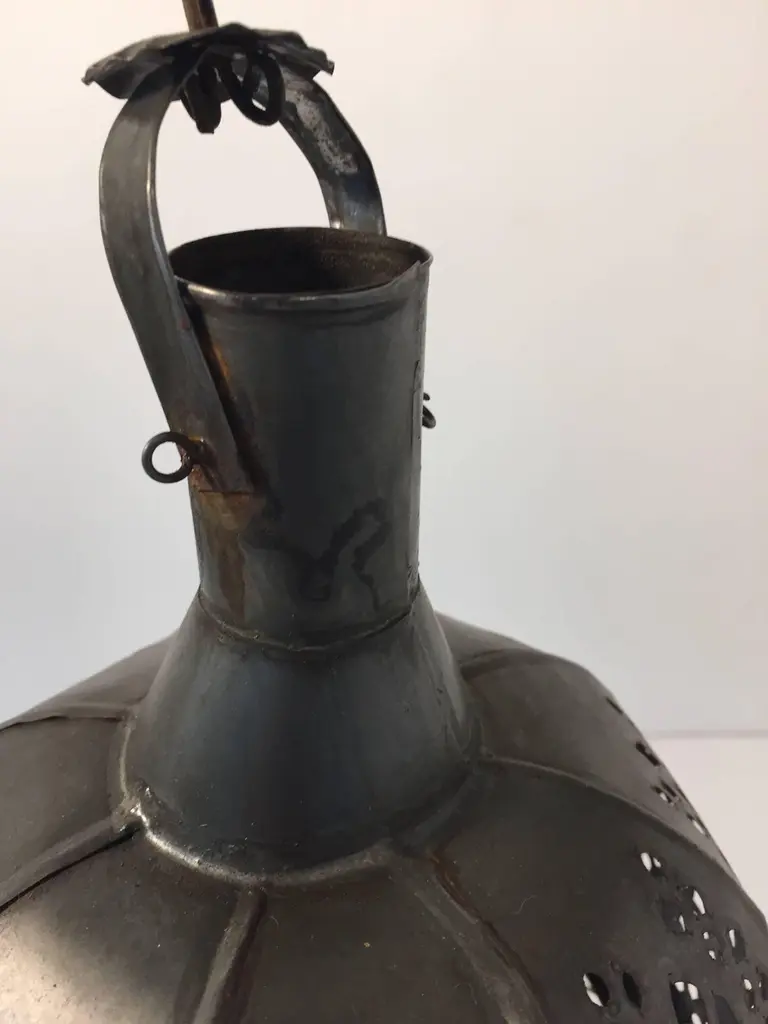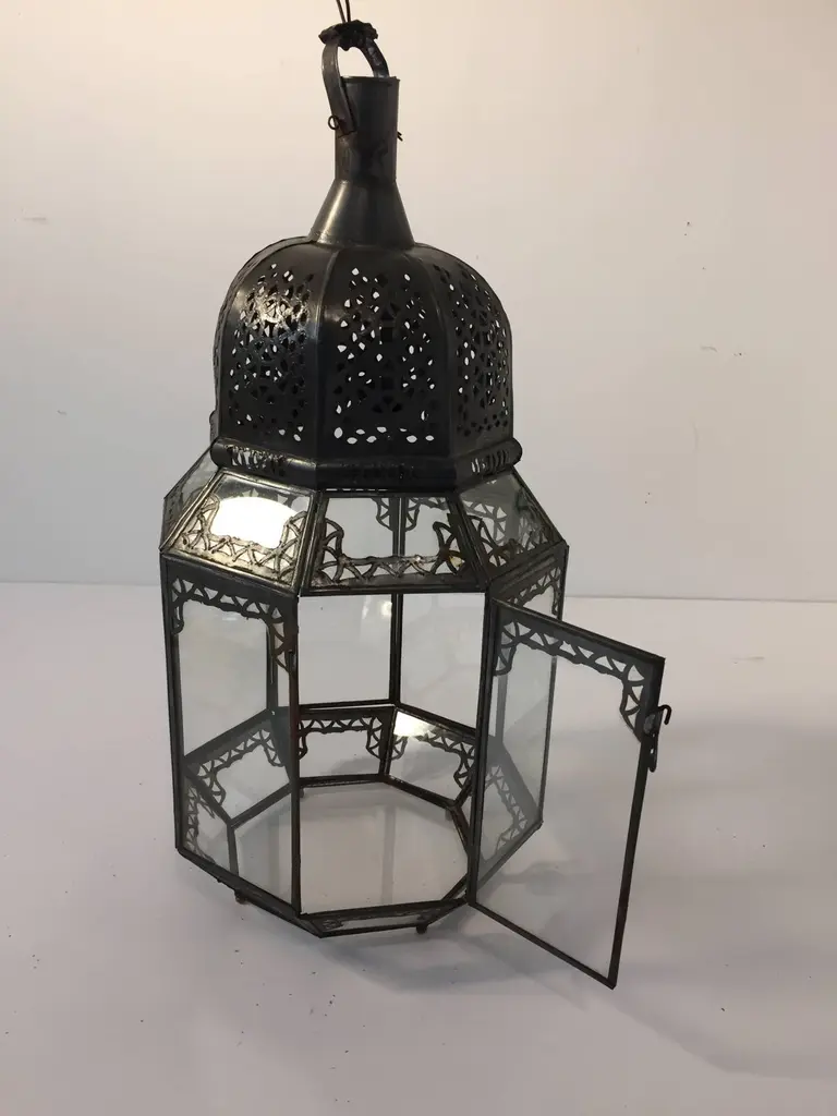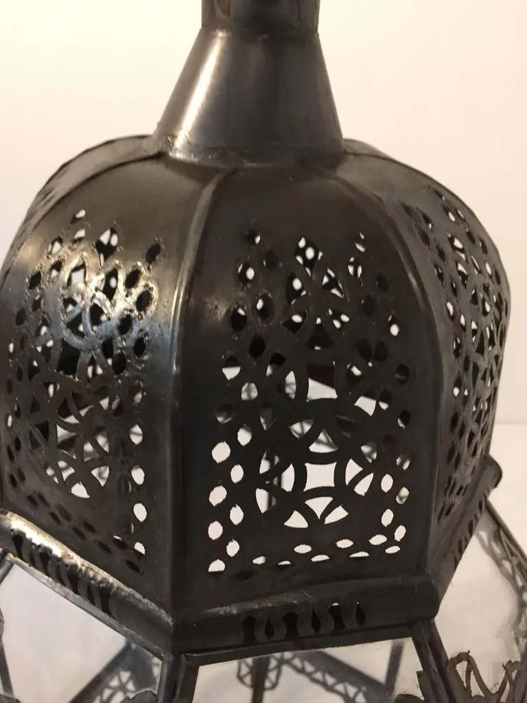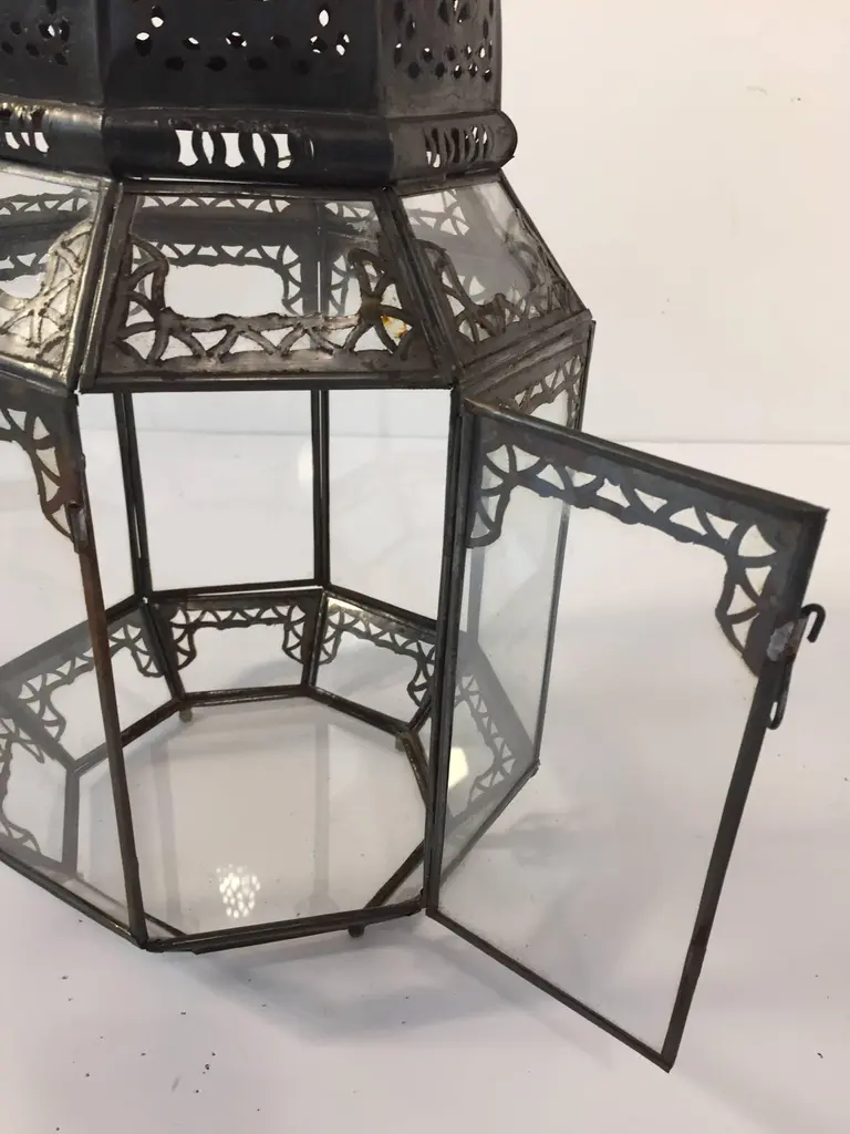 Vintage Moroccan Moorish clear glass lantern with intricate metal filigree.Octagonal shape, delicately handcrafted by artisans in Morocco.Bronze metal color finish.Could be used with candle or rewired for electricity as a Moroccan pendant or wall sconce.Multiple available contact us.Dimensions: 20 in. H x 10 in. D.For indoor use or covered area only.About the Moroccan lanterns:The metal and glass hand-crafted lantern from Morocco is a captivating pieces of artistry that combines the rich cultural heritage and exquisite craftsmanship of the region. Its design reflects the traditional Moroccan style, which is renowned for its intricate detailing and vibrant aesthetic. This vintage Moroccan lantern is meticulously handcrafted using a combination of metal and glass, resulting in a stunning blend of materials that enhances its overall beauty. The framework of the Moorish lantern is skillfully constructed from metal which provides a sturdy foundation and intricate patterns. The metalwork adorning the Moroccan light fixture features intricate filigree patterns, geometric motifs, and delicate scrollwork, all meticulously hand-cut by skilled Moroccan artisans in Marrakech.These ornate Moorish designs create mesmerizing shadows when the Moroccan hanging lantern is illuminated, casting enchanting patterns that dance across the surroundings. The glass components of the Moroccan lantern add a touch of elegance and brilliance to its appearance.Clear and multicolor glass panels are carefully inserted into the metal framework.These panels may showcase traditional Moroccan geometric Islamic designs. When the Moroccan lantern is lit from within, the glow emanating through the colorful glass panels transforms the surrounding space into a warm and inviting atmosphere.The interplay of light and shadow created by the intricate metalwork and the translucent glass adds depth and allure to the lantern's overall charm. The craftsmanship of this Moroccan light fixture is a testament to the dedication and skill of the artisans who meticulously handcraft each piece. The attention to detail, the artistic flair, and the fusion of metal and glass make this Moroccan lantern a true work of art, capturing the essence of Moroccan culture and heritage.Whether displayed as a centerpiece or hung from a hook, this metal and glass handcrafted lantern from Morocco effortlessly evokes a sense of enchantment, transporting you to the vibrant streets and magical ambiance of Moroccan nights.