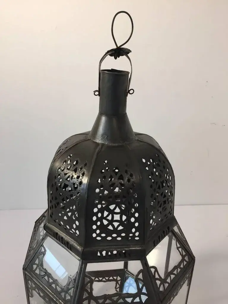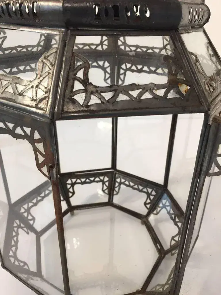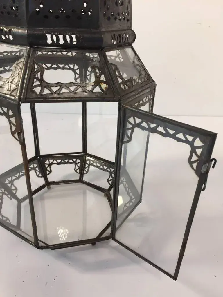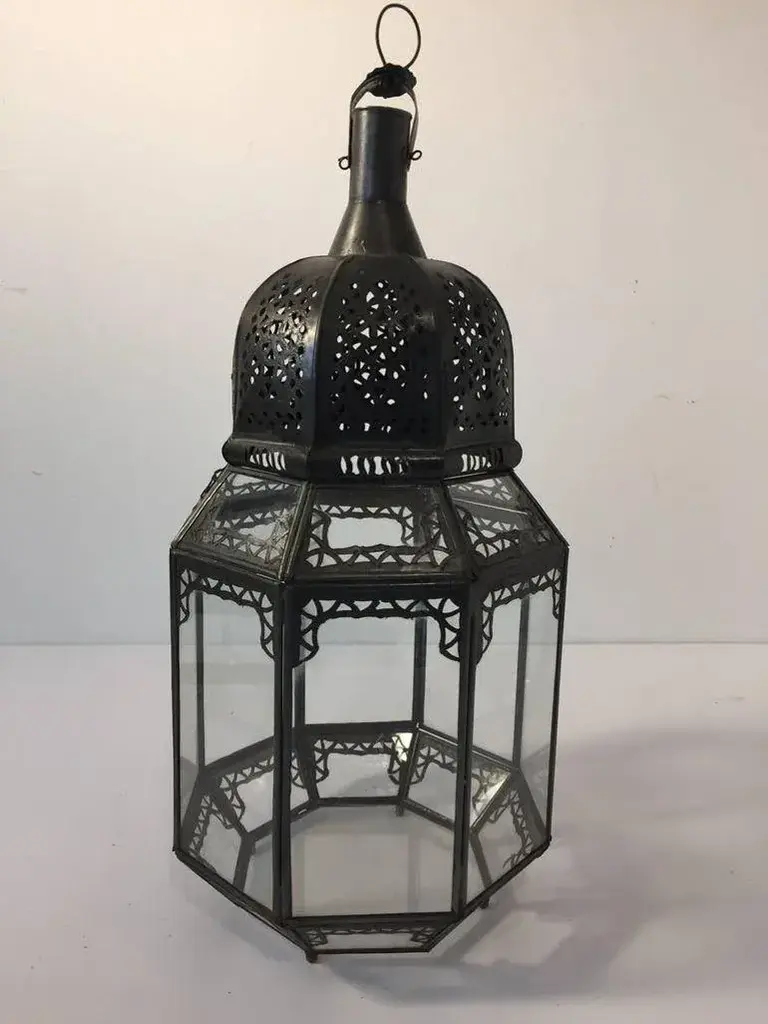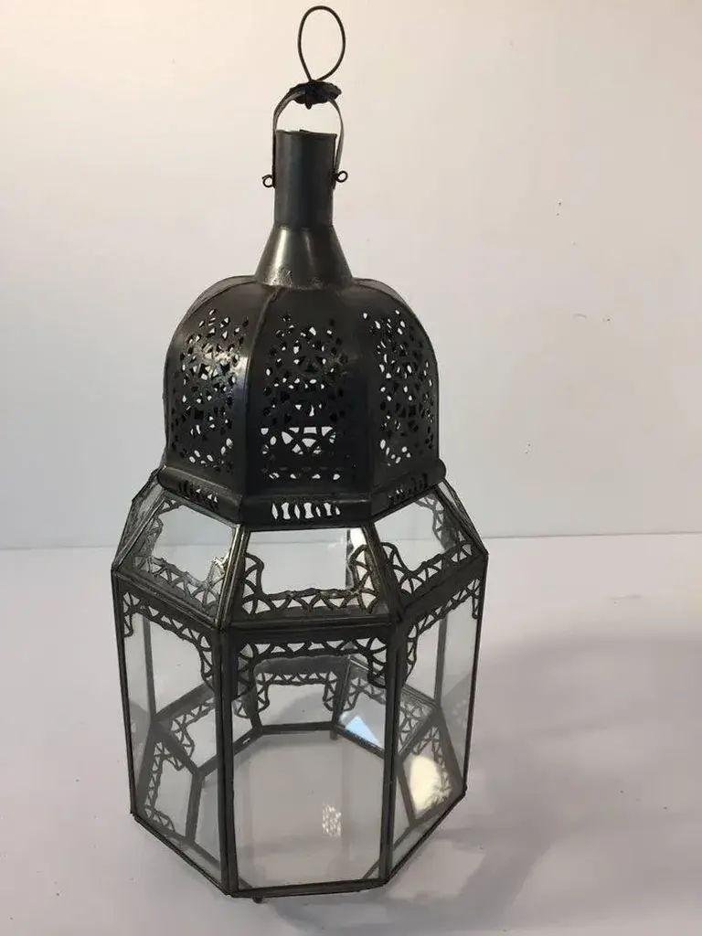Vintage Moroccan Moorish clear glass lantern with intricate metal filigree. Octagonal shape, delicately handcrafted by artisans in Morocco. Bronze metal color finish. Could be used with candle or rewired for electricity as a Moroccan pendant or wall sconce. Multiple available contact us. Dimensions: 20 in. H x 10 in. D. For indoor use or covered area only. About the Moroccan lanterns: The metal and glass hand-crafted lantern from Morocco is a captivating pieces of artistry that combines the rich cultural heritage and exquisite craftsmanship of the region. Its design reflects the traditional Moroccan style, which is renowned for its intricate detailing and vibrant aesthetic. This vintage Moroccan lantern is meticulously handcrafted using a combination of metal and glass, resulting in a stunning blend of materials that enhances its overall beauty. The framework of the Moorish lantern is skillfully constructed from metal which provides a sturdy foundation and intricate patterns. The metalwork adorning the Moroccan light fixture features intricate filigree patterns, geometric motifs, and delicate scrollwork, all meticulously hand-cut by skilled Moroccan artisans in Marrakech. These ornate Moorish designs create mesmerizing shadows when the Moroccan hanging lantern is illuminated, casting enchanting patterns that dance across the surroundings. The glass components of the Moroccan lantern add a touch of elegance and brilliance to its appearance. Clear and multicolor glass panels are carefully inserted into the metal framework. These panels may showcase traditional Moroccan geometric Islamic designs. When the Moroccan lantern is lit from within, the glow emanating through the colorful glass panels transforms the surrounding space into a warm and inviting atmosphere. The interplay of light and shadow created by the intricate metalwork and the translucent glass adds depth and allure to the lantern's overall charm. The craftsmanship of this Moroccan light fixture is a testament to the dedication and skill of the artisans who meticulously handcraft each piece. The attention to detail, the artistic flair, and the fusion of metal and glass make this Moroccan lantern a true work of art, capturing the essence of Moroccan culture and heritage. Whether displayed as a centerpiece or hung from a hook, this metal and glass handcrafted lantern from Morocco effortlessly evokes a sense of enchantment, transporting you to the vibrant streets and magical ambiance of Moroccan nights.