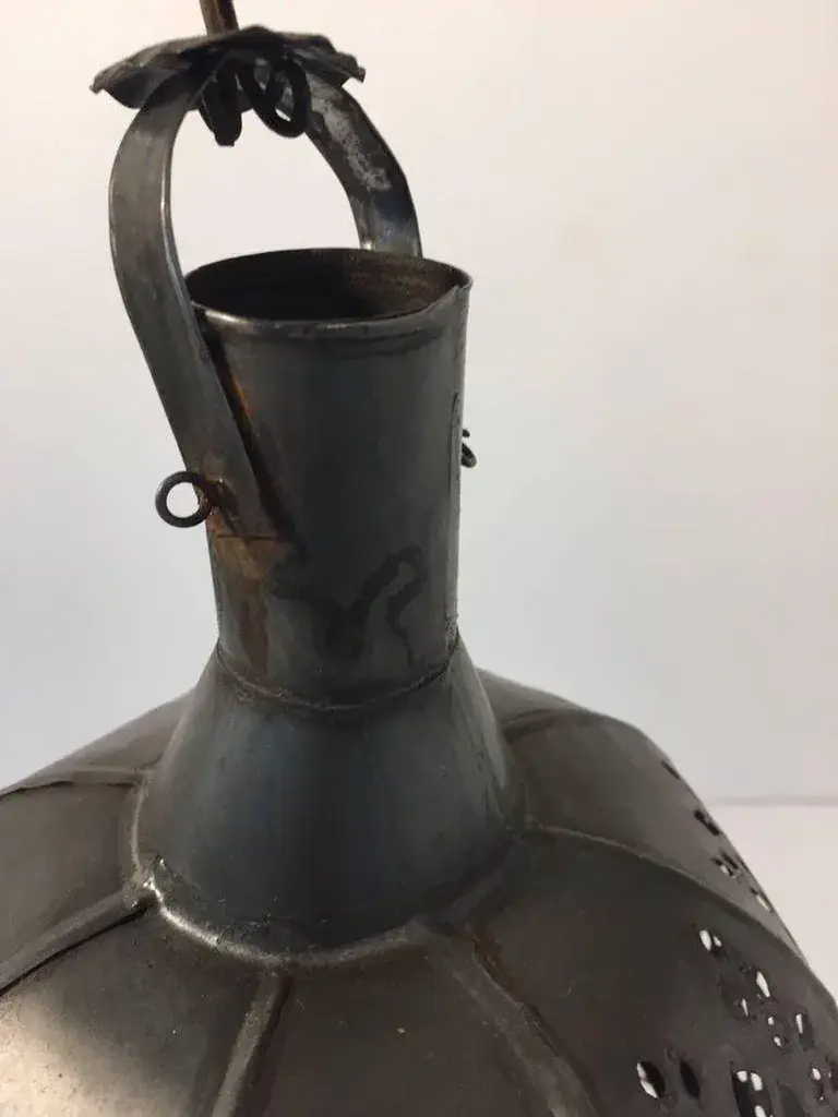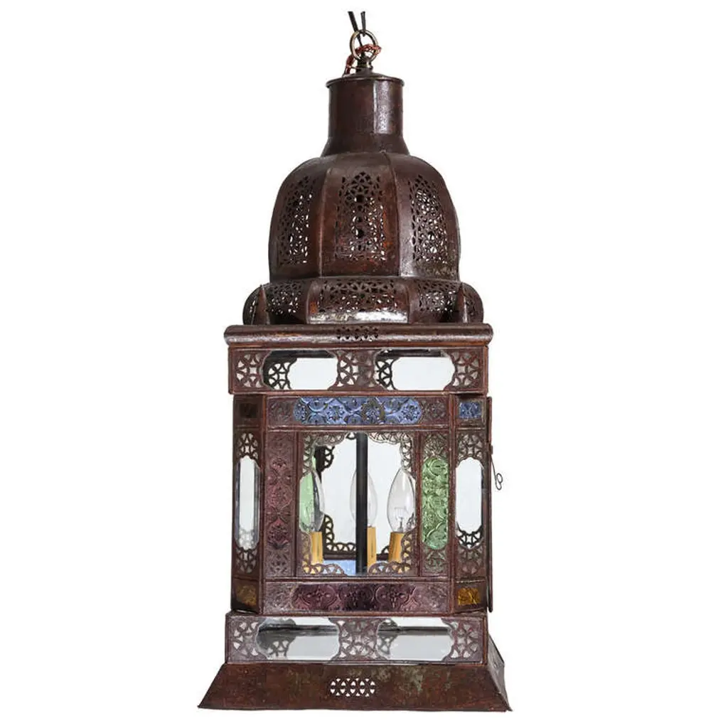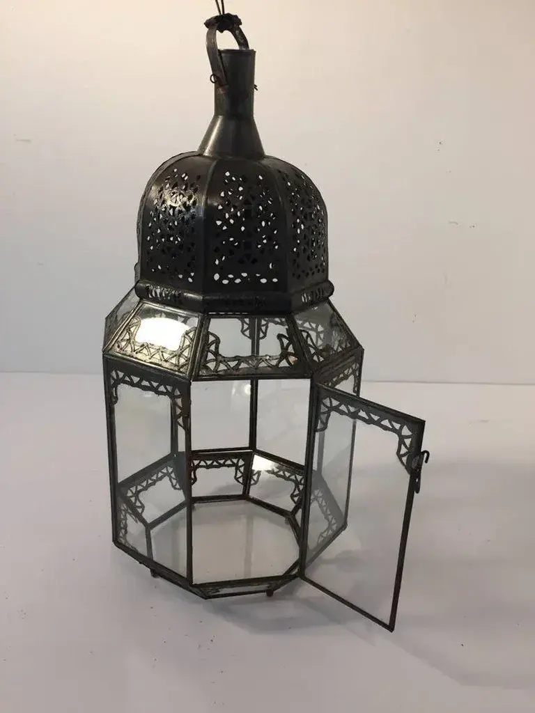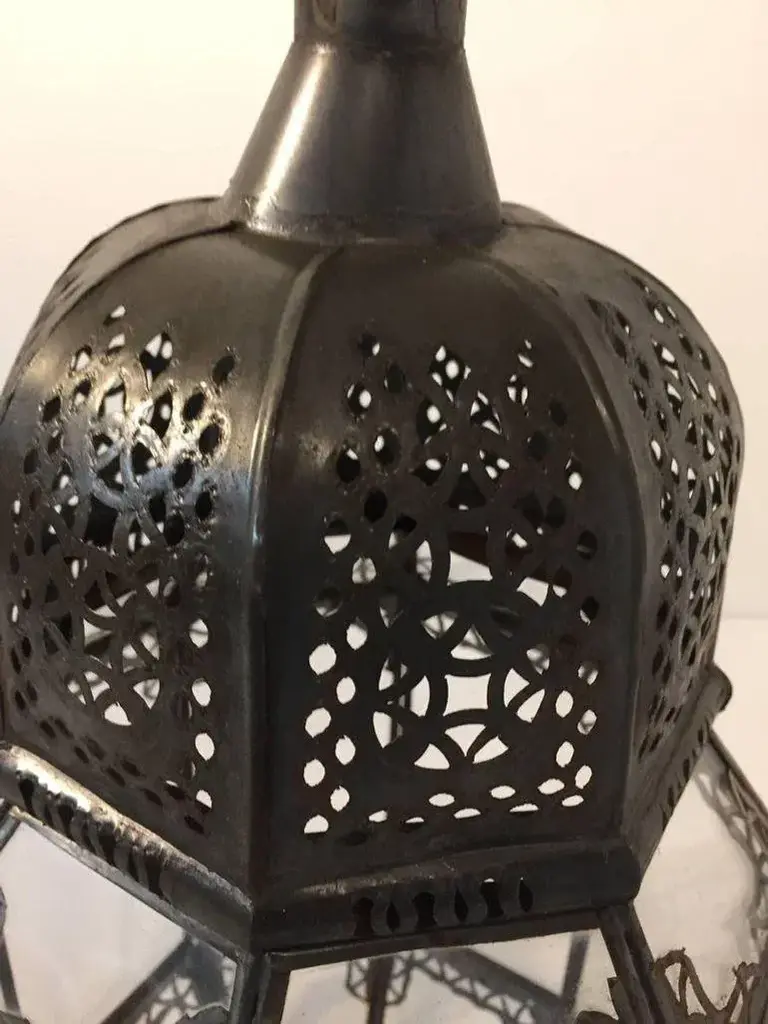 Vintage Moroccan Moorish clear glass lantern with intricate metal filigree. Octagonal shape, delicately handcrafted by artisans in Morocco. Bronze metal color finish. Could be used with candle or rewired for electricity as a Moroccan pendant or wall sconce. Multiple available contact us. Dimensions: 20 in. H x 10 in. D. For indoor use or covered area only. About the Moroccan lanterns: The metal and glass hand-crafted lantern from Morocco is a captivating pieces of artistry that combines the rich cultural heritage and exquisite craftsmanship of the region. Its design reflects the traditional Moroccan style, which is renowned for its intricate detailing and vibrant aesthetic. This vintage Moroccan lantern is meticulously handcrafted using a combination of metal and glass, resulting in a stunning blend of materials that enhances its overall beauty. The framework of the Moorish lantern is skillfully constructed from metal which provides a sturdy foundation and intricate patterns. The metalwork adorning the Moroccan light fixture features intricate filigree patterns, geometric motifs, and delicate scrollwork, all meticulously hand-cut by skilled Moroccan artisans in Marrakech. These ornate Moorish designs create mesmerizing shadows when the Moroccan hanging lantern is illuminated, casting enchanting patterns that dance across the surroundings. The glass components of the Moroccan lantern add a touch of elegance and brilliance to its appearance. Clear and multicolor glass panels are carefully inserted into the metal framework. These panels may showcase traditional Moroccan geometric Islamic designs. When the Moroccan lantern is lit from within, the glow emanating through the colorful glass panels transforms the surrounding space into a warm and inviting atmosphere. The interplay of light and shadow created by the intricate metalwork and the translucent glass adds depth and allure to the lantern's overall charm. The craftsmanship of this Moroccan light fixture is a testament to the dedication and skill of the artisans who meticulously handcraft each piece. The attention to detail, the artistic flair, and the fusion of metal and glass make this Moroccan lantern a true work of art, capturing the essence of Moroccan culture and heritage. Whether displayed as a centerpiece or hung from a hook, this metal and glass handcrafted lantern from Morocco effortlessly evokes a sense of enchantment, transporting you to the vibrant streets and magical ambiance of Moroccan nights.