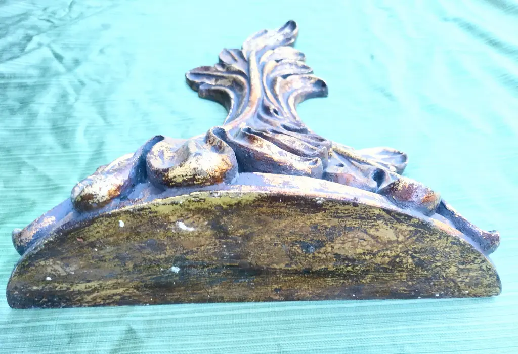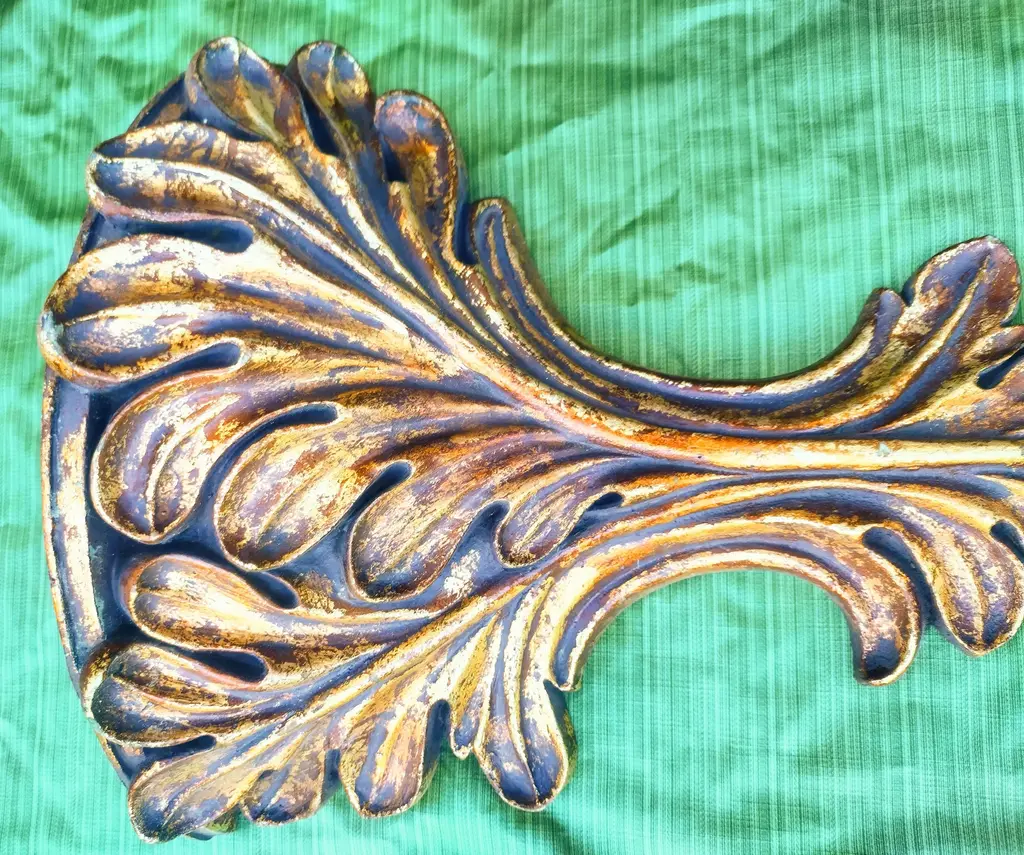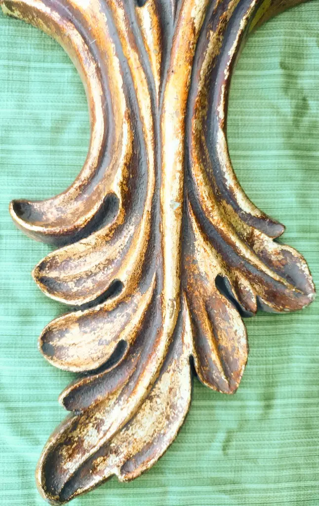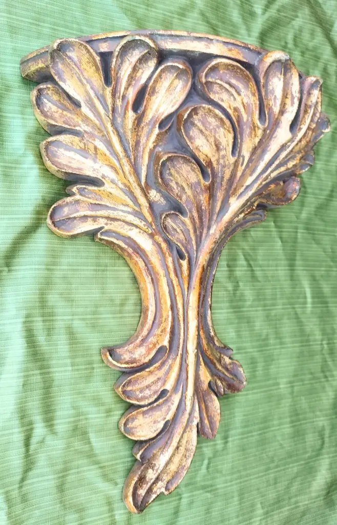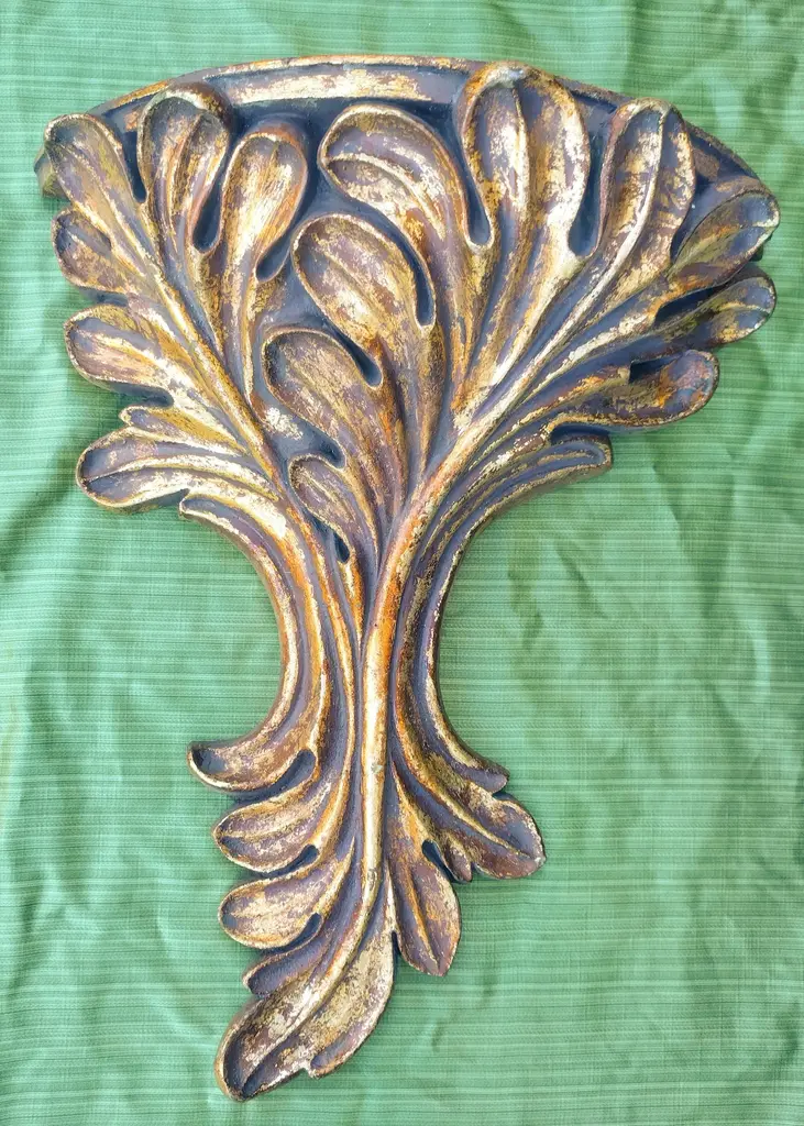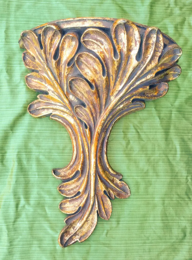 A beautiful unusual very large gold gilt fig leaf or palm leaf wall sconce shelf. This is such a wonderful piece and is very big so it makes a big impact. Place a ginger jar on top and you'll have a wonderful room accessory. I have 3 available.