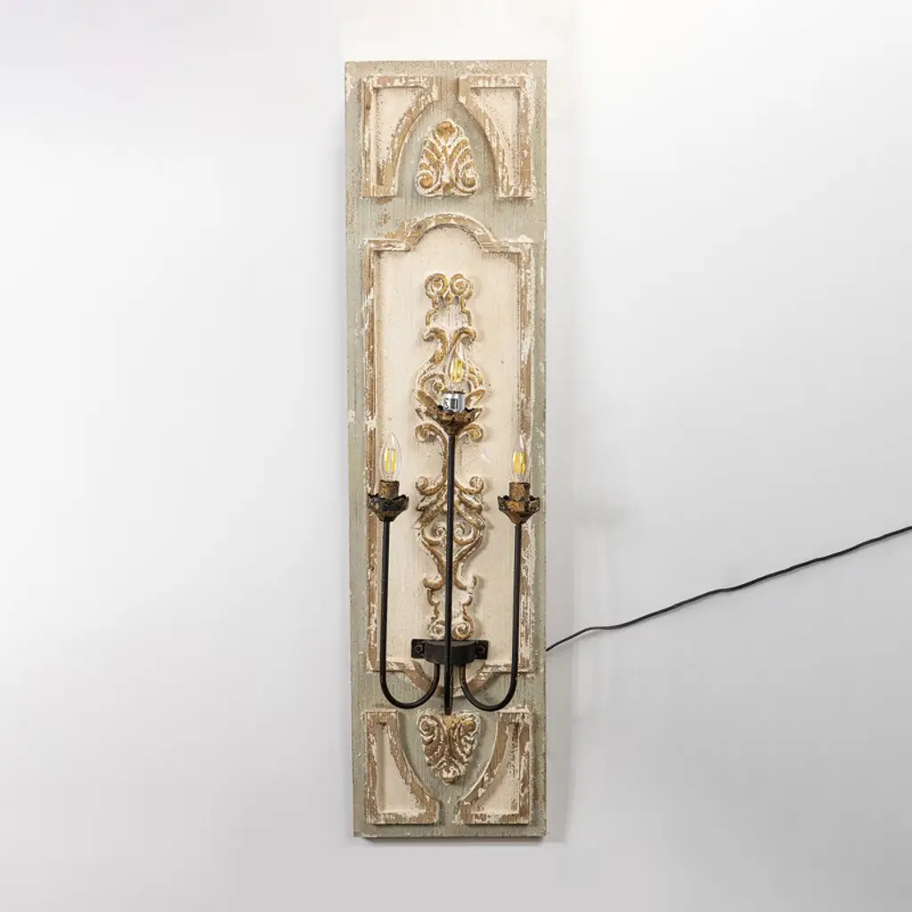 This stunning wall sconce features a vintage-inspired design with an ornate backplate that showcases a distressed gold and black finish, adding character and charm. The sconce holds three candle-like bulbs, each set in glass holders that enhance the elegant aesthetic. The sweeping arms create a graceful silhouette, making it a perfect choice for adding warmth and sophistication to a living room, hallway, or dining area. The combination of textures and finishes makes this piece a striking focal point in any decor setting. #Metal Art #Large Wall Art #wall sconces modern #wall sconces lights #wall light #sconces wall decor #designer wall light #handmade furniture #wall sconce #metal wall light