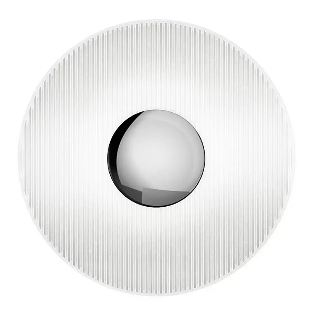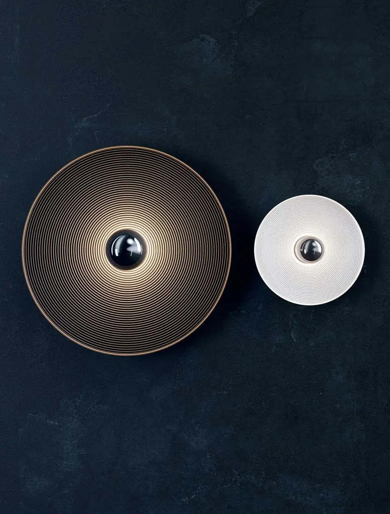 An extremely graphic lamp, Vinyl is made up of a metal plate with a circular engraved texture reminiscent of a music record, emulating sound vibrations whilst dividing the light in a captivating manner to the human eye.Vinyl is a versatile, spun metal ceiling and wall lamp, but it is also perfect as a suspension lamp. It is available in two sizes, 60 and 32 cm, and two finishes: silver and deep black. For wall and ceiling versions it is recommended to use shielded light bulbs for an indirect, grazing light effect on the surface, which will seem to vibrate. Its dynamic design makes this decorative lamp perfect for public spaces. Spin the vinyl and enjoy the light!Additional Information:Materials: Metal diffuser with black structureColor: Deep blackLight Source: LED Medium base 1 max 25WBulbs not included Dimensions: ø 32 x 11.5 H cmAvailable in other color option: SilverAvailable in other size option: Large