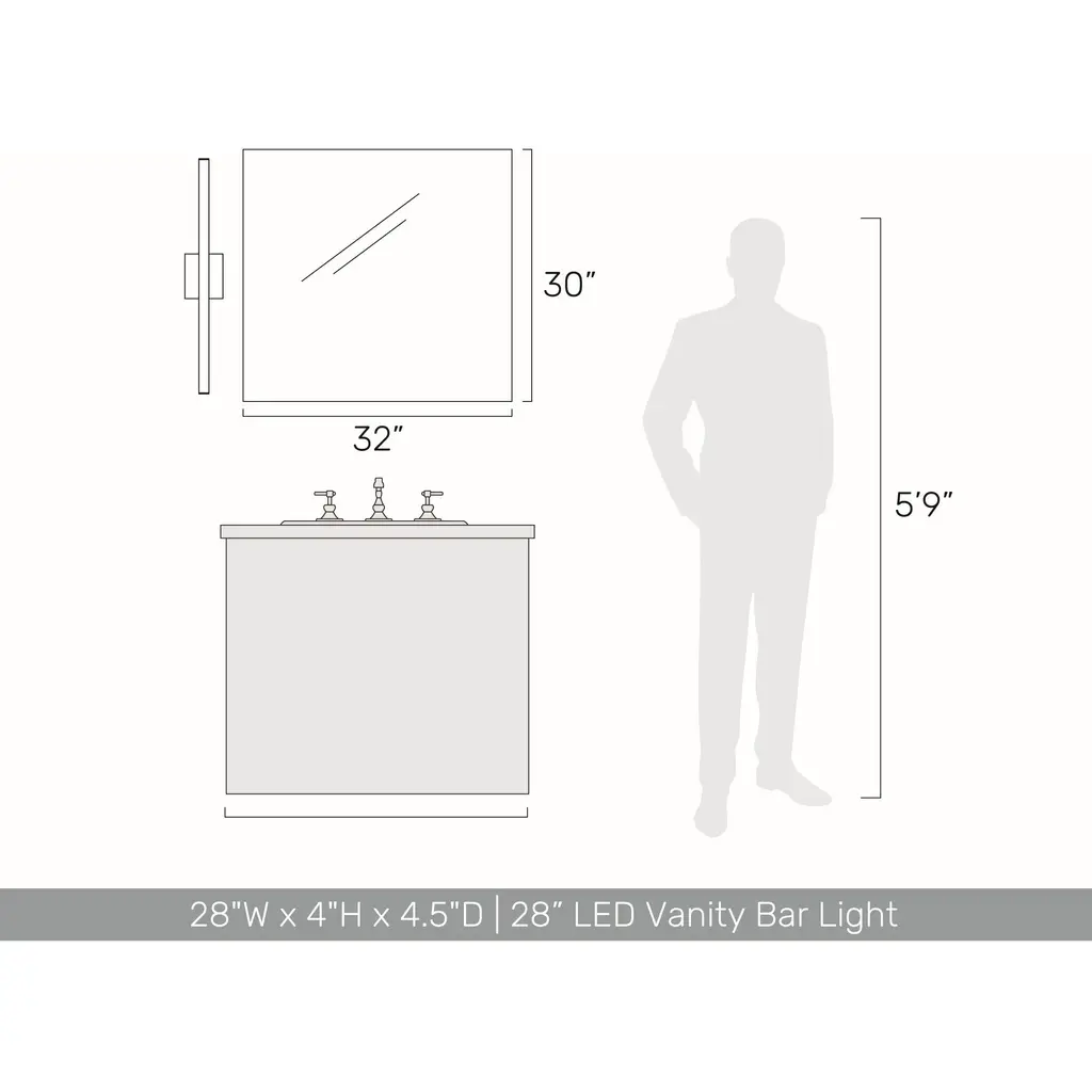 Bring modern elegance into your home with the Golden Lighting Vireo Integrated LED 28in Vanity in Walnut. Featuring a sleek design without a shade, it creates a welcoming atmosphere. The walnut finish captures the rich warmth of classic wood, ensuring a sophisticated, easy-to-clean glow. Perfect for brightening up bathrooms, it is damp location rated, suitable for covered and semi-enclosed spaces with occasional moisture. The overall dimensions are 28"W x 4"H x 4.5"D, equipped with integrated LED technology providing 900 rated lumens and a 3000K warm glow. Illuminate your space with this stylish yet practical lighting solution, perfect for any contemporary design.