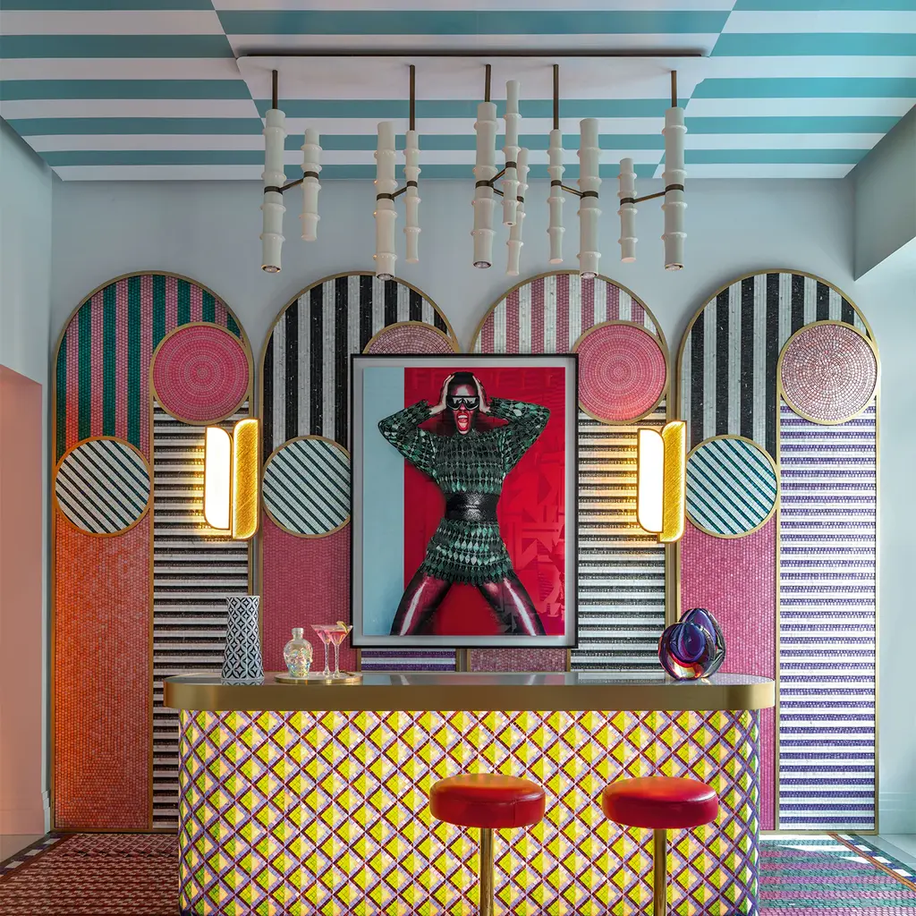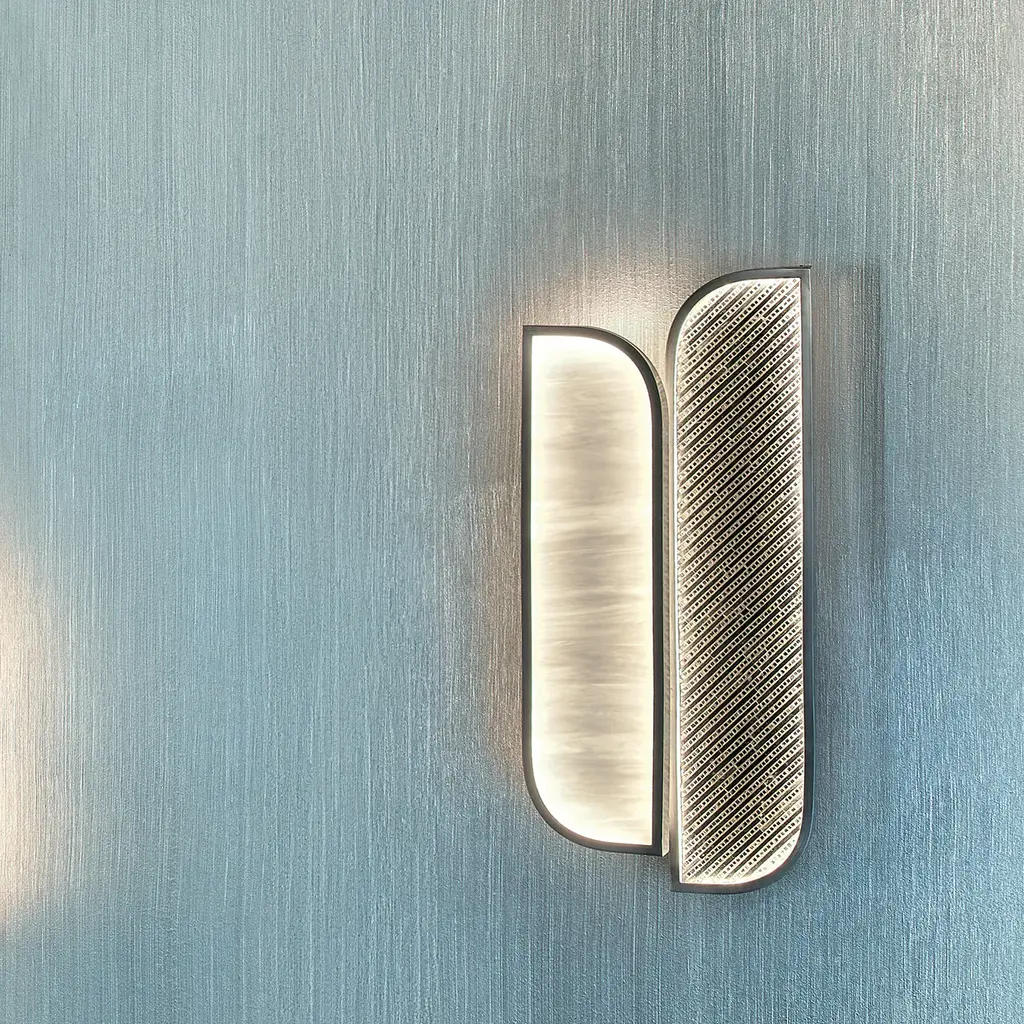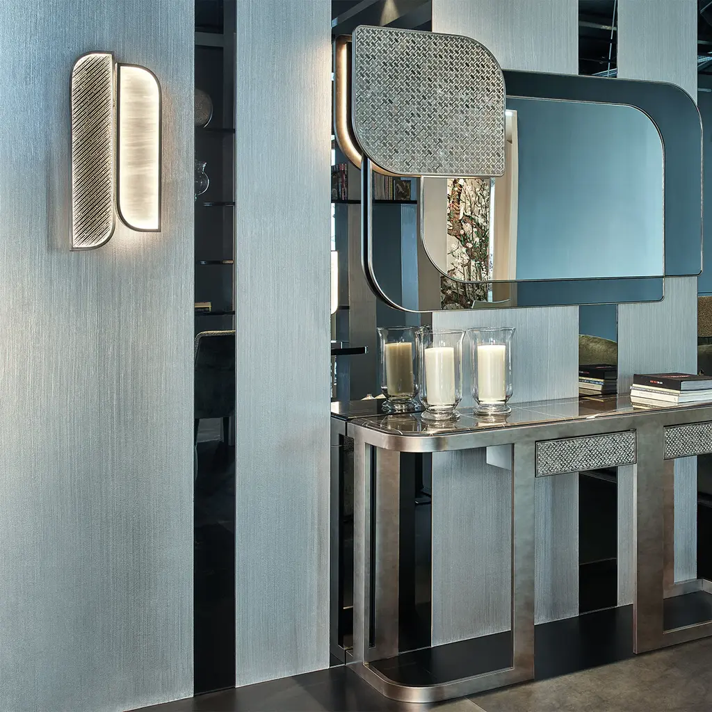 Part of the retro-chic collection, this sconce by Massimiliano Raggi features two mirroring elements of different sizes that celebrate the harmonious coexistence of contrasts. This refined piece is made of metal with the small brass element finished in antique silver, while the other is covered throughout with a mosaic made up of tiny tesserae and inserts in Alicrite. The piece is lit with two LED strips max 22.2 W 3000L color temperature and 2473 lumens. The default voltage is 220V, however other voltages can be requested. This sconce is CE certified.