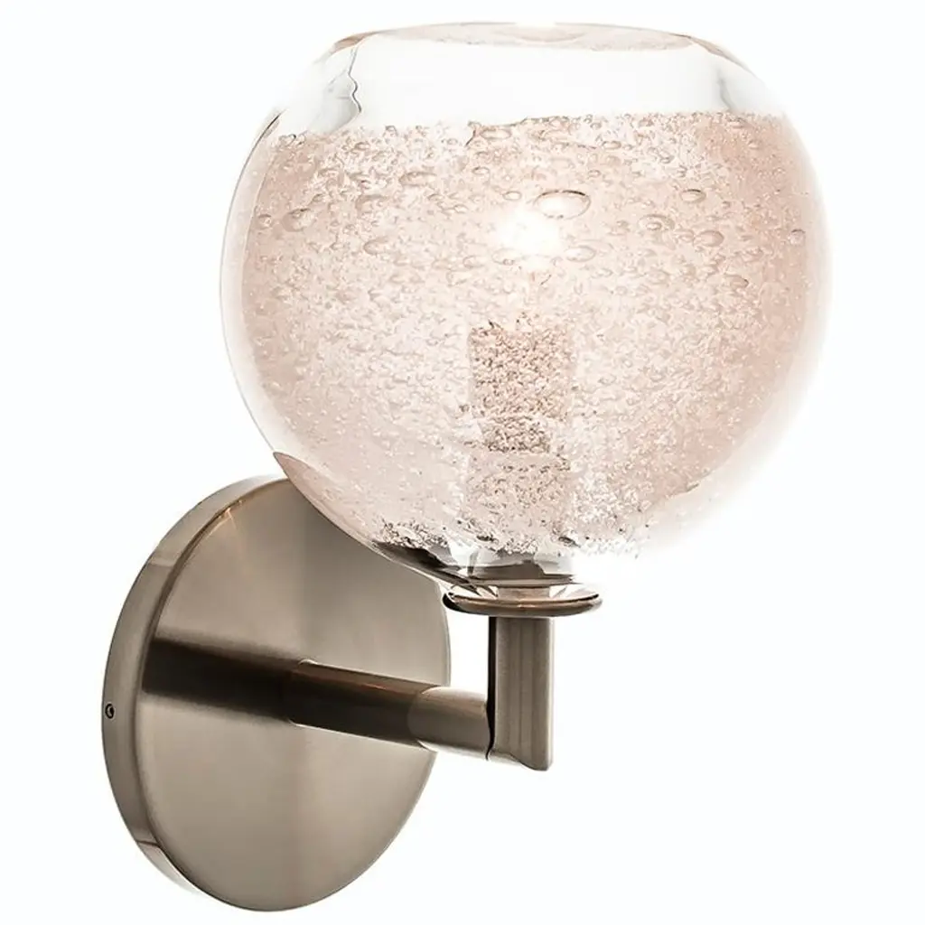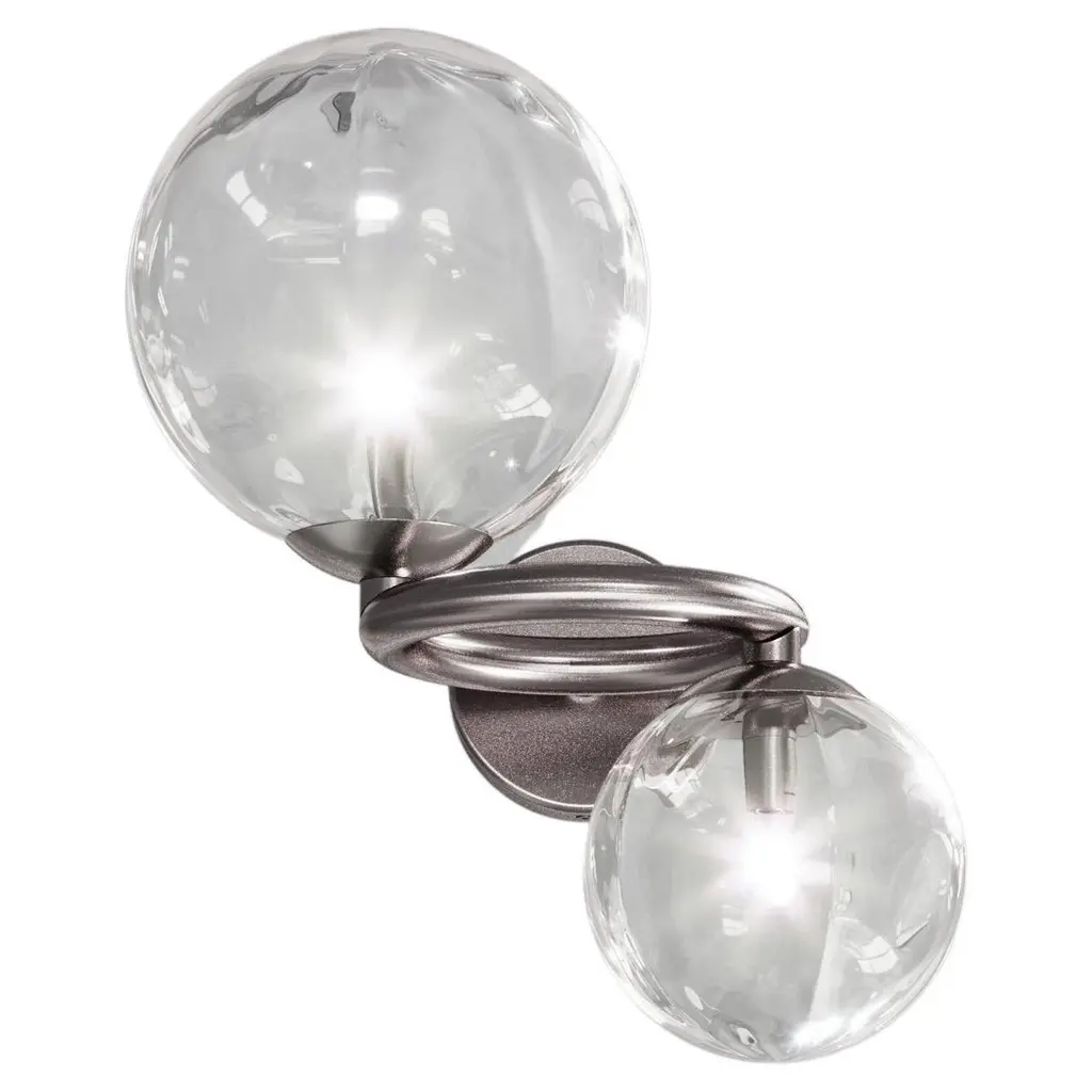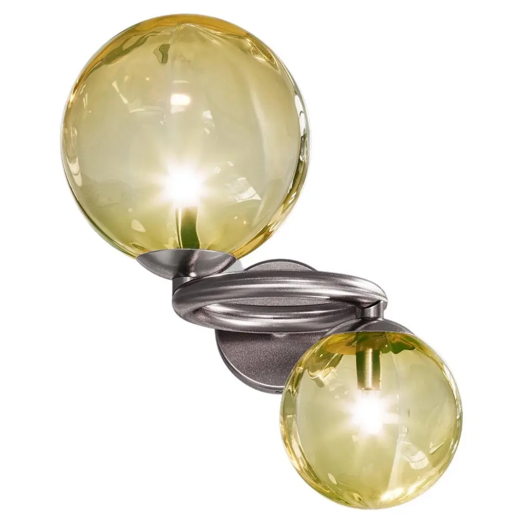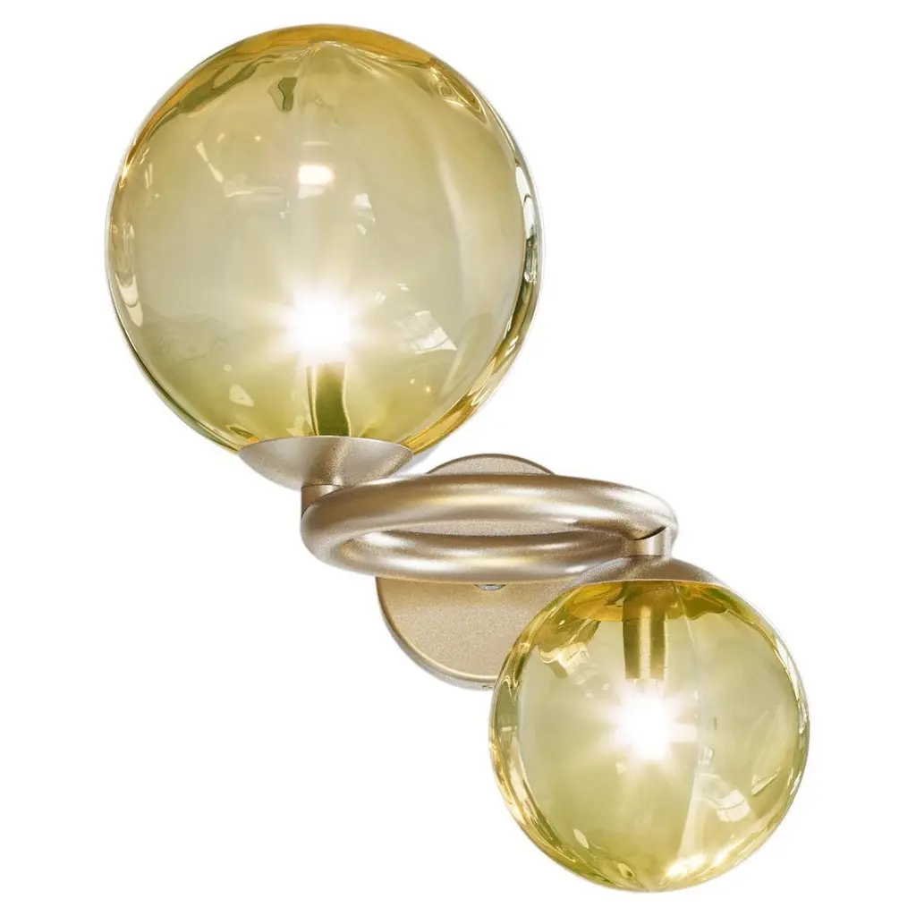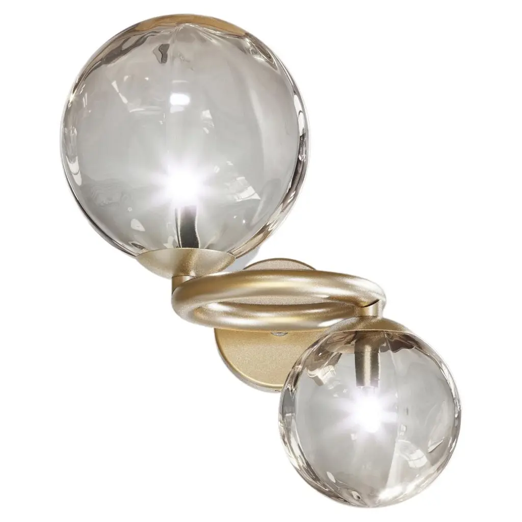 The distinctive feature of this model from the Puppet Ring collection are the rings with increasing diameter. They can be combined in different sequences to form the framework on which the precious glass spheres in three different sizes are placed, blending with the structure thanks to a preformation inside the blown glass. Aesthetically light and elegant, Puppet Ring ethereally combines crystal, smoky, amber and shaded white glass with gold and black matt nickel finishes.Specifications:Material: GlassLight source: G9 ULNo of bulbs: 2x60W G9 UL (120V/60HZ)Dimmer: DIM 1Year: 2019Glass finish: Crystal TransparentFrame finish: Matt Gold 3Dimensions: 22 W x 27 D x 44 H cmAvailable in other glass finish options: Amber Transparent, White Shaded, Smoky TransparentAvailable in other frame finish option: Matt black nickelPlease inquire about customization options.