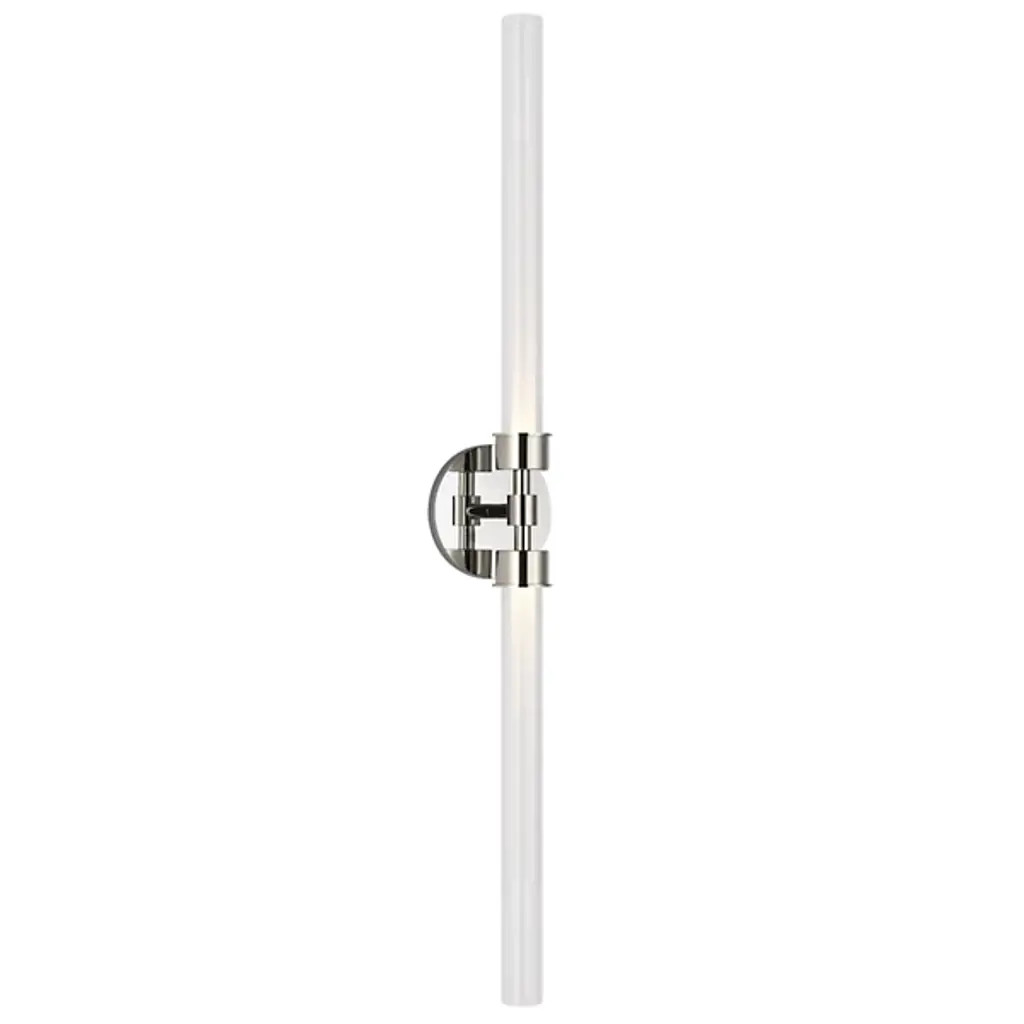 LED Wall Sconce in Polished Nickel finish. Number of Bulbs 2. Max Wattage 11.00 . No bulbs included. Two glass spurs dramatically extend in opposite directions, illuminated by a compact diffused LED light source. The Spur Wall Sconce by Sean Lavin for Visual Comfort is offered in modern finishes. Mounting options include vertical or horizontal, great for any bathroom or vanity lighting. Lamping options are compatible with most dimmers. Refer to Dimming Chart for more information. No UL Availability at this time.