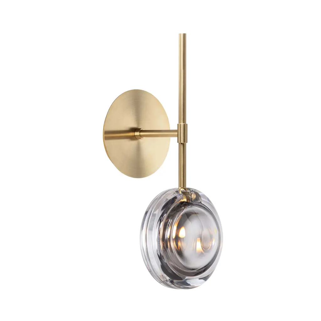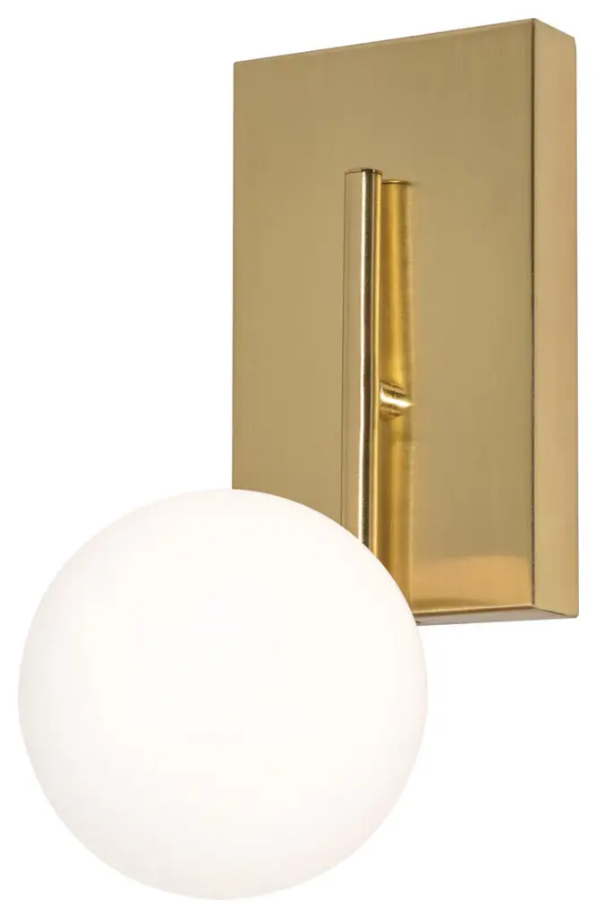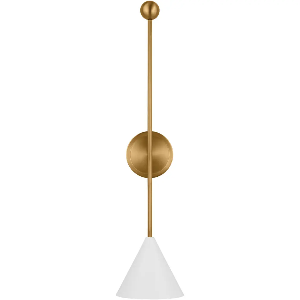 LED Wall Sconce in Natural Brass finish. Number of Bulbs 1. Max Wattage 7.70 . No bulbs included. The Crosby Medium Sconce by AvroKO for Visual Comfort blends the radiance of 1970''s Italian flair, with a striking yet simple design. Distinctive to its musical delicacy, the glossy black metal armature yields to an elegant brass "harp" holding a glass globe dispersing light fluidly and illuminating any space with perfection. No UL Availability at this time.