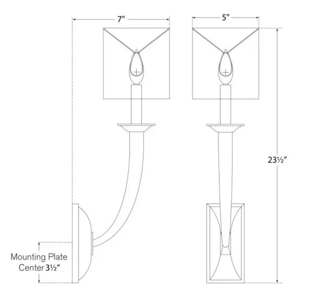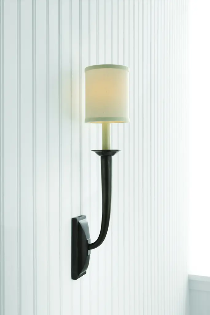 French Deco Horn Sconce in Bronze with Linen Shade Height: 23.5" Extension: 7" Backplate: 3" x 7" Rectangle Mounting: Hardwire Shade Detail: 5" x 5" x 6" Linen Socket: E12 Candelabra Wattage: 60 B11 Safety Rating Location: DRY Note: Requires Smaller Outlet Box