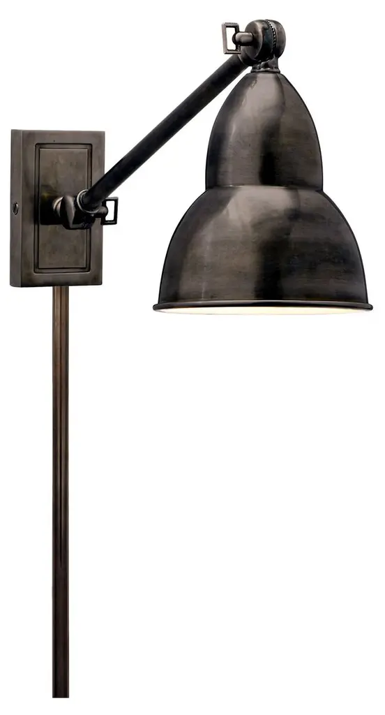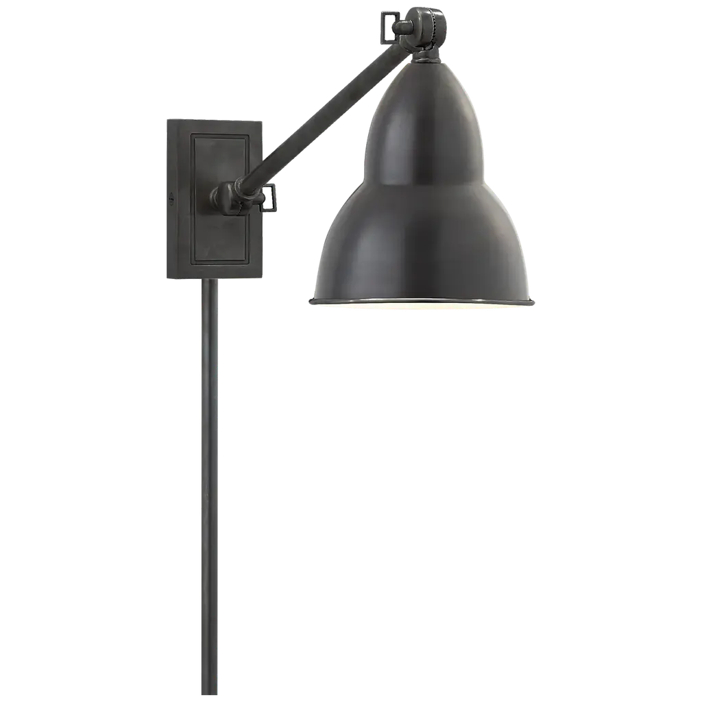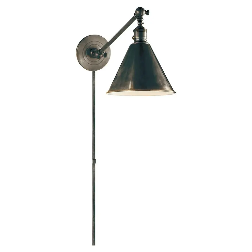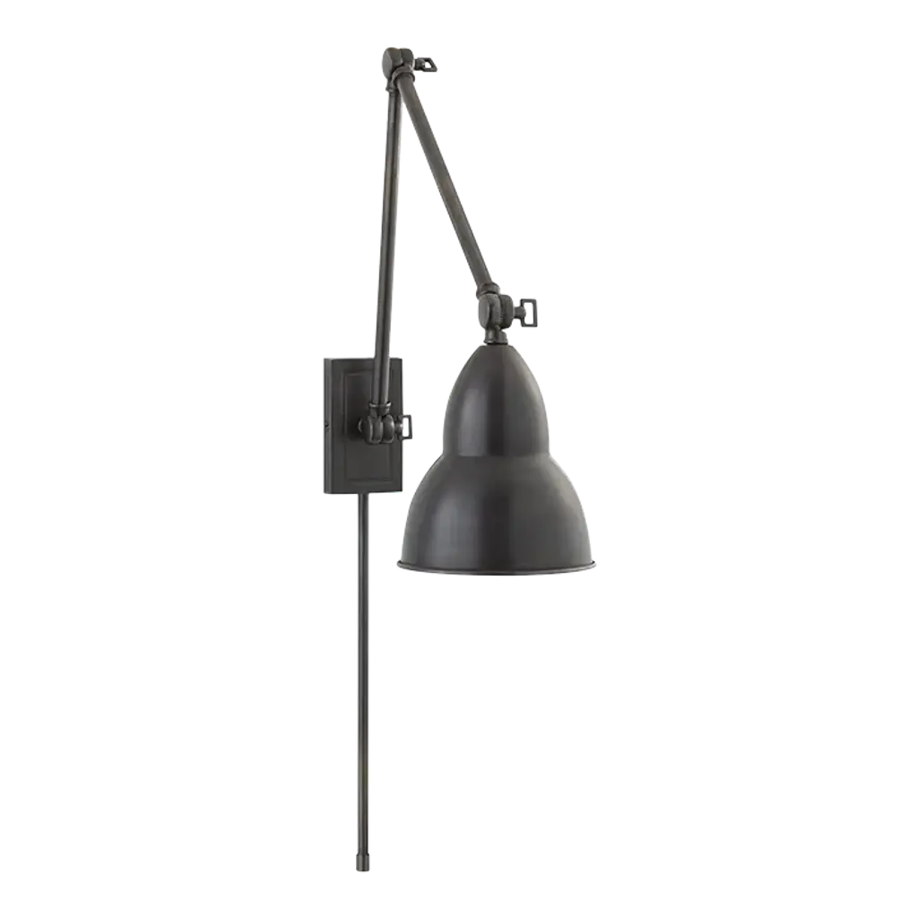 French Library Single Arm Wall Lamp in Bronze Height: 7.5" - 19" Extension: 20" Backplate: 2.5" x 4.5" Rectangle Mounting: Portable Socket: E26 Keyless w/ Line Switch Wattage: 15 LED A Safety Rating Location: DRY Note: Cord Cover Included