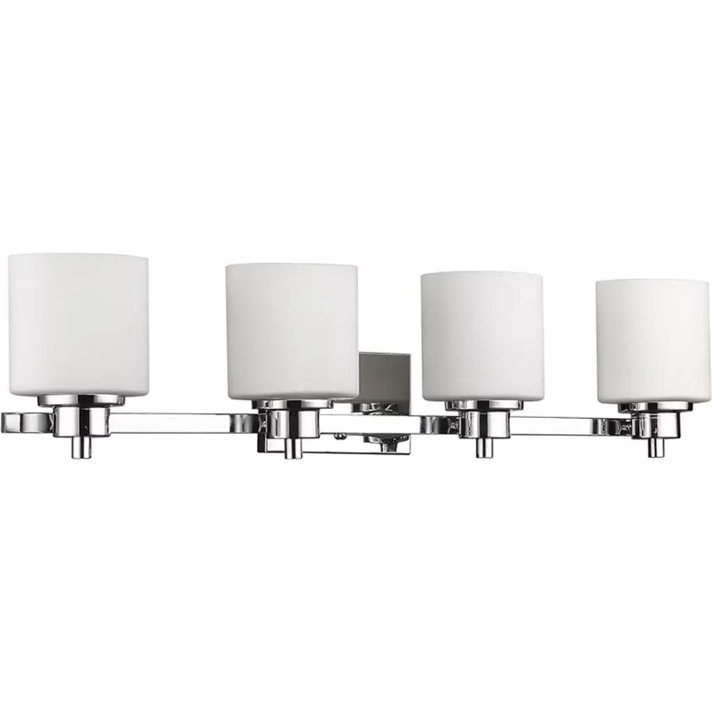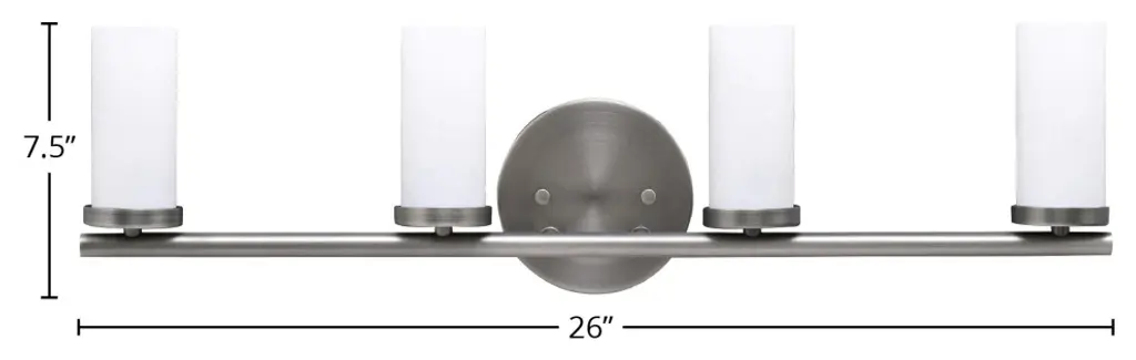 Oak Moore is a universal vanity series available in four finishes. Curved bar detail and etched white shade give it a transitional look. Install the light with glass shades up or down to light up every corner of your room. The shades are made of Etched White glass to cast a soft light throughout your vanity area.Width: 33.88"Height: 10.00"Weight: 4.63 lbBulbs: 4 x 9.00W A19 Medium 800.00lm 3000K, Included