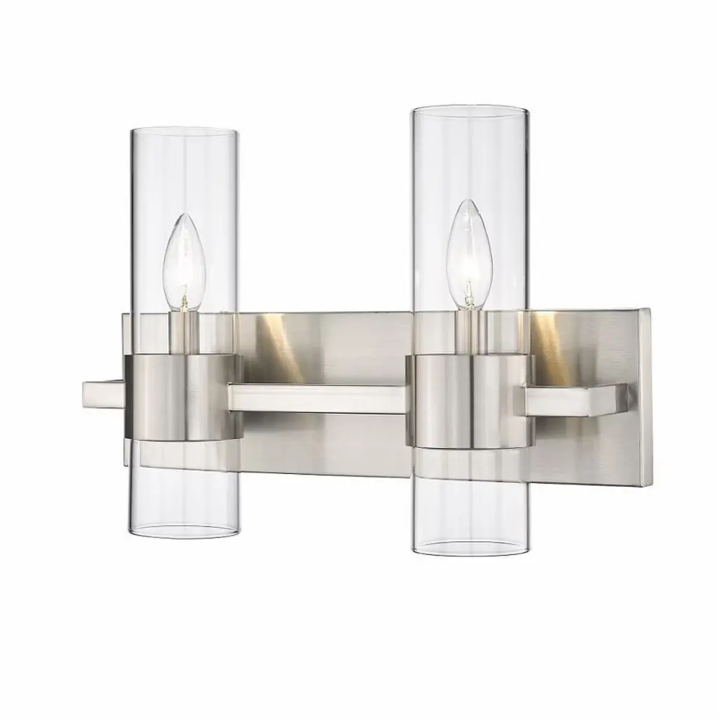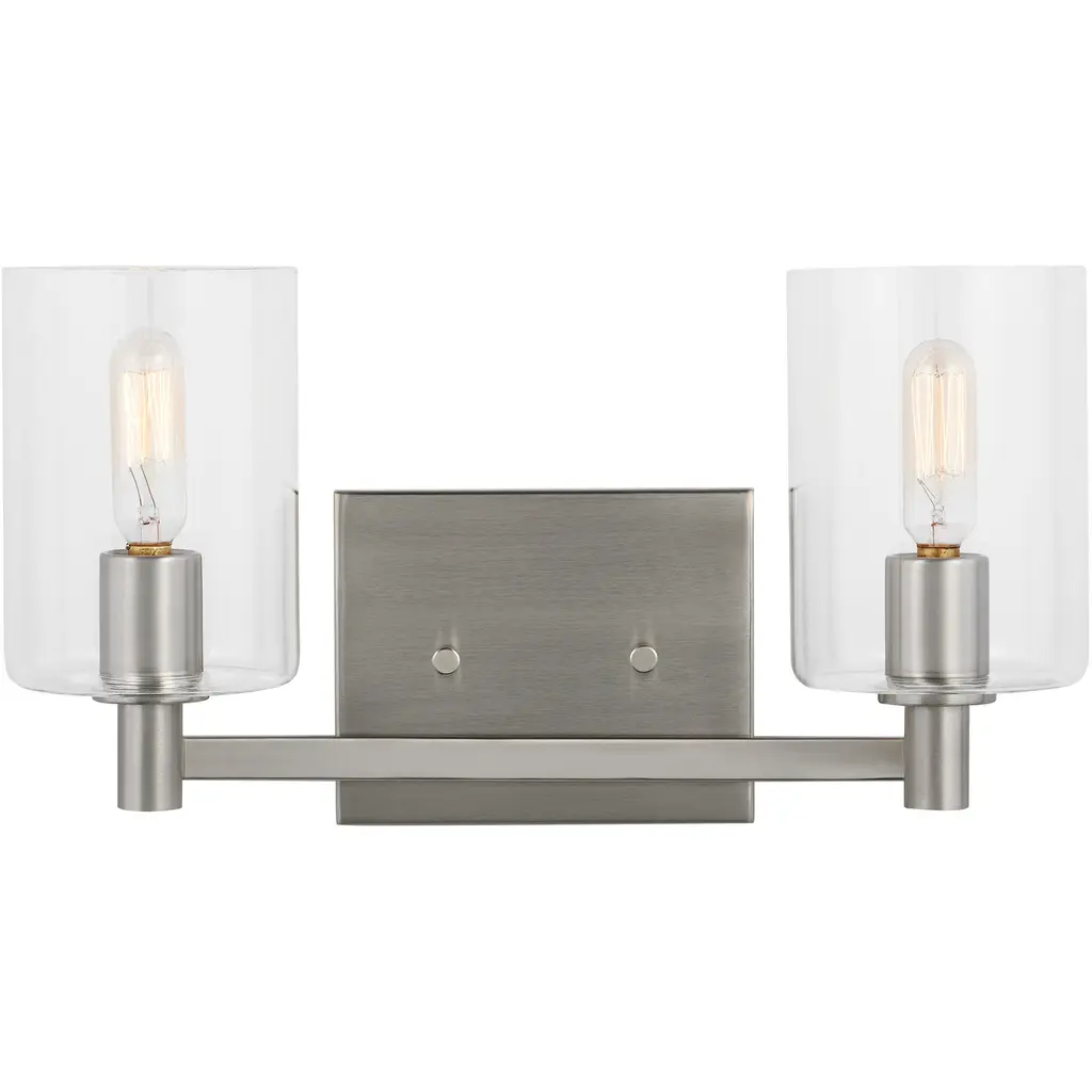 The Fullton two light vanity fixture in Chrome is sleek, contemporary, and uber minimalistic. Visual interest is created using a mix of rectangular and round frames, a subtle design detail. Although this collection is contemporary, it can be mixed in with variety of collections with ease.Width: 14.25"Height: 7.75"Weight: 2.13 lbBulbs: 2 x 3.50W B10 Torpedo Candelabra 350.00lm 2700K, Included