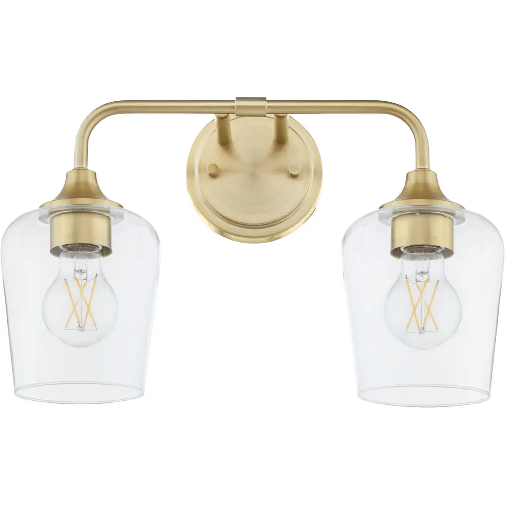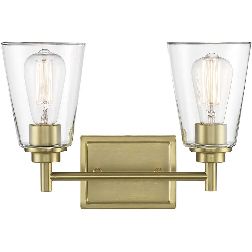 Two Light Bath from Crofton collection in Satin Brass finish. Number of Bulbs 2. Max Wattage 60.00 . No bulbs included. Add a bright burst of light where you need it most with the stylish Drew and Jonathan Crofton Two Light Wall / Bath Sconce, featuring a sleek rectangular metal backplate and clear glass shades. Made to coordinate across a broader range of bath hardware and design styles, the Crofton is available in four popular finishes, Brushed Steel, Chrome, Midnight Black, and Satin Brass. This light looks great on its own or installed above a bathroom vanity, and the glass shades make it ideal for filament bulbs. This fixture may be mounted in the up or down position, and is cETL listed for damp locations, making it the perfect lighting solution for any space. No UL Availability at this time.