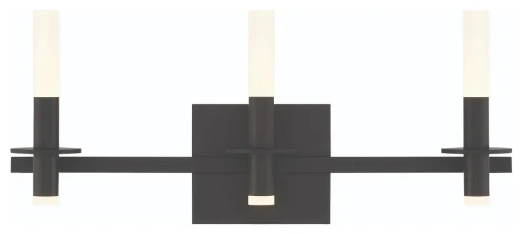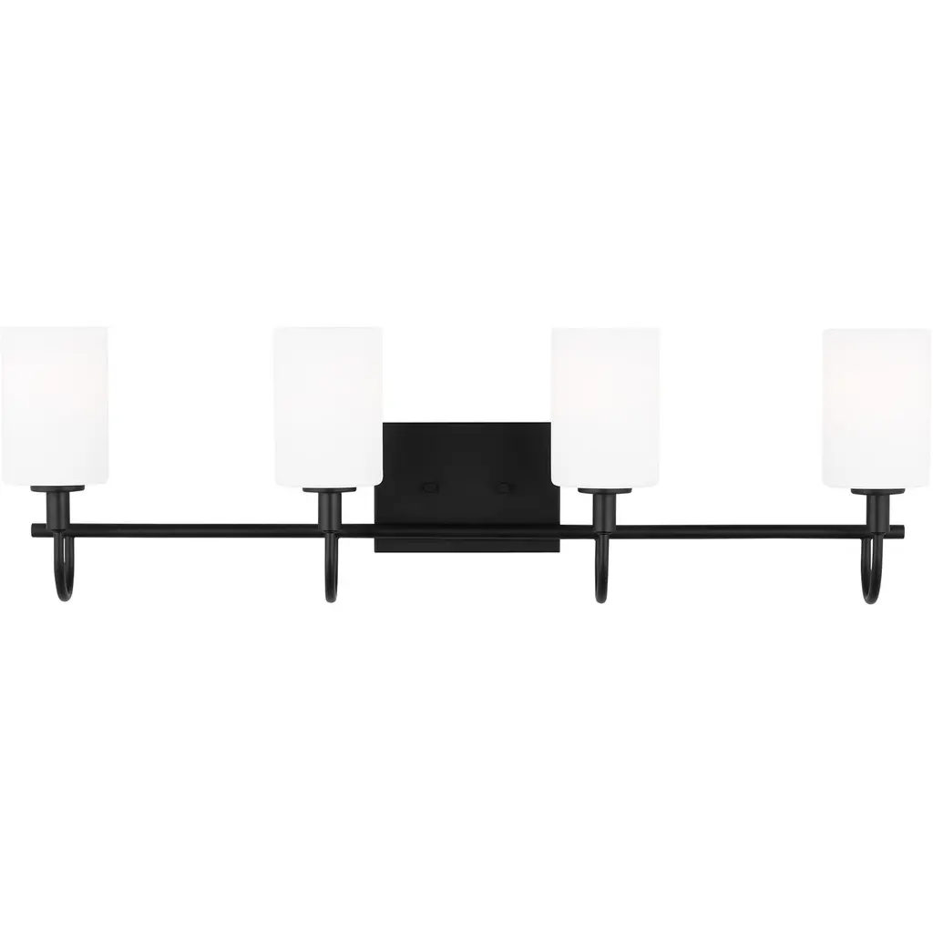 LED Bath Wall Sconce from Oak Moore collection in Midnight Black finish. Number of Bulbs 4. Max Wattage 9.00 . No bulbs included. Oak Moore is a universal vanity series available in four finishes. Curved bar detail and etched white shade give it a transitional look. Install the light with glass shades up or down to light up every corner of your room. The shades are made of Etched White glass to cast a soft light throughout your vanity area. No UL Availability at this time.
