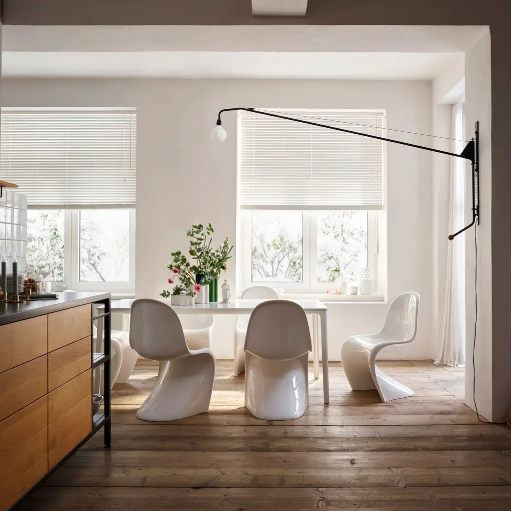 Jean Prouvé’s Potence Wall Lamp is an elegantly minimalist design reduced to the essentials: a light bulb and a pivoting wall mount. This long-swing arm wall light is made from powder-coated tubular steel with an oak wood handle. The lamp is controlled by a cord dimmer. The cord is 78.7” long and the lamp requires a E26 120V 6W 2700K bulb (not included). The Prouvé Potence Wall Lamp measures 43h x 2w x 80"d. Both Jean Prouvé and the chair’s manufacturer, Vitra, are represented in MoMA’s collection.