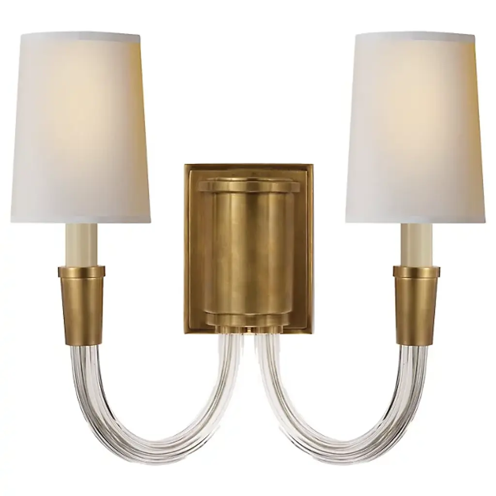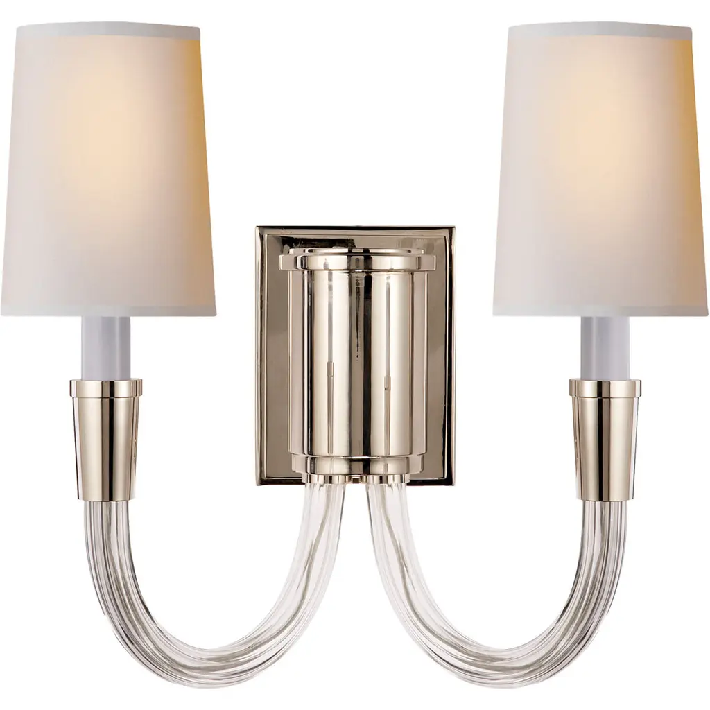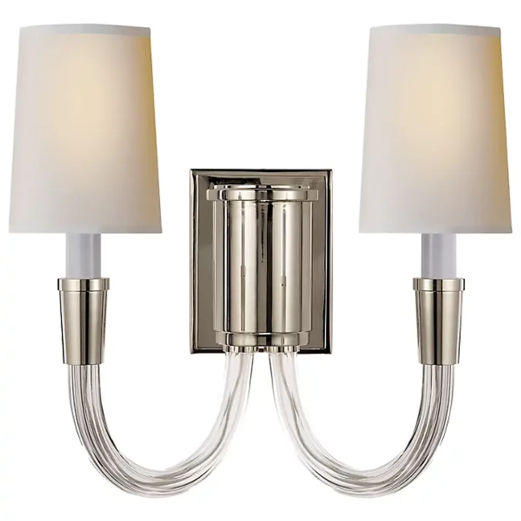 Visual Comfort Signature, formerly known as Visual Comfort,'s Vivian Double Wall Sconce is a beautiful and simple light with curved glass arms that create a little sparkle. A metallic finish graces the body as a Natural Paper shade provides a warm glow that diffuses through the room. The Vivian Double Wall Sconce is a lovely and lustrous laminator that adds a little luxury to your walls.