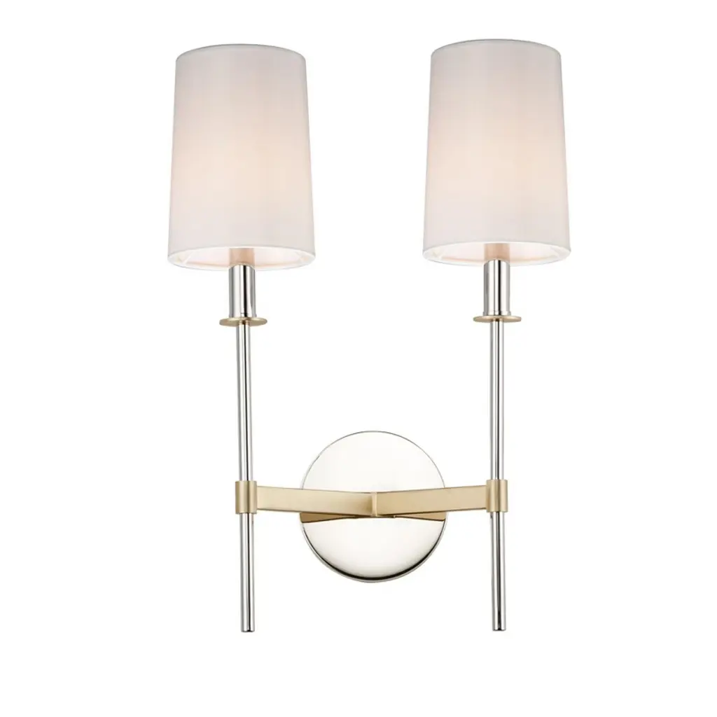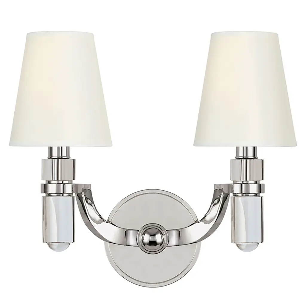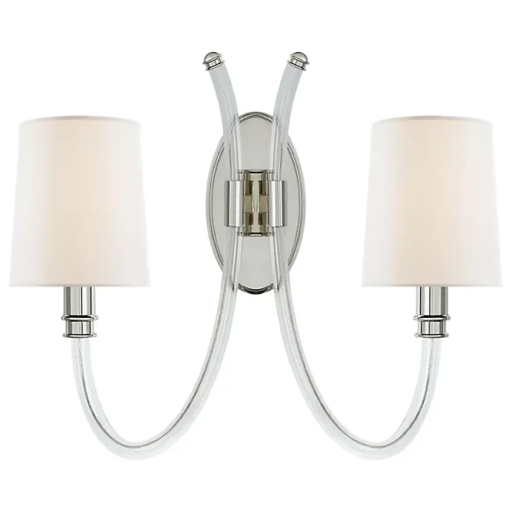 Visual Comfort Signature, formerly known as Visual Comfort,'s Vivian Double Wall Sconce is a beautiful and simple light with curved glass arms that create a little sparkle. A metallic finish graces the body as a Natural Paper shade provides a warm glow that diffuses through the room. The Vivian Double Wall Sconce is a lovely and lustrous laminator that adds a little luxury to your walls.
