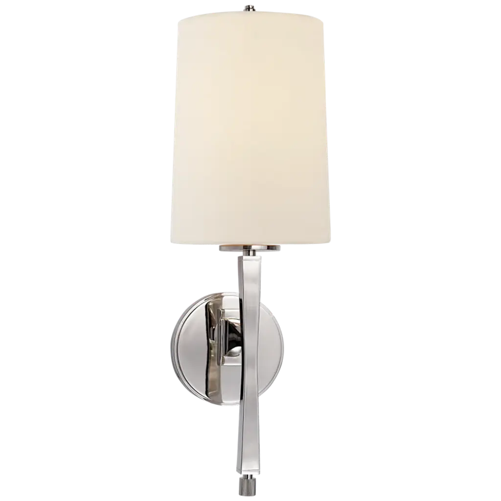 The Hudson Valley Volta Wall Sconce has an air of classic chic that will complement a number of interior spaces. The linen shade is accented with a slight twist, a translucent insert on the support bar. This visual element puts a modern spin on the piece, which is otherwise traditional and classic.