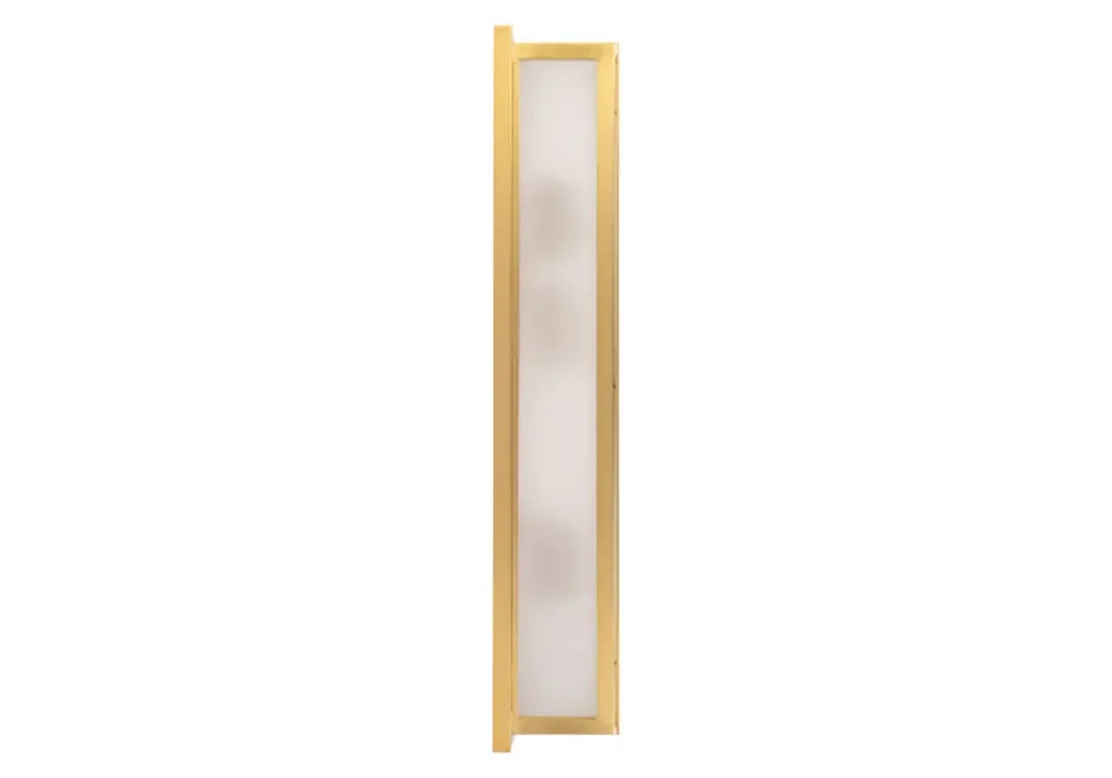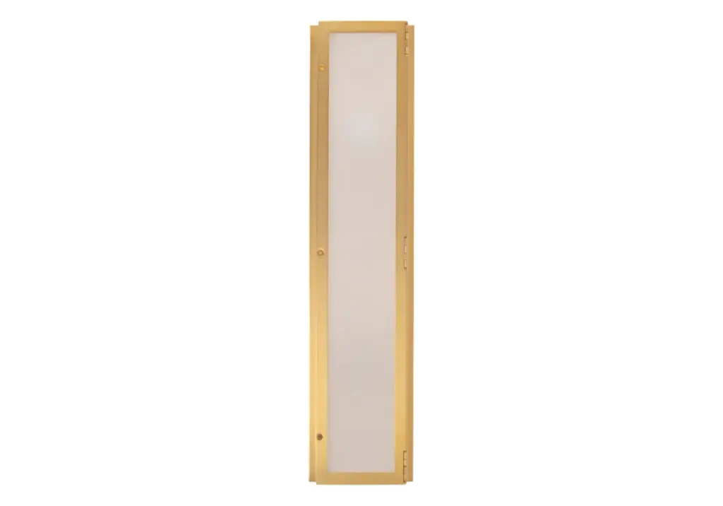 Timeless and stunning, the Waldorf showcases an elongated rectangular form with glass panels enclosed by a rich brass frame. Three hinges and three small nailheads provide an added accent, creating a subtle touch of dimension. Pair two together in an entryway or living room for an elevated design. Installation hardware included. Max Voltage: 110VMax Socket: LED 5WBulb: requires three E26 bulbs, not includedDimensions: 4.25" W | 5.25" D | 24" H