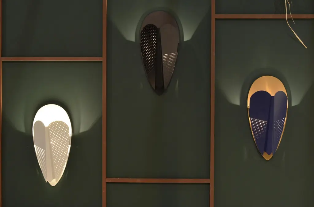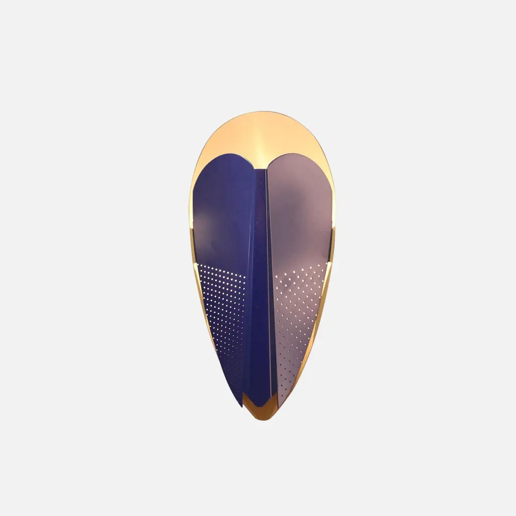 Wall lamp "Sorcier" - Marta BakowskiDimensions: 22 W x 9 D x 46.5 H cmMaterials: Painted metalDifferent colors are availableSorcier is a wall light inspired by the ritual Ngil masks of the Fang tribe in Gabon. The light diffuses through the perforations in the mask and shines upward in a graphic and gentle way. It changes personality depending on the combination of colors, textures and perforated patterns, which vary in each version.The designer spent a lot of time in Central Africa with the Fang who still are the main ethnic group in Guinea and spread across Gabon and Cameroon. She drew her inspiration from the ritual objects and the strong graphic identity before combining it to modern manufacturing to create this collection. More than a light, Sorcier is a sculpture.Marta Bakowski’s designs are a celebration of colors and materials, two predominating elements which are often the starting point of her projects. Her objects follow simple and graphical shapes with an Elementary functionality, thus leaving room for tactility and expressive qualities while encouraging imagination, interpretation and appropriation.By working with dualities and de-contextualisations, her designs are a game of oppositions, contrasts and hijacks. Thus, natural materials meet with technological ones, crafts flirt with Industry and Primitive inspirations transform into pop and modern translations.For the designer it is a matter of elaborating a language thanks to which objects acquire a function that goes beyong practicality. By creating links and strong evocations through the development of aesthetical values, her aim is to touch the ‘emotionnal’ and encourage relationships between users and object.