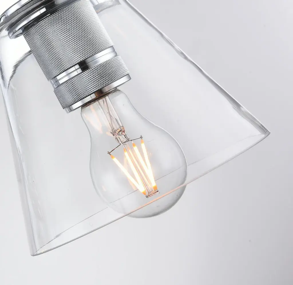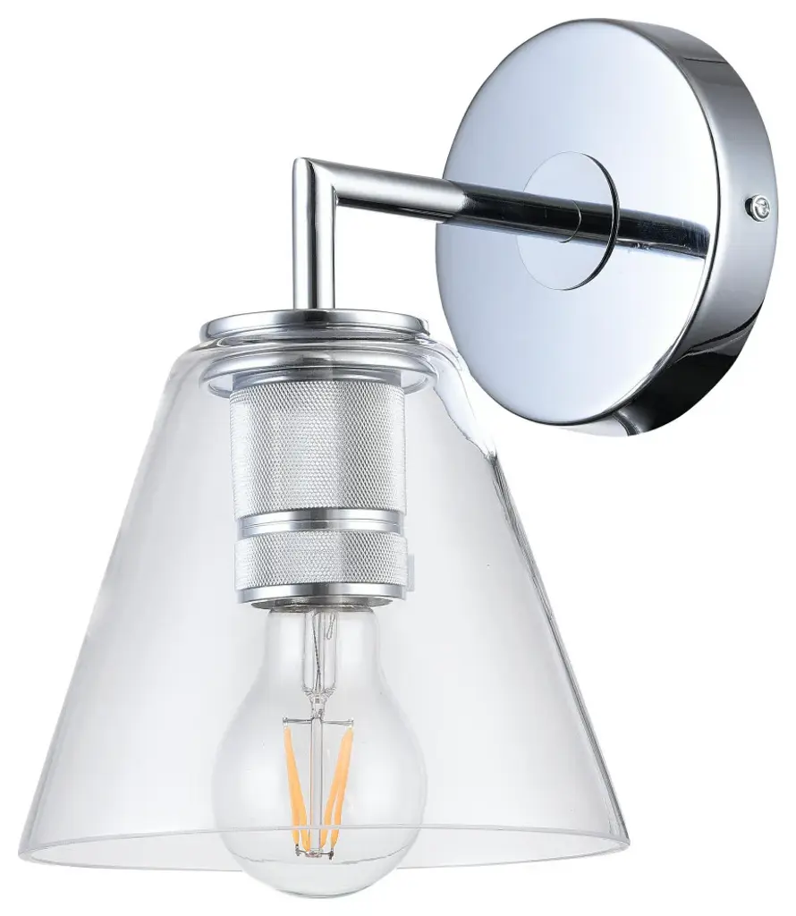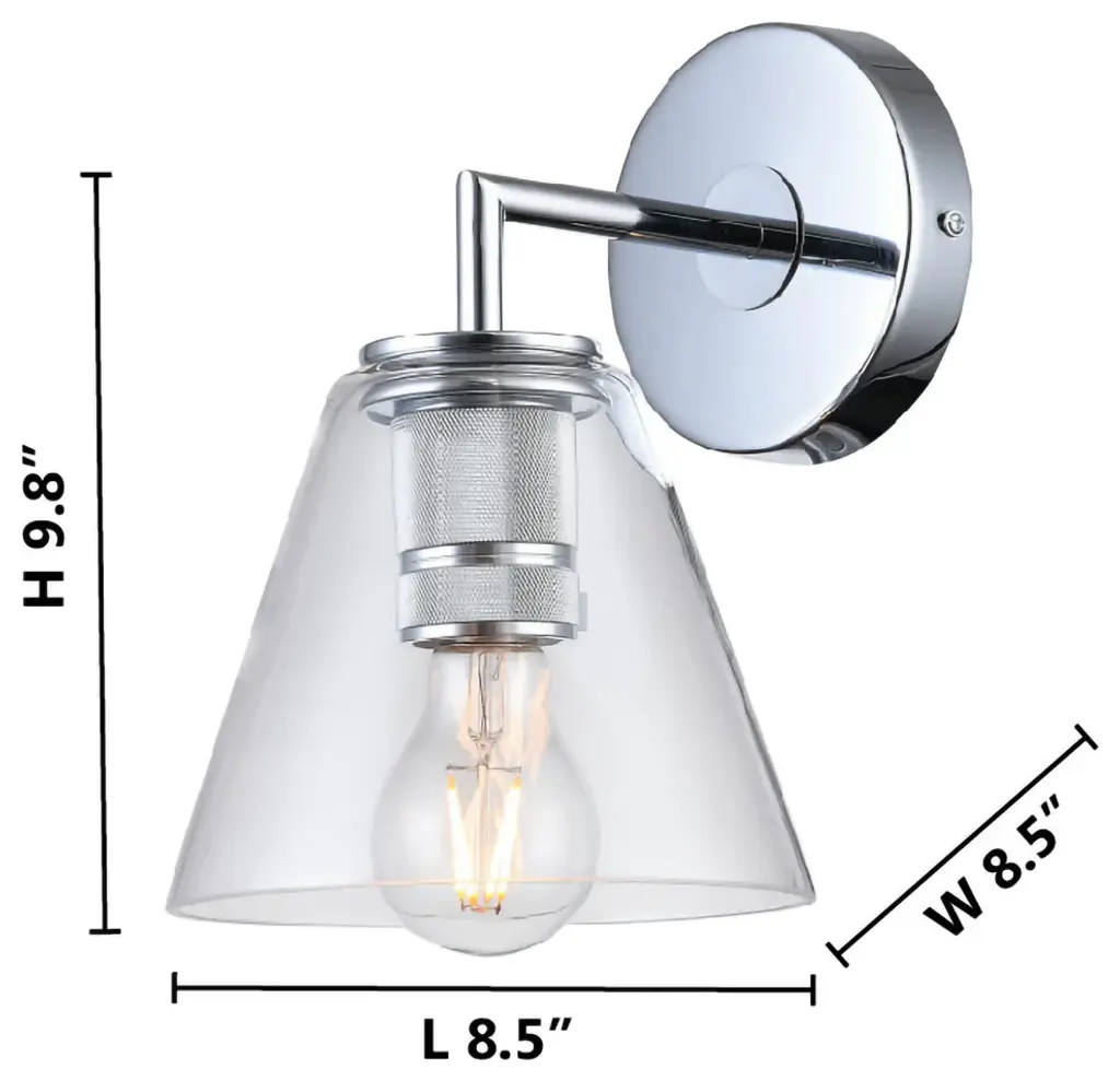 This exquisite wall sconce is in a chrome finish. The frame of this fixture is made out of metal. It comes with a glass cone shade in clear color. This modern fixture can be used in any rooms, hallway, bedroom and living room.Bulb(s) Included: NNumber of Bulbs: 1Bulb Type: E26Wattage: 60