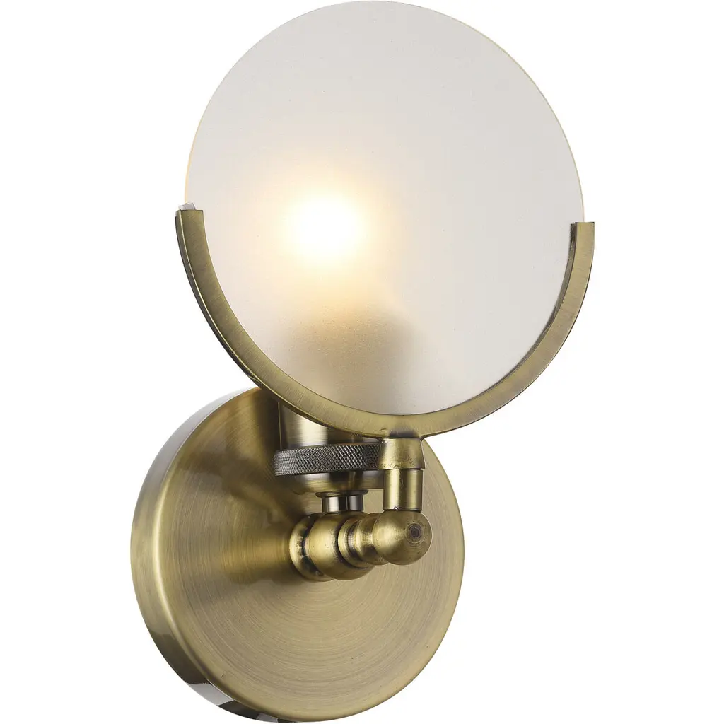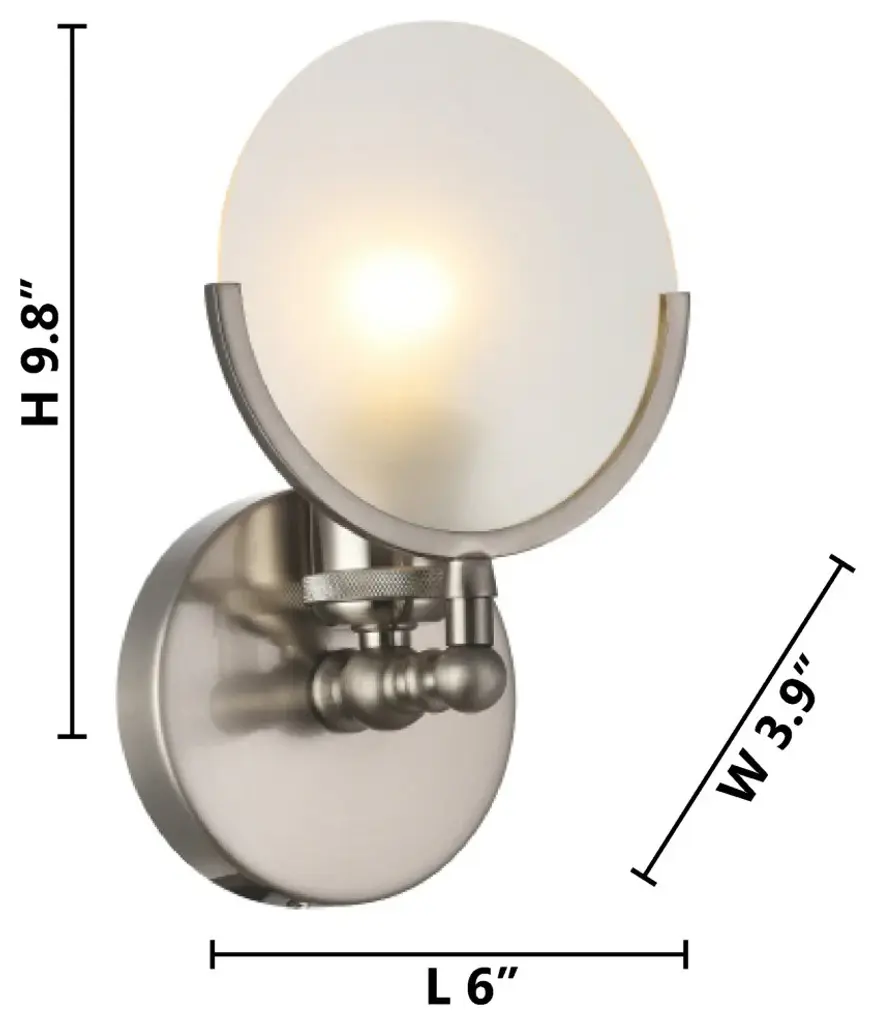 Elevate your space with this stunning nickel iron frame wall sconce! The round frosted glass shade adds a touch of elegance and sophistication, making it a perfect choice for bedrooms, hallways, and kitchens. This transitional design is versatile enough to fit in with a variety of decorating styles, and its brass iron frame adds a touch of warmth and coziness to any room. Whether you''re looking to add some ambiance to your bedroom, create a welcoming atmosphere in your hallway, or provide task lighting in your kitchen, this wall sconce is a great choice.Lighting Information:Bulb type: E26Max wattage: 40WNumber of bulbs: 1Bulb not includedBACK PLATE SIZE: D5" H1"ASSEMBLY REQUIRED: YESMATERIALS: METAL & GLASS